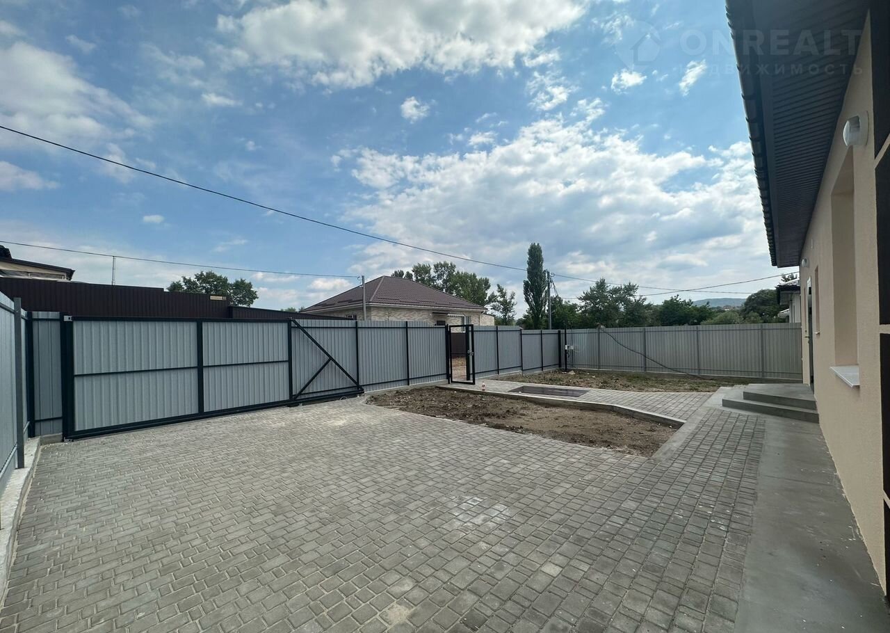 Во дворе тротуарная плитка, парковочное место под автомобиль, забор, ворота, калитка.