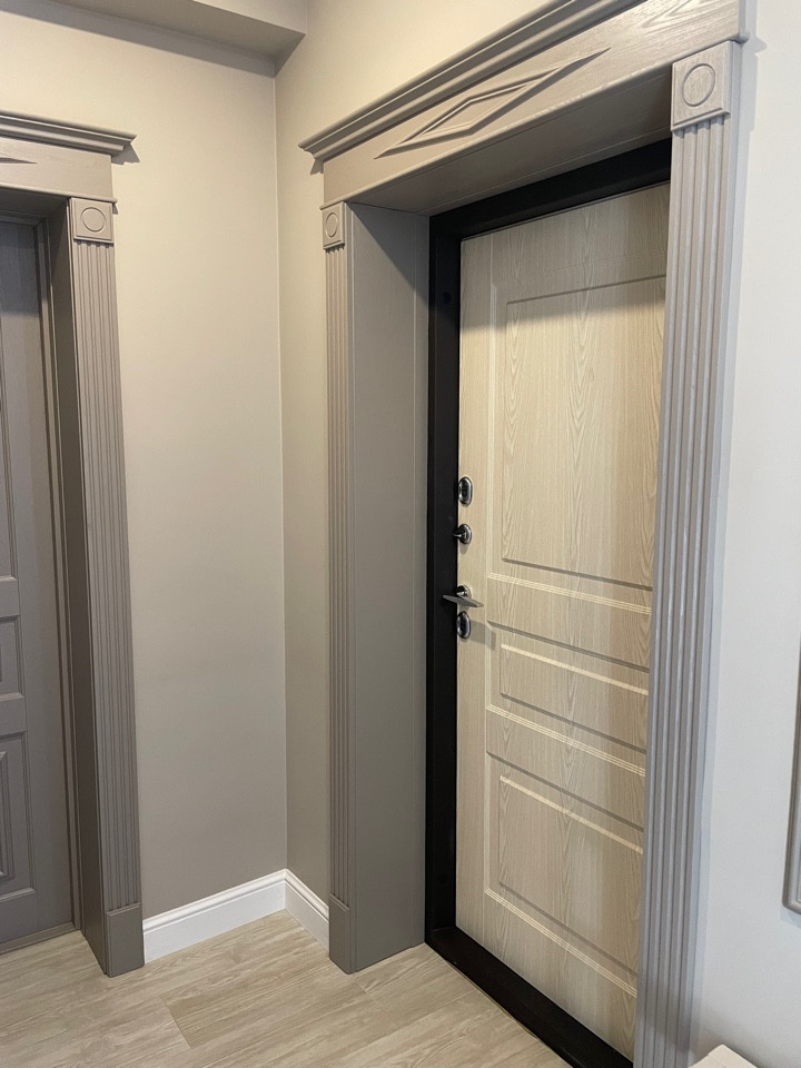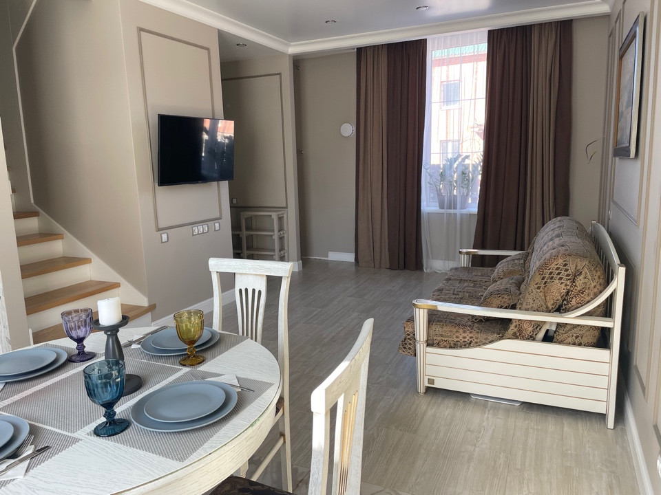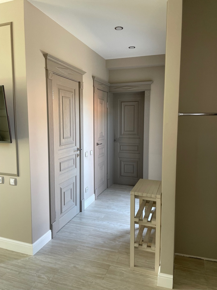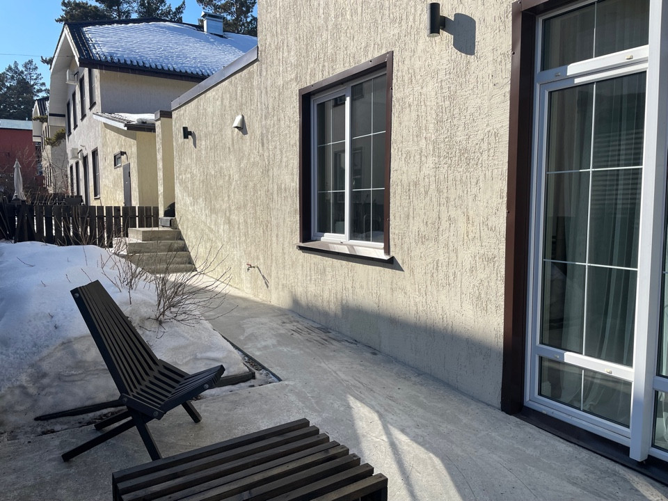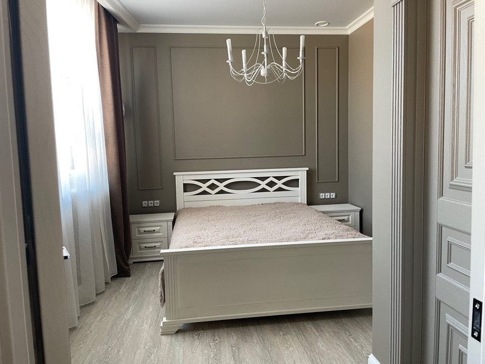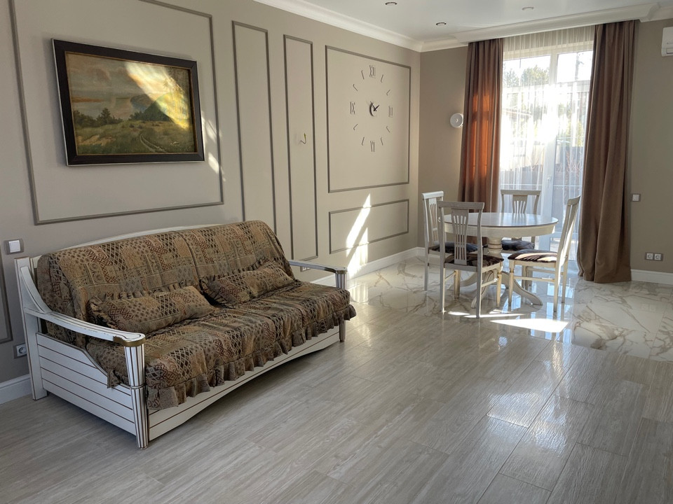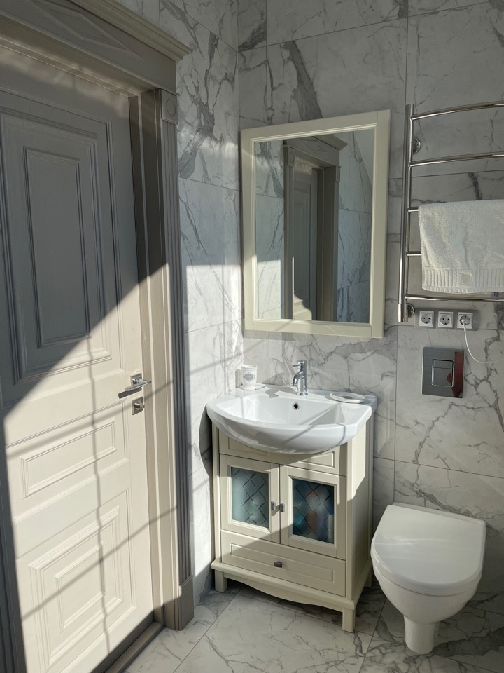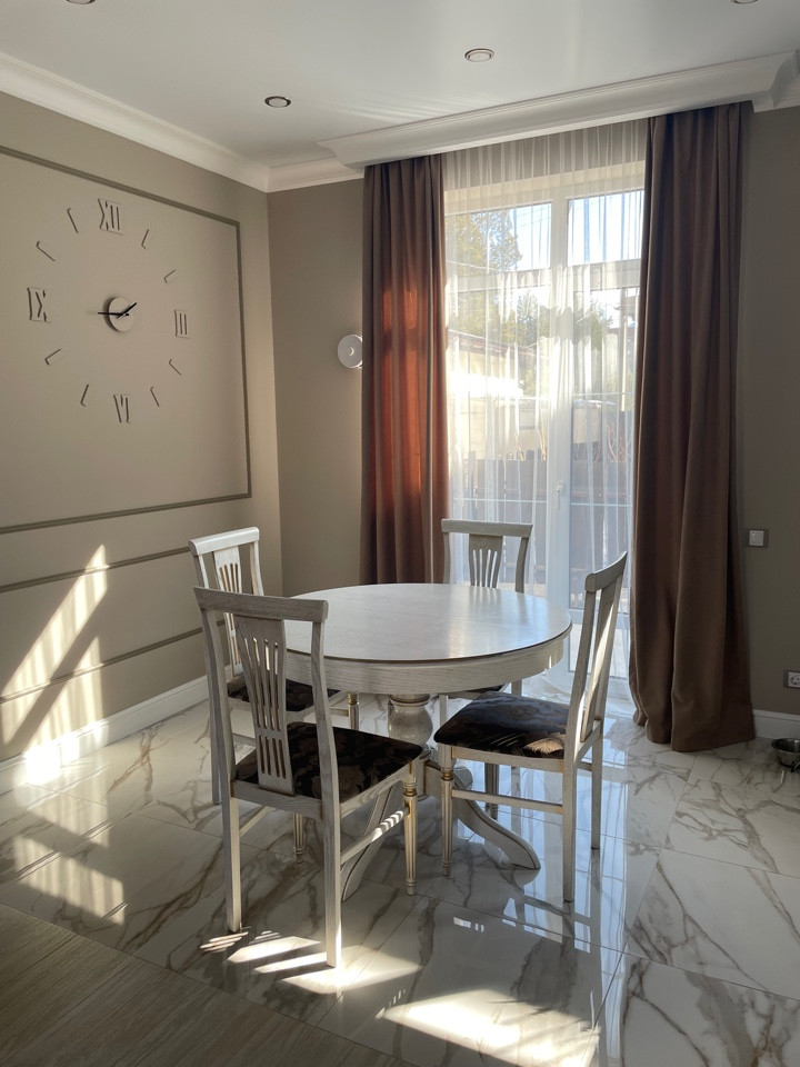 Внутренняя отделка дома:во всей части дома на полу керамогранит премиум-класса. Межкомнатные двери из массива дерева. Во всем доме установлены смешанные натяжные сатиновые потолки м потолки гвл. Стены выполнены в нейтральной цветовой гамме с дизайнерскими декоративными элементами, использована интерьерная краска BenjaminMoore и т.п. В санузлах, их два (на первом и втором жилых этажах) установлена современная сантехника.Дом оборудован мебелью премиум-класса,в самых приятных для глаза светлых оттенках,с анатомической мягкой мебелью.