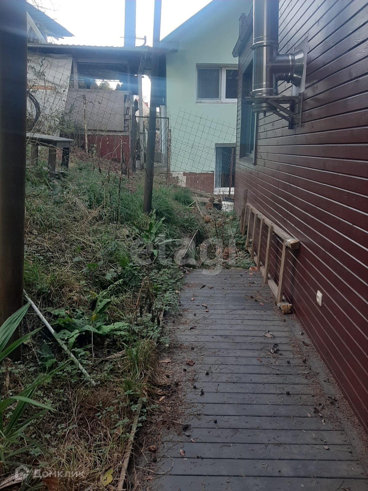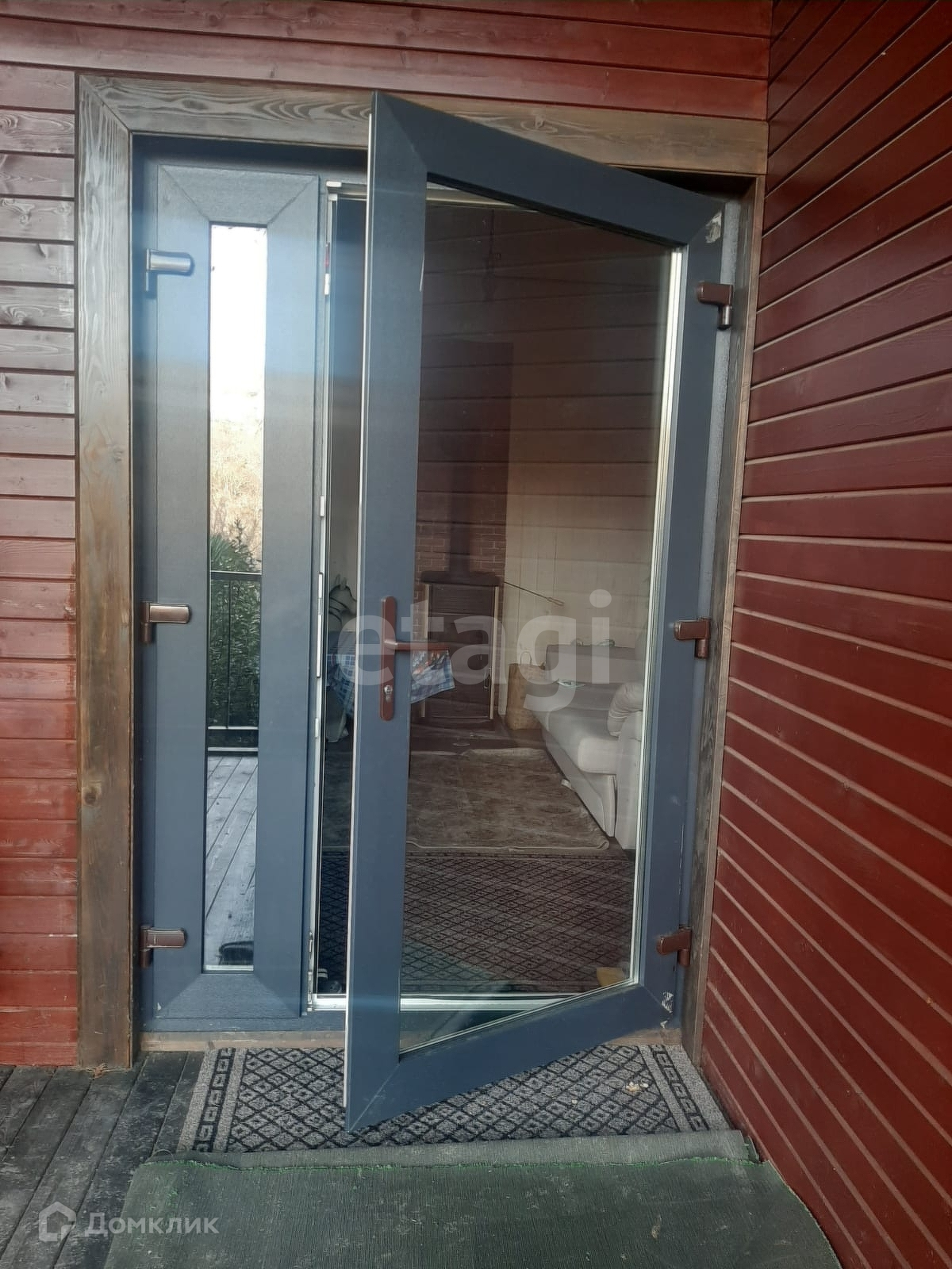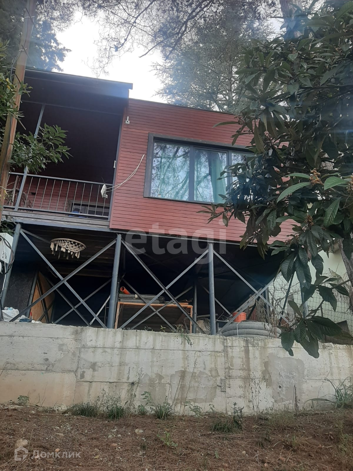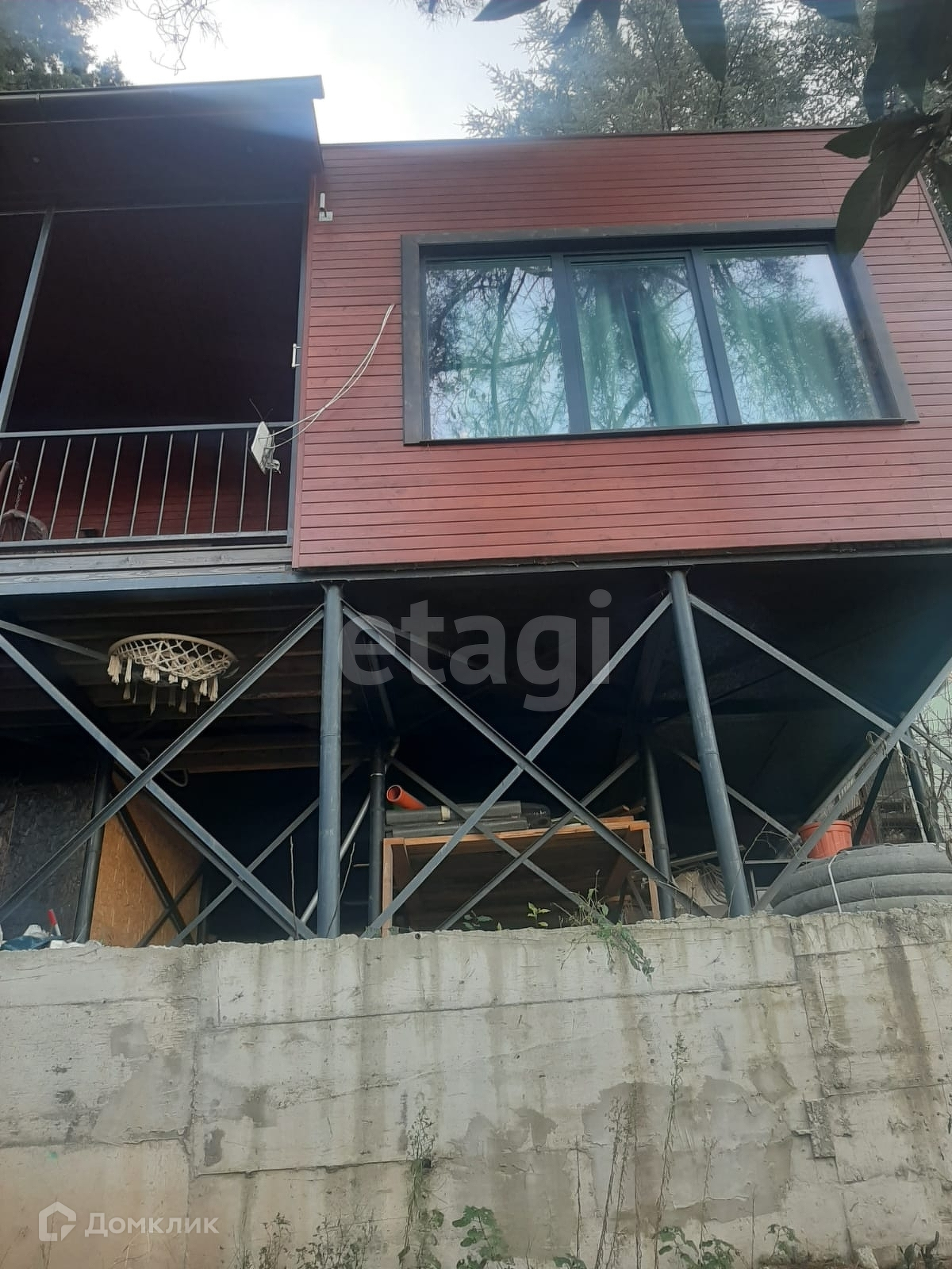 Дом выполнен по каркасной технологии, обшит лиственницей, стоит на хороших металлических сваях.