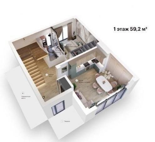 Планировка дома: 1 этаж прихожая, кухня, сауна, душевая, туалет, кладовая, закрытая и открытая террасы; 2 этаж: зал с камином; комната ,3 этаж- 2 спальни и лоджия