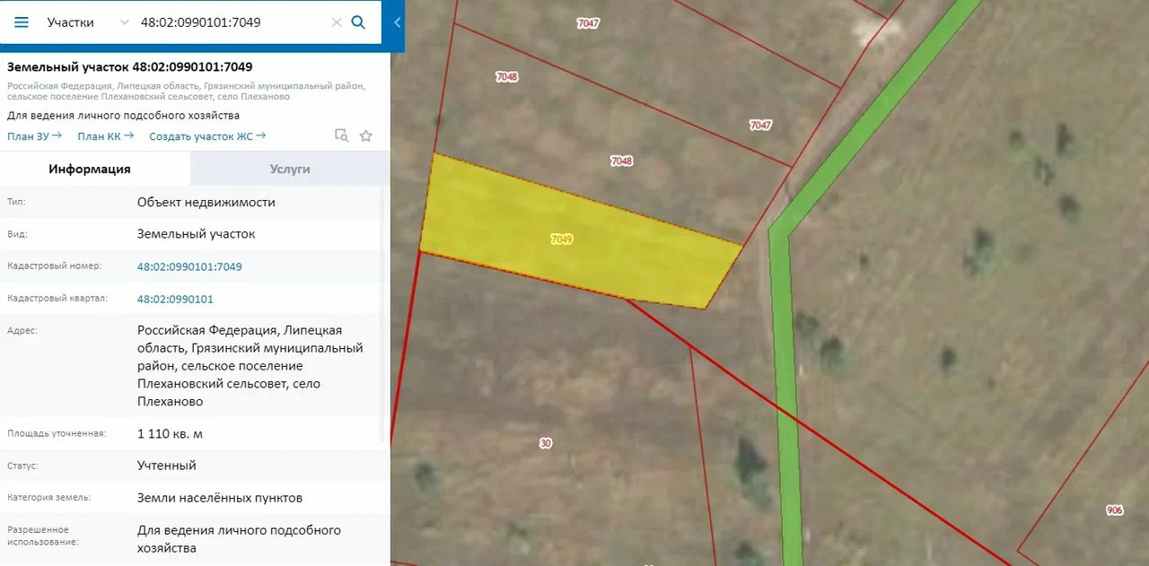 Продаётся земельный участок по адресу: Липецкая область Грязинский муниципальный район, сельское поселение Плехановский сельсовет, село Плеханово, площадью 1110 кв.м,                                         с кадастровым номером 48:02:0990101:7049, с разрешенным видом использования:                                         для ведения личного подсобного хозяйства, строительство возможно.