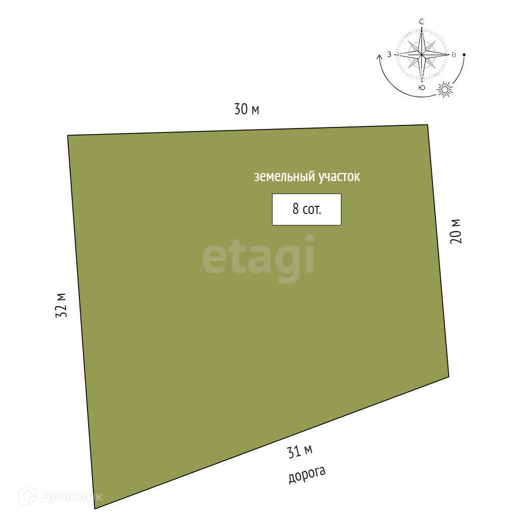 Участок ИЖС 8 соток. Размеры участка 30-32 м. в длину и 30 м. в ширину. Почти квадратной формы.