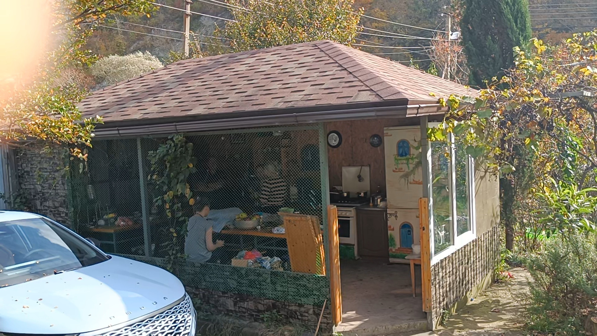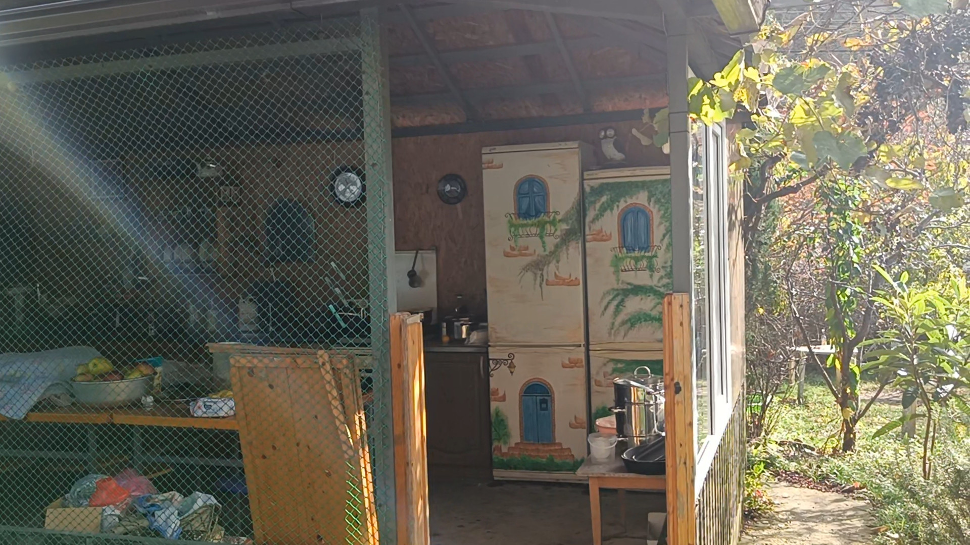 - палатка для летнего сна (установлена на фундаменте с металлоконструкциями и обшита поликарбонатом, с 2мя каркасными раскладушками внутри)