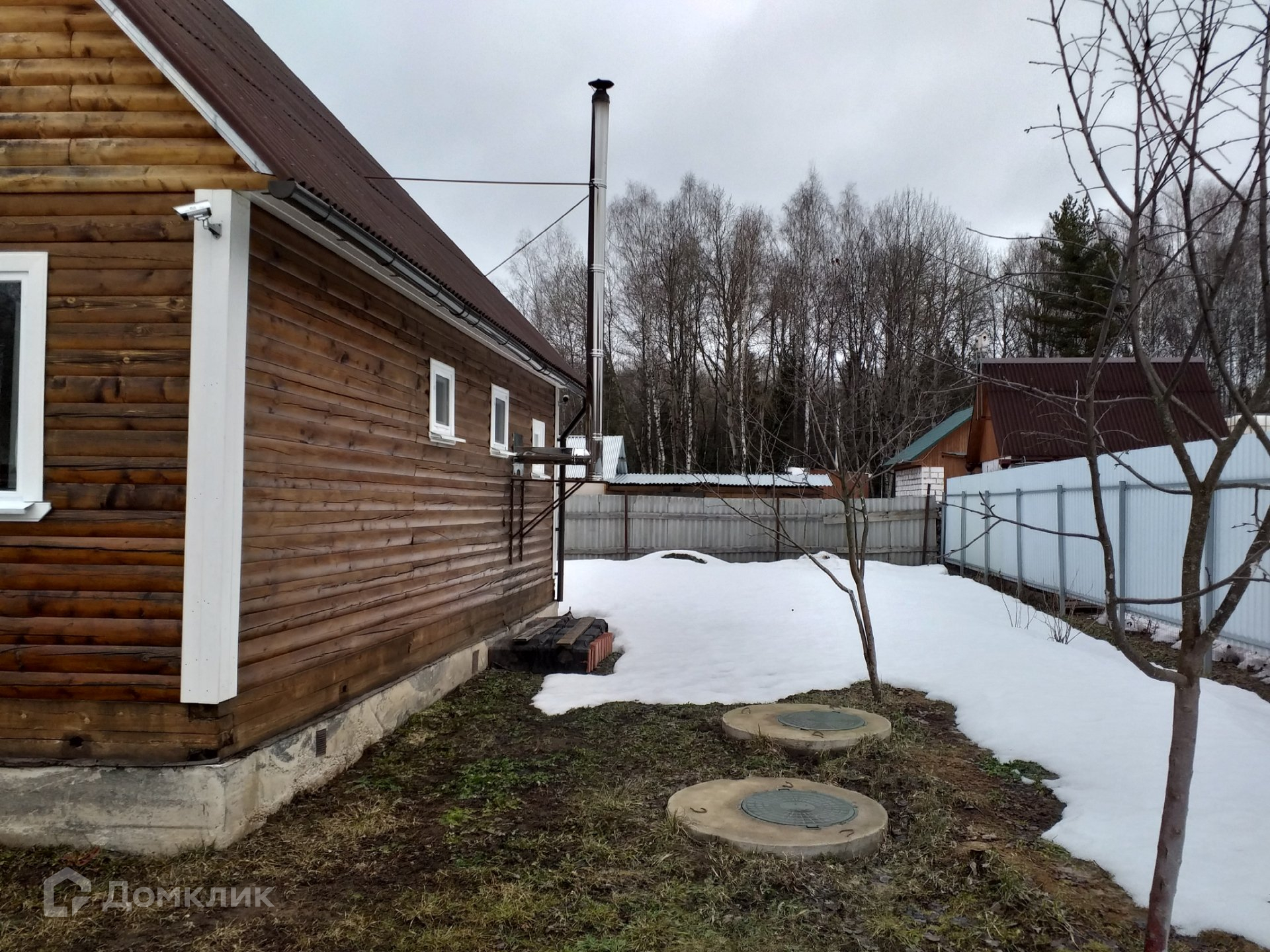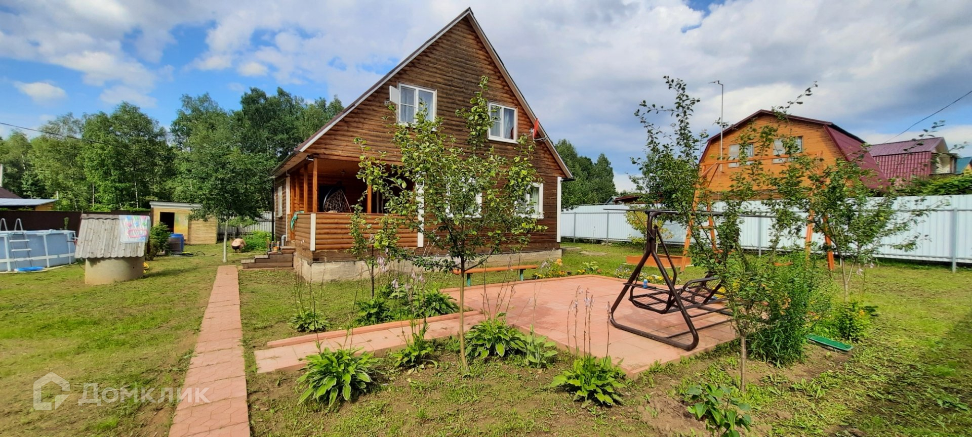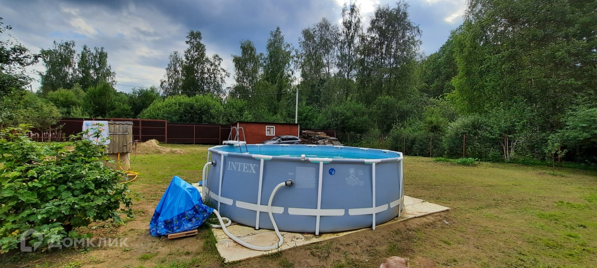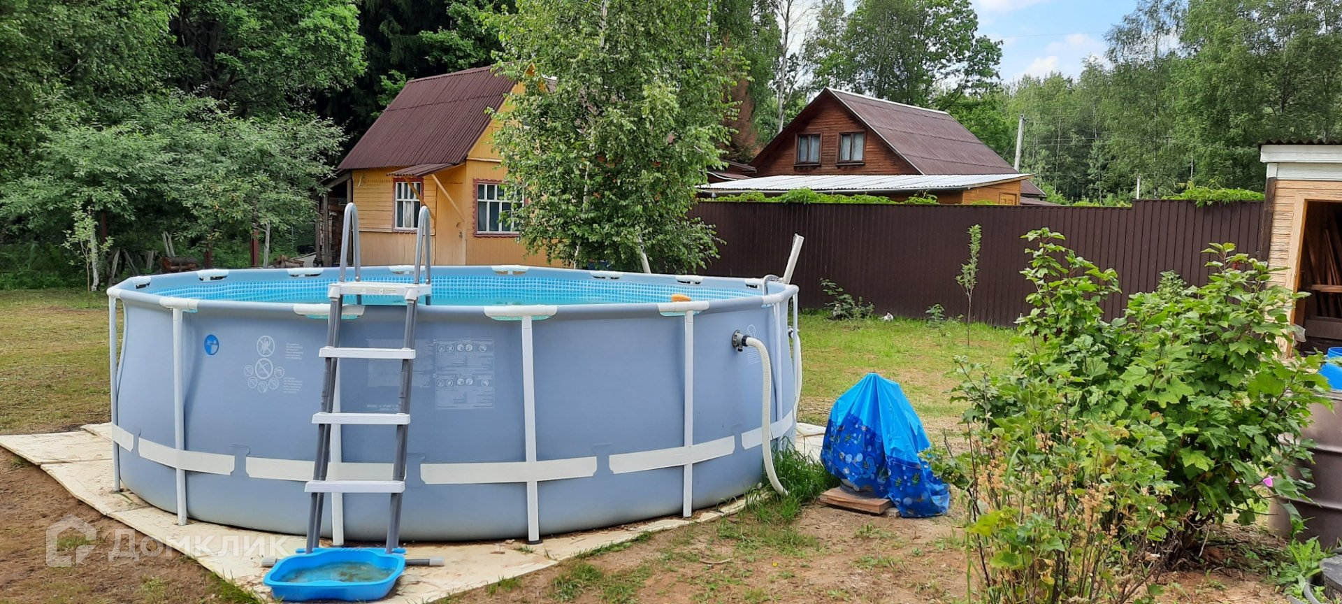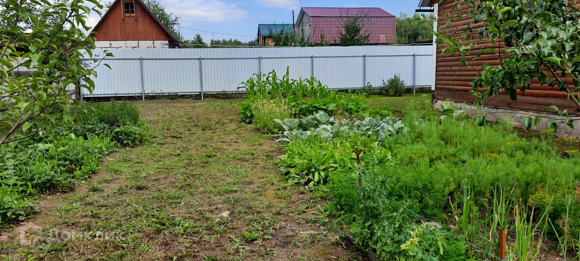 Участок ъ огорожен профлистом и сеткой рабицей. Есть площадка, качели, песочница, мастерская и хозпостройки.