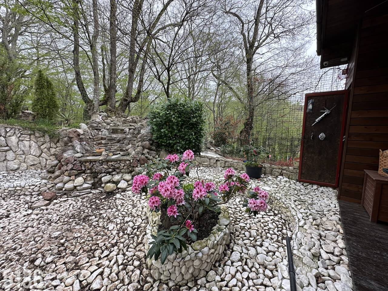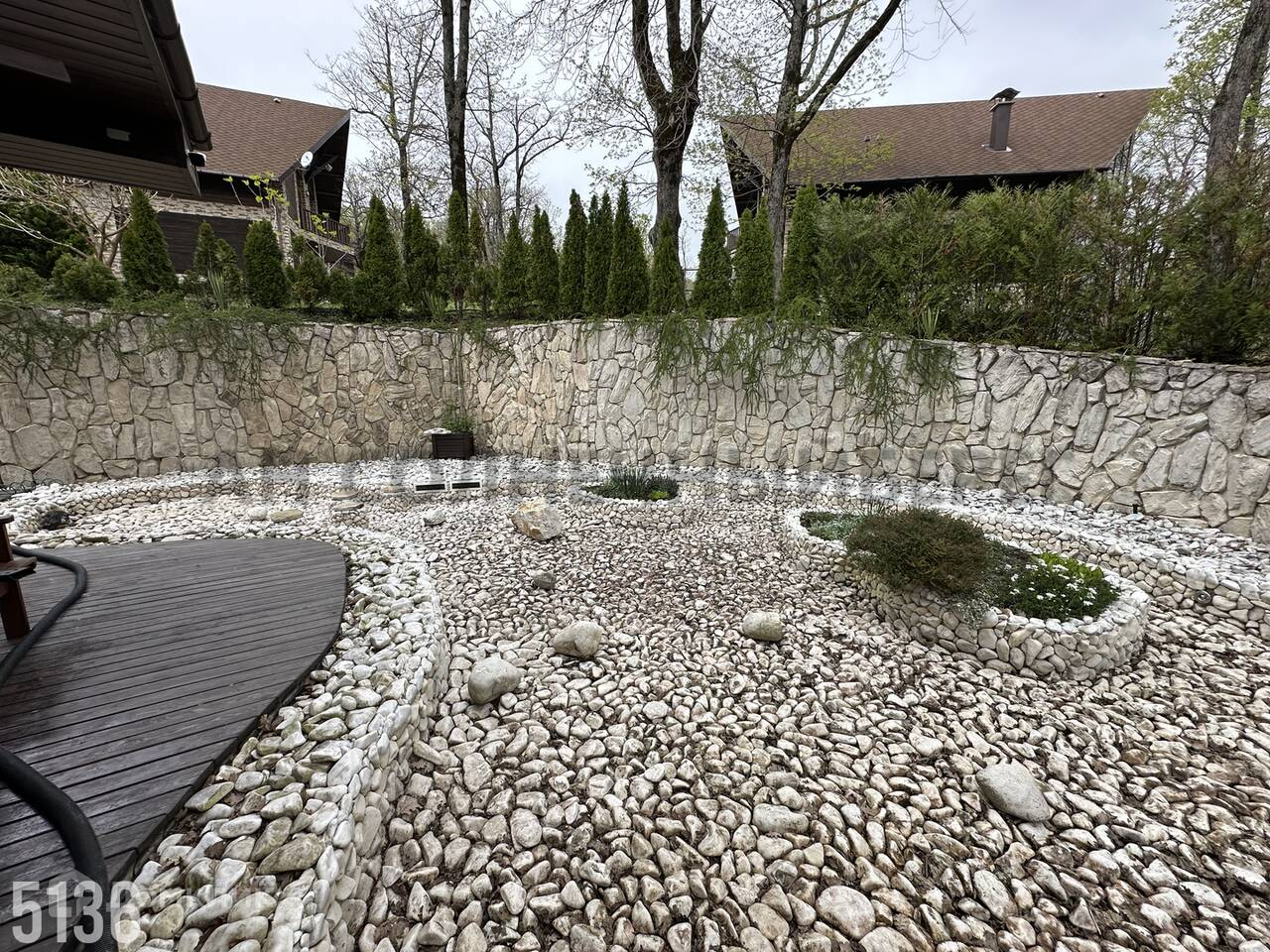 Территория возле таунхауса облагорожена, посажены плодовые и декоративные растения, пруд, веранда.