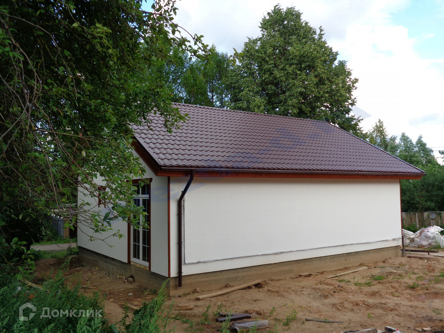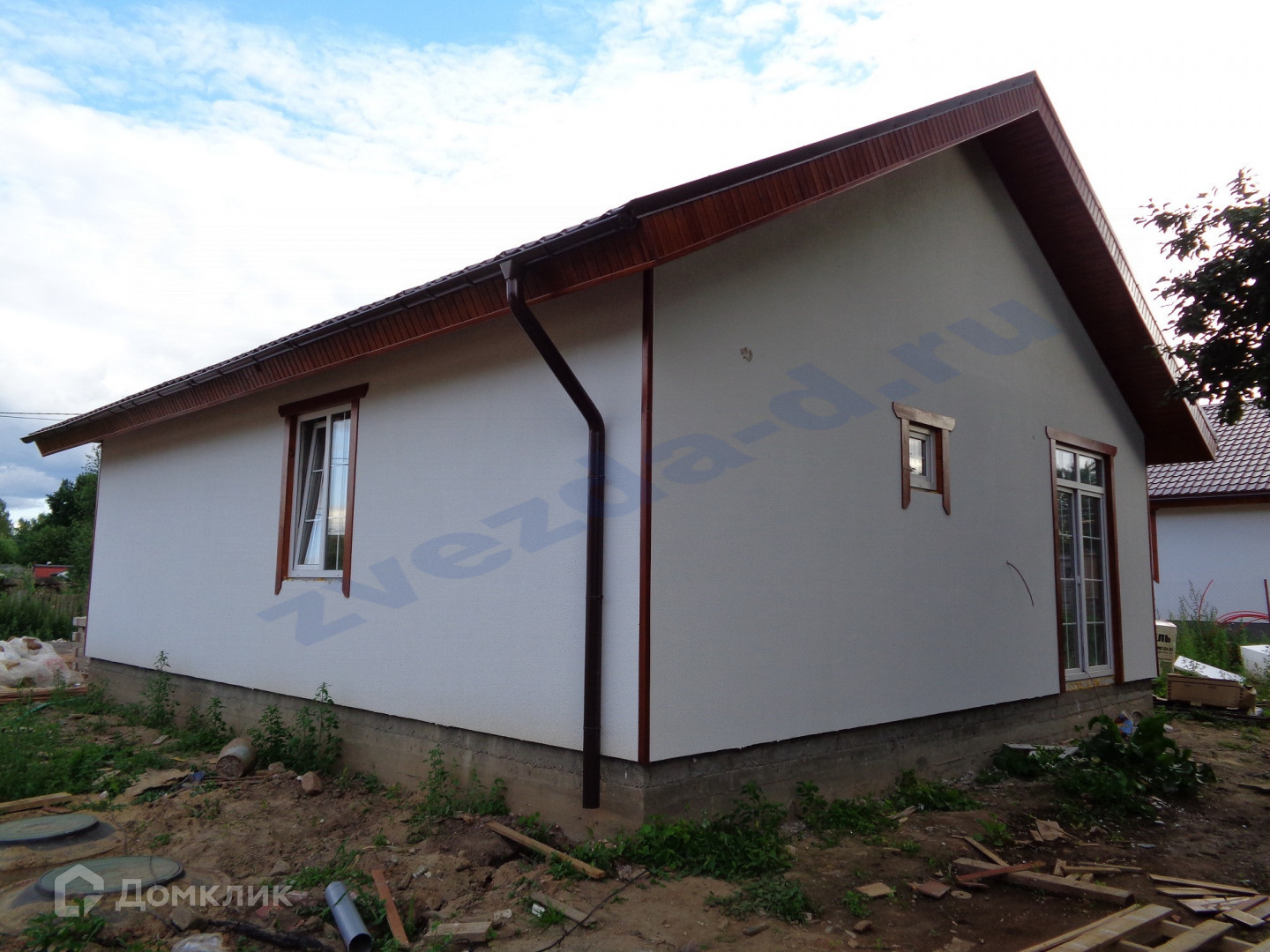 Дом одноэтажный на ленточном фундаменте с монолитной плитой. Стены из газосиликатных блоков, снаружи утеплены и отделаны декоративной фасадной штукатуркой. Кровля - металлочерепица с водосточной системой. Окна ПВХ, металлическая входная дверь.