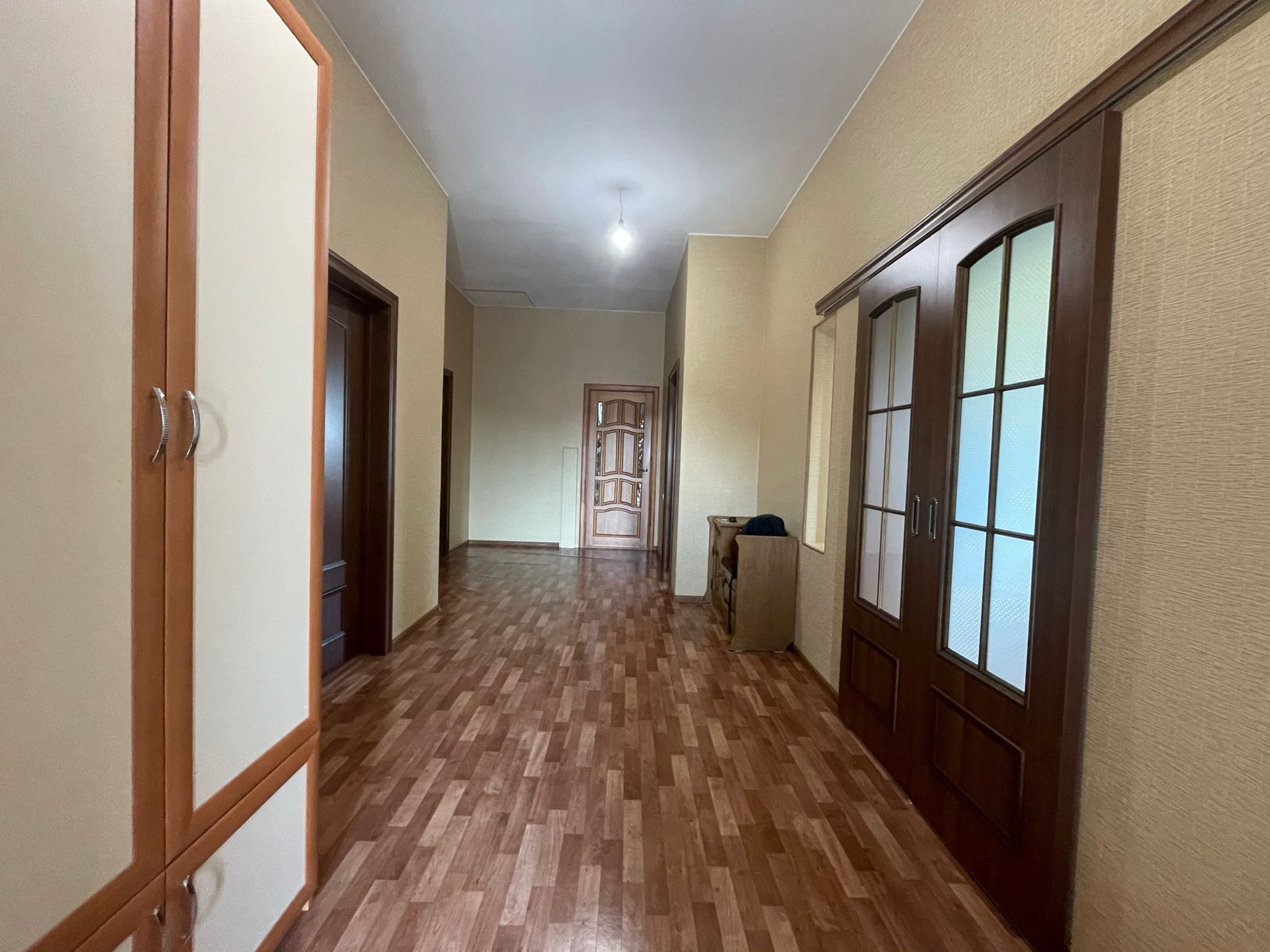 Первый этаж жилой, сделан качественный ремонт. Здесь располагаются две спальни, просторный сан. узел и кухня-гостиная. Установлена качественная входная дверь, Дом построен из керамзитоблока ( в евроблок 30 см.) + утеплитель 10 см.+ облицовочный кирпич. Крыша из металлочерепицы. Фундамент монолитный. Установлены качественные окна.