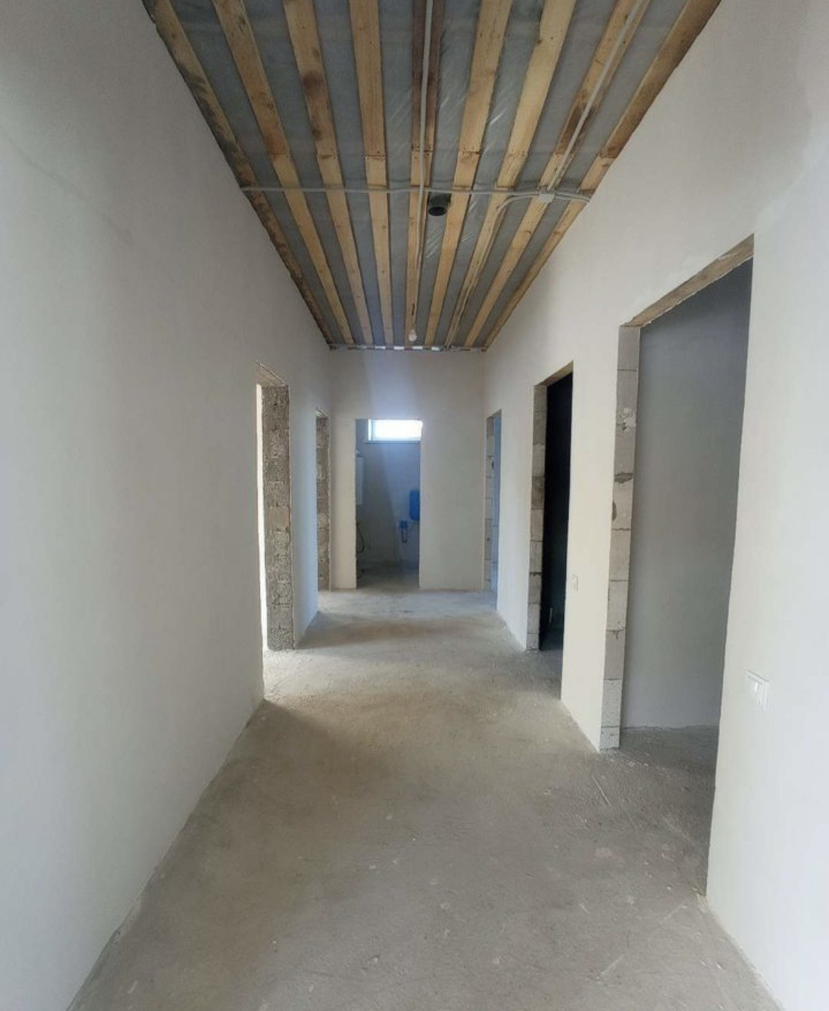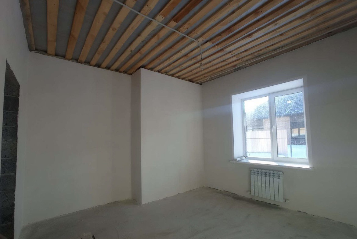 Стены оштукатурены и отшпаклёваны, выровнены по маякам, подготовлены к поклейке обоев, стяжка пола, электричество по ГОСТу, надежная входная дверь, установлен двухконтурный газовый котел.