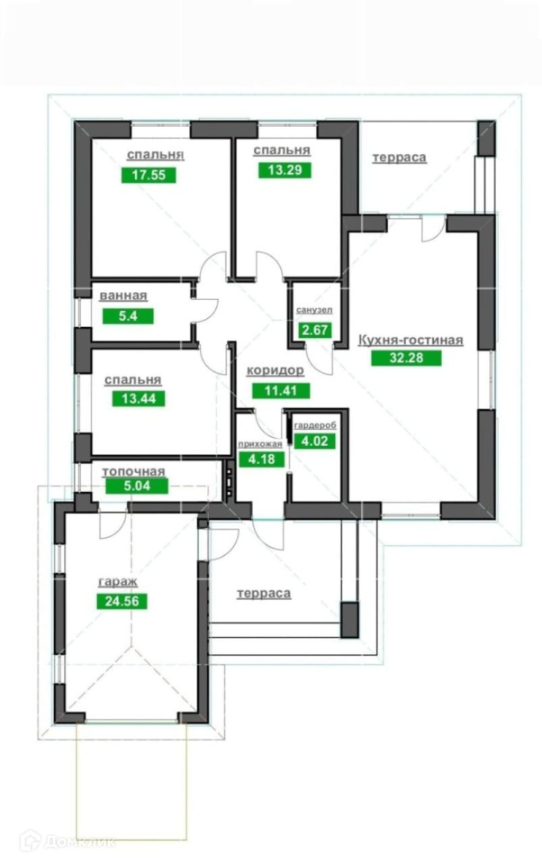 Продуманная планировка: три спальни, кухня-гостиная с выходом на террасу, 2 санузла, гардеробная, гараж.