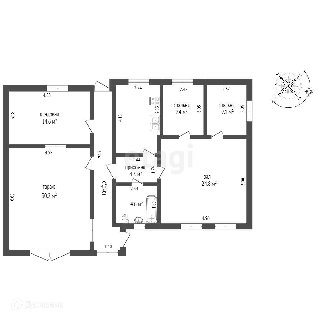 Дом состоит из гаража с тамбуром, коридора, прихожей, большой кухни 11,4 м2, две отдельные спальные комнаты и большая гостиная комната 24,8 м2. Санузел в доме!Также имеется глубокий сухой погреб!
