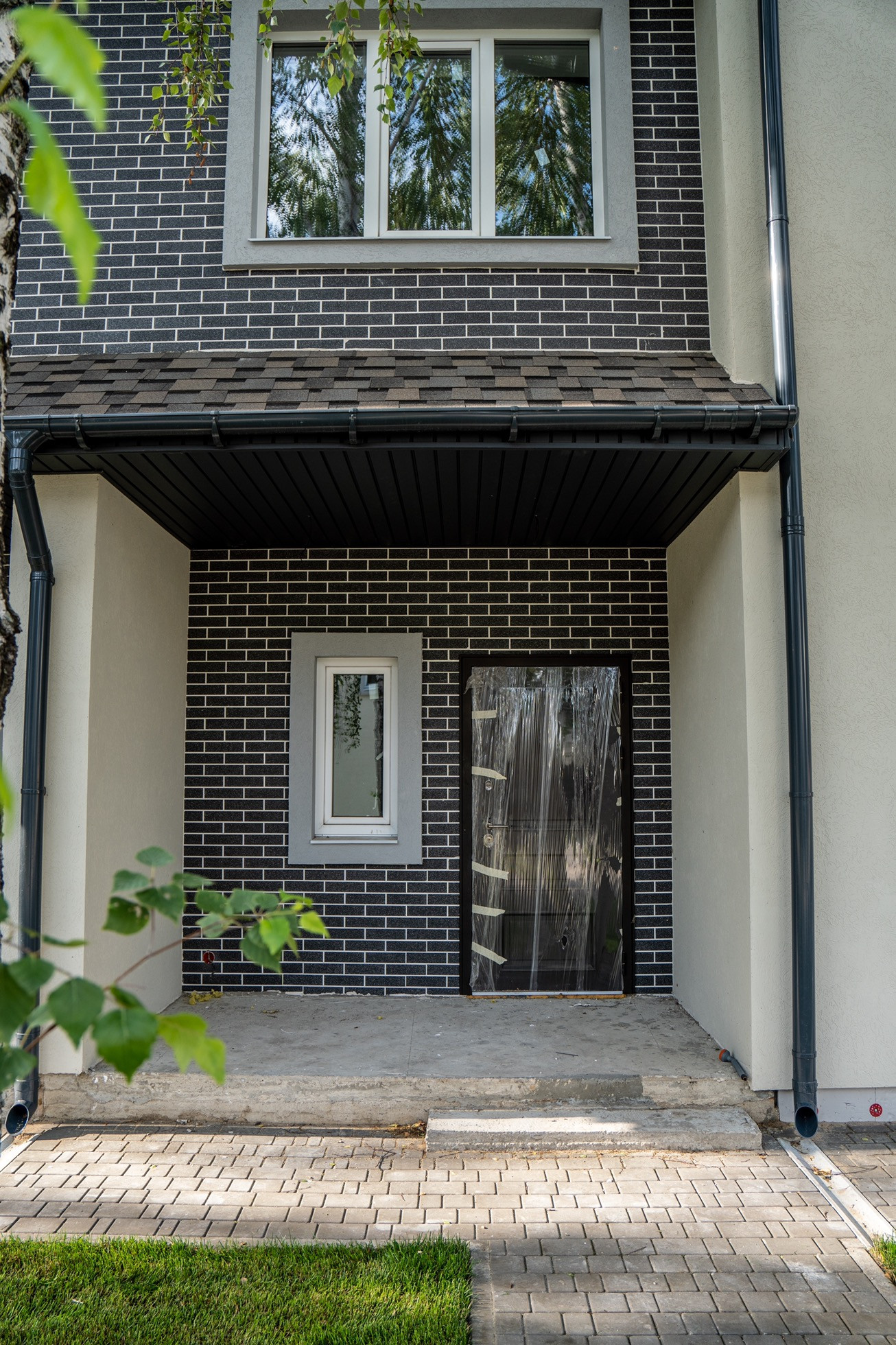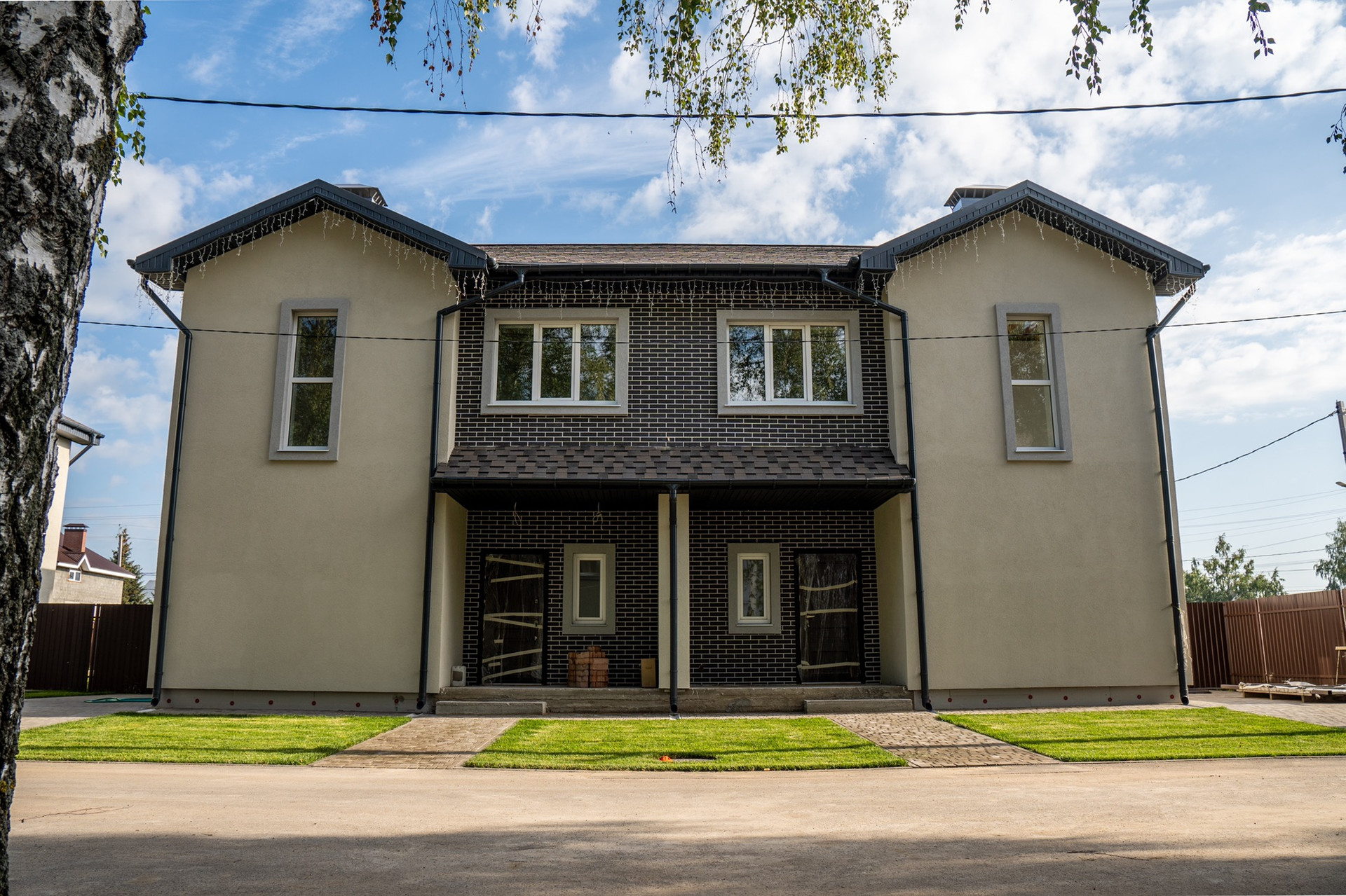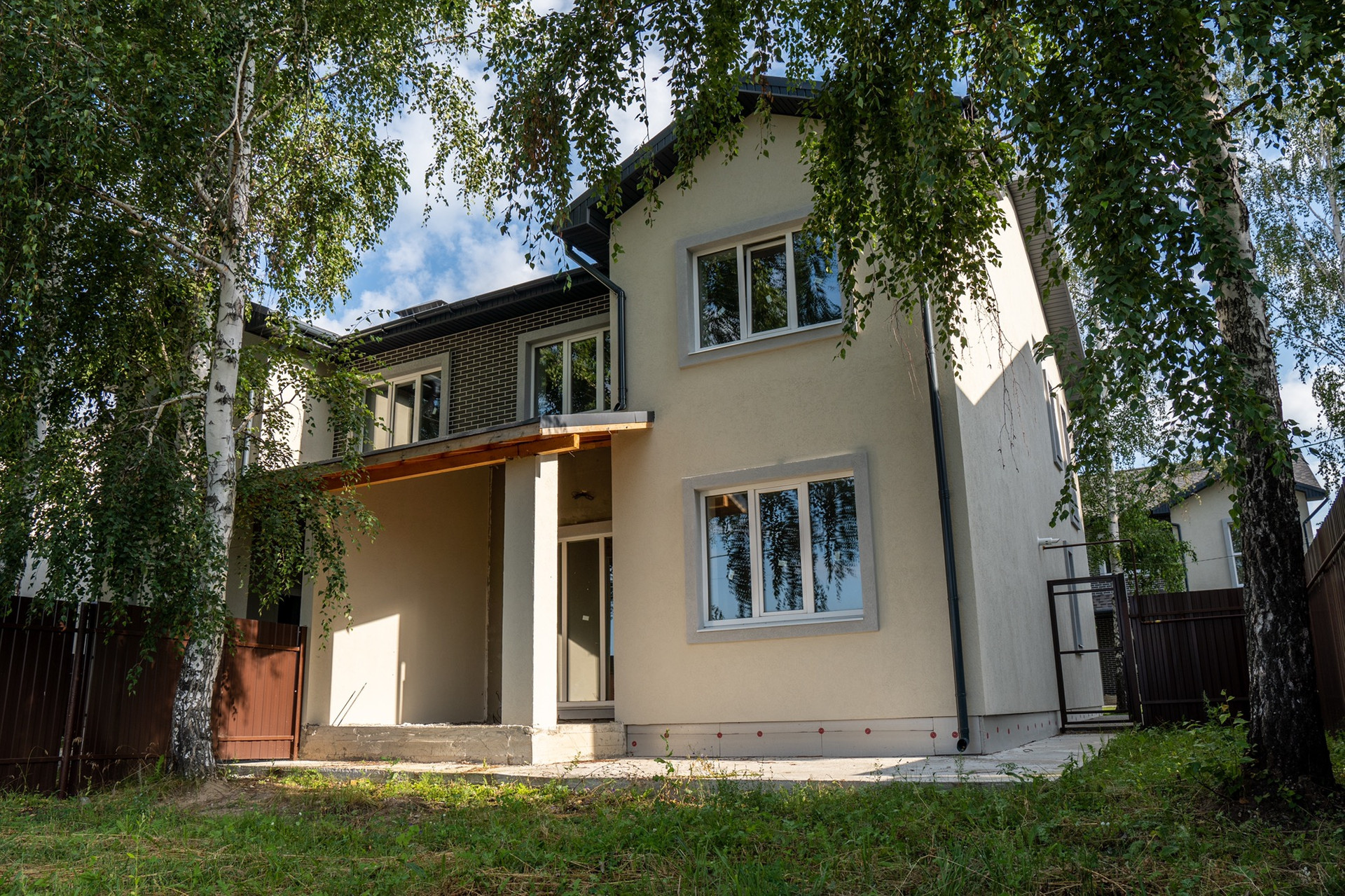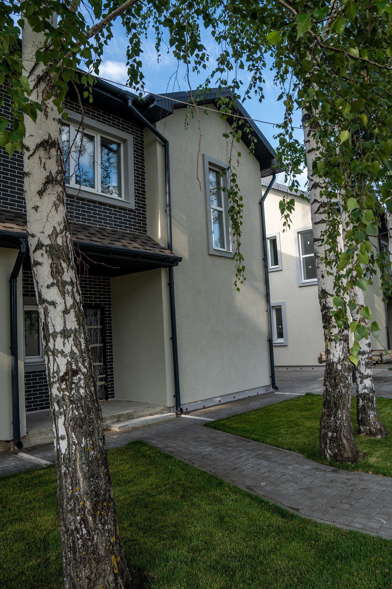 Дома 2-х этажные из двух секций ( дуплекс по 132 Метра каждый )+ 3- й мансардный , с просторной верандой и крыльцом. Каждый дом-блок расположен на собственном участке площадью 350 метров .