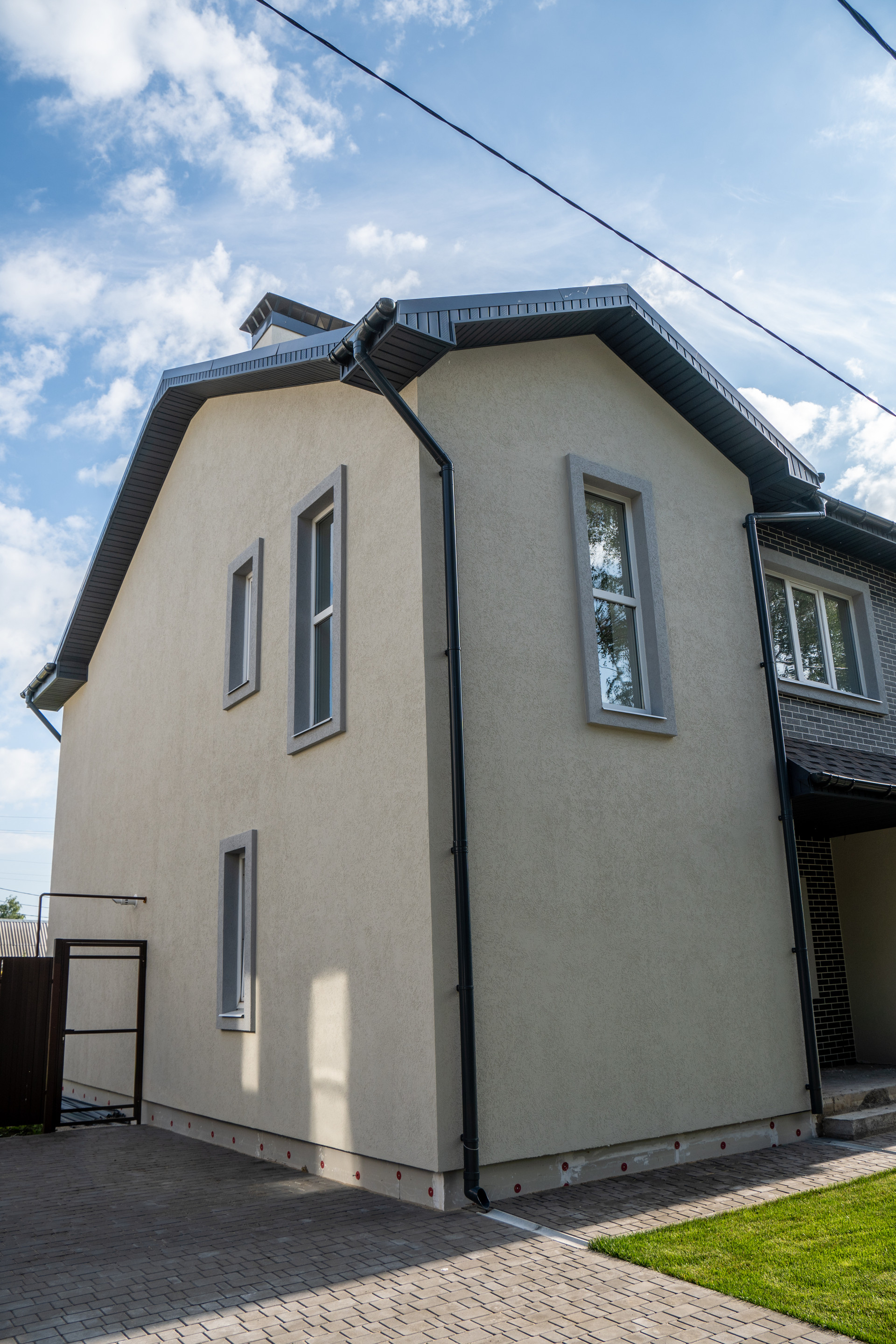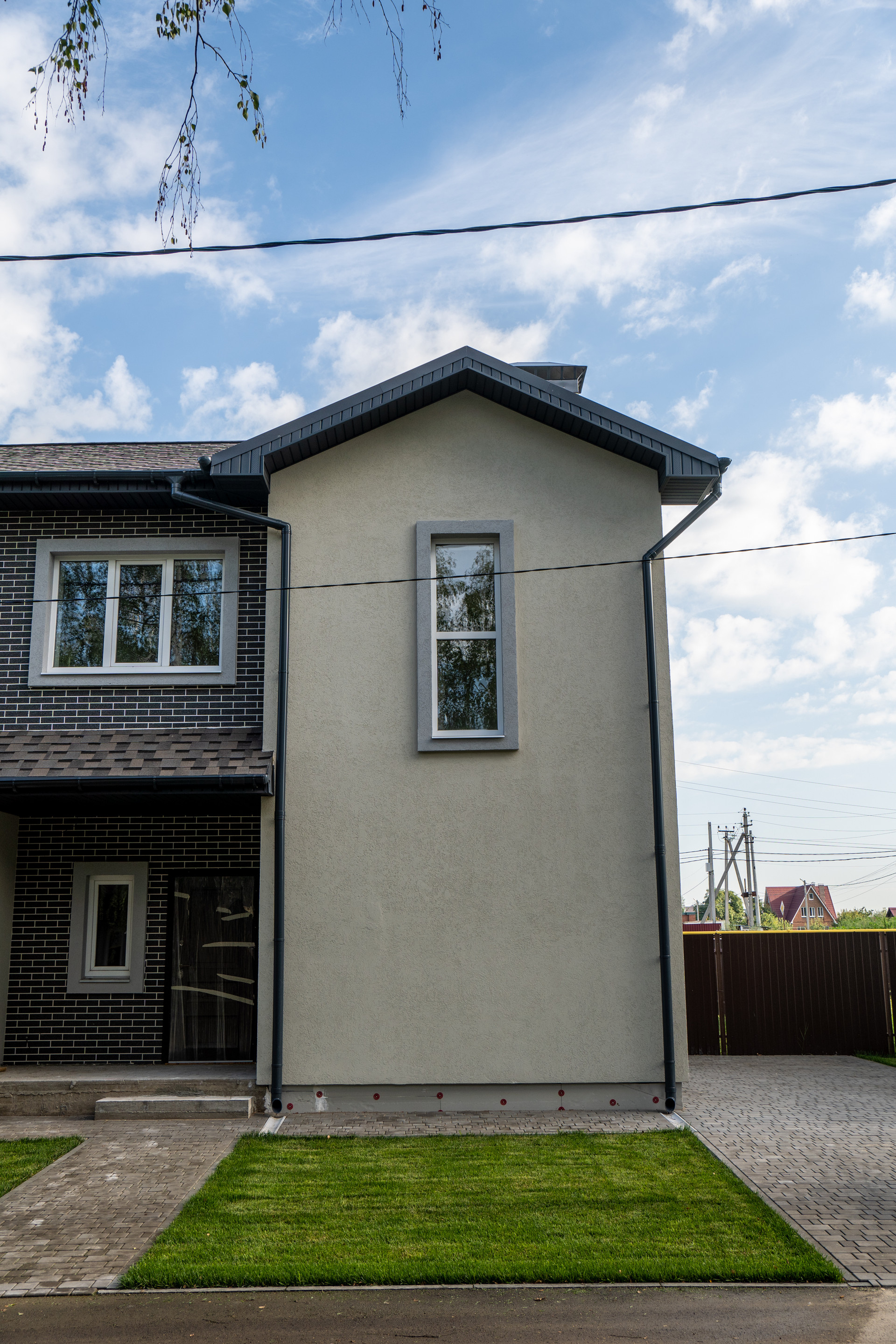 Дома 2-х этажные из двух секций ( дуплекс по 132 Метра каждый )+ 3- й мансардный , с просторной верандой и крыльцом. Каждый дом-блок расположен на собственном участке площадью 350 метров .