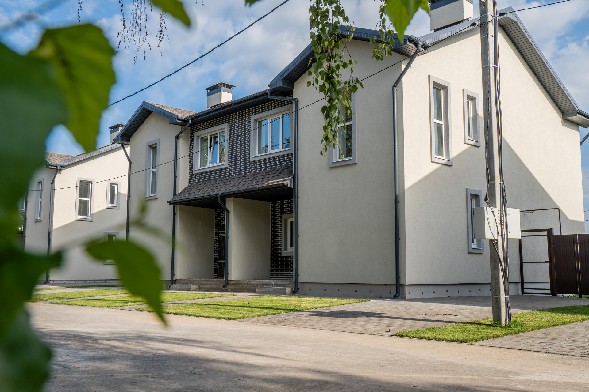 Дома 2-х этажные из двух секций ( дуплекс по 132 Метра каждый )+ 3- й мансардный , с просторной верандой и крыльцом. Каждый дом-блок расположен на собственном участке площадью 350 метров .