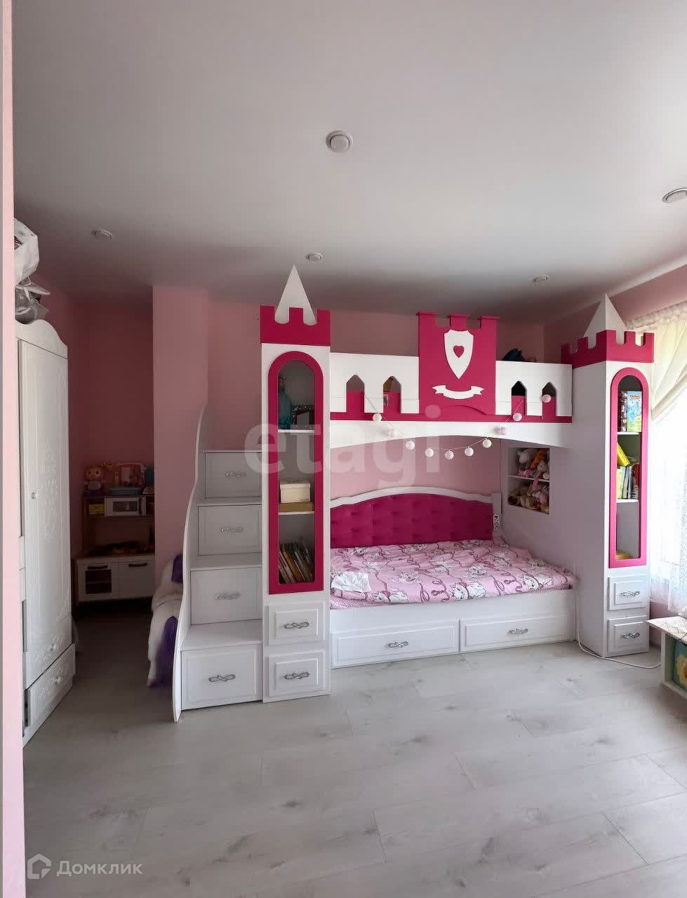 В детской сделана двухэтажная детская комната. При желании можно разместить дополнительное спальное место или оставить под игровую зону.