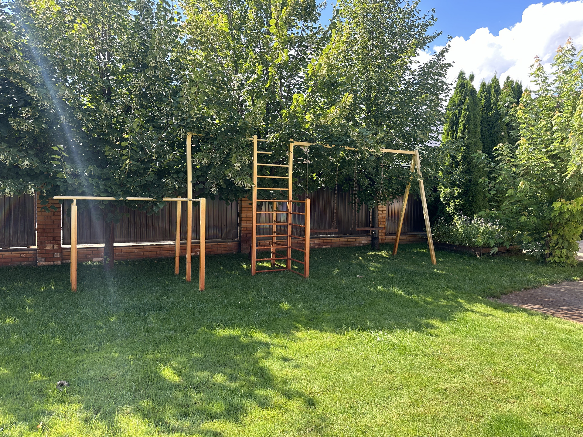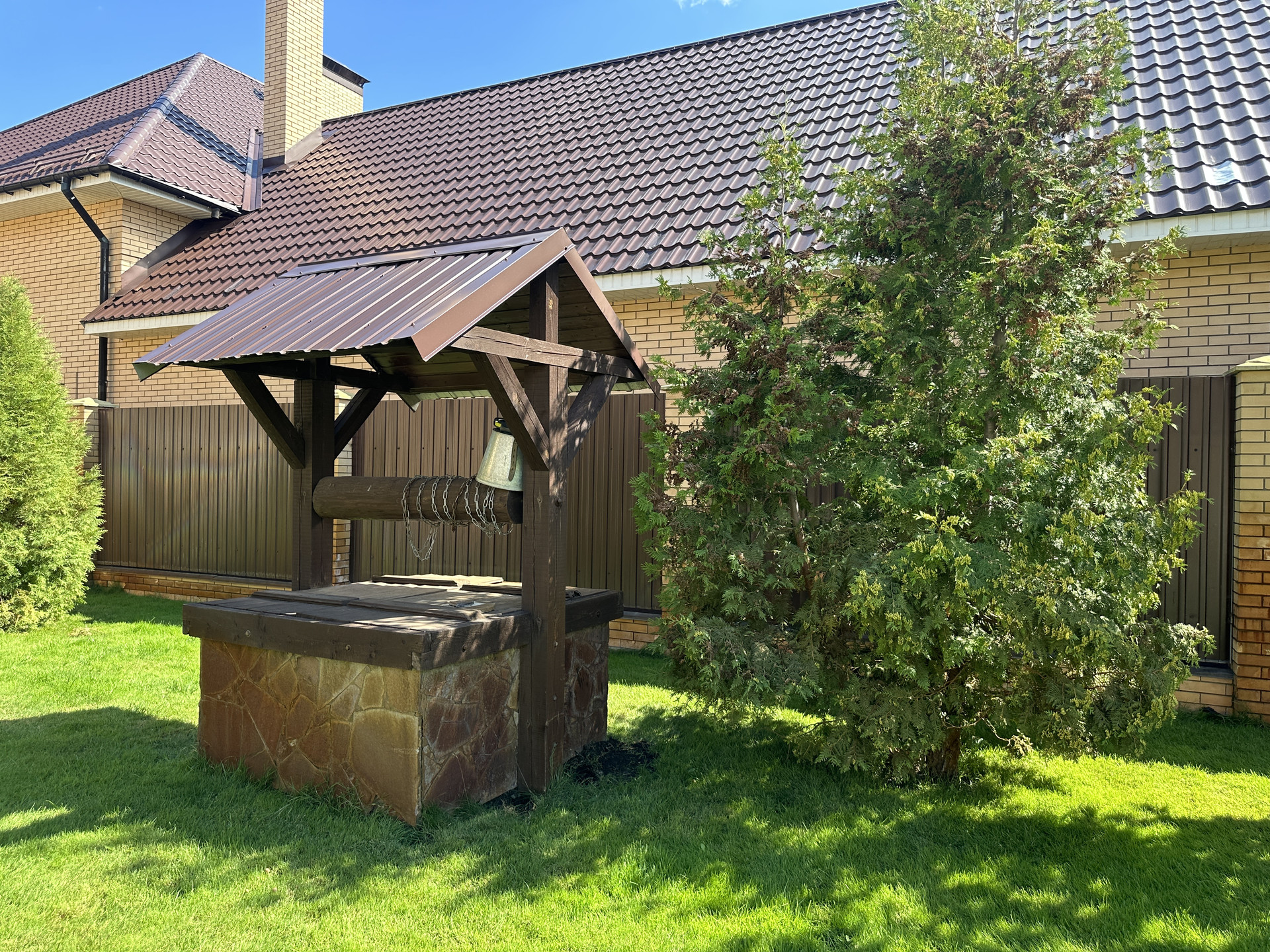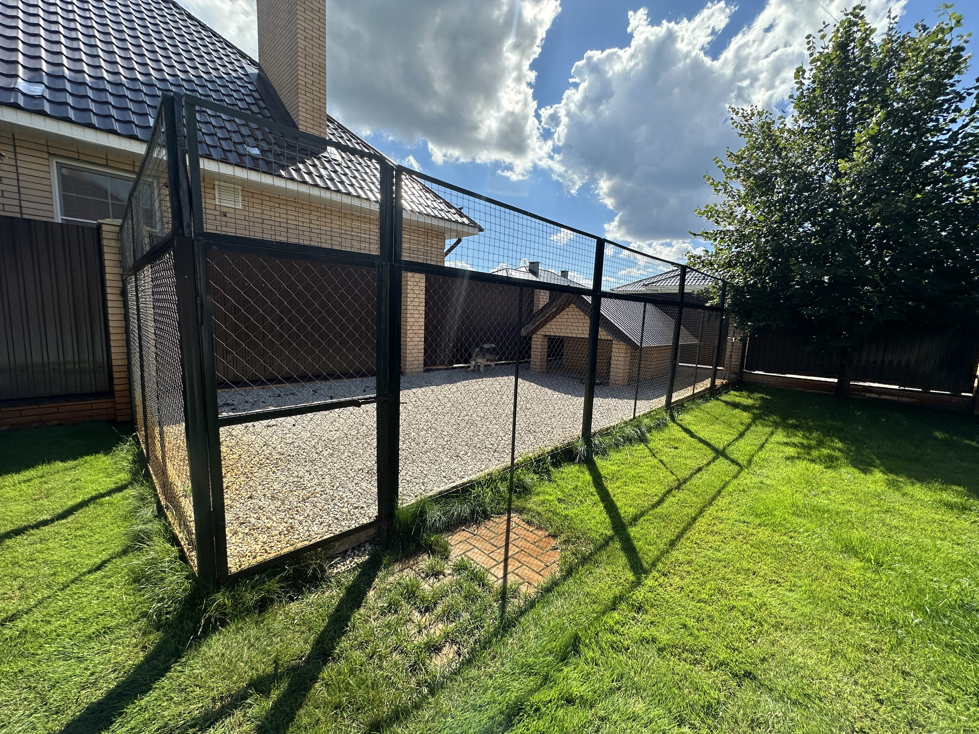 Участок 12,6 соток полностью облагорожен, ландшафтными насаждениями и газонами, вольер для собаки, декоративный колодец.