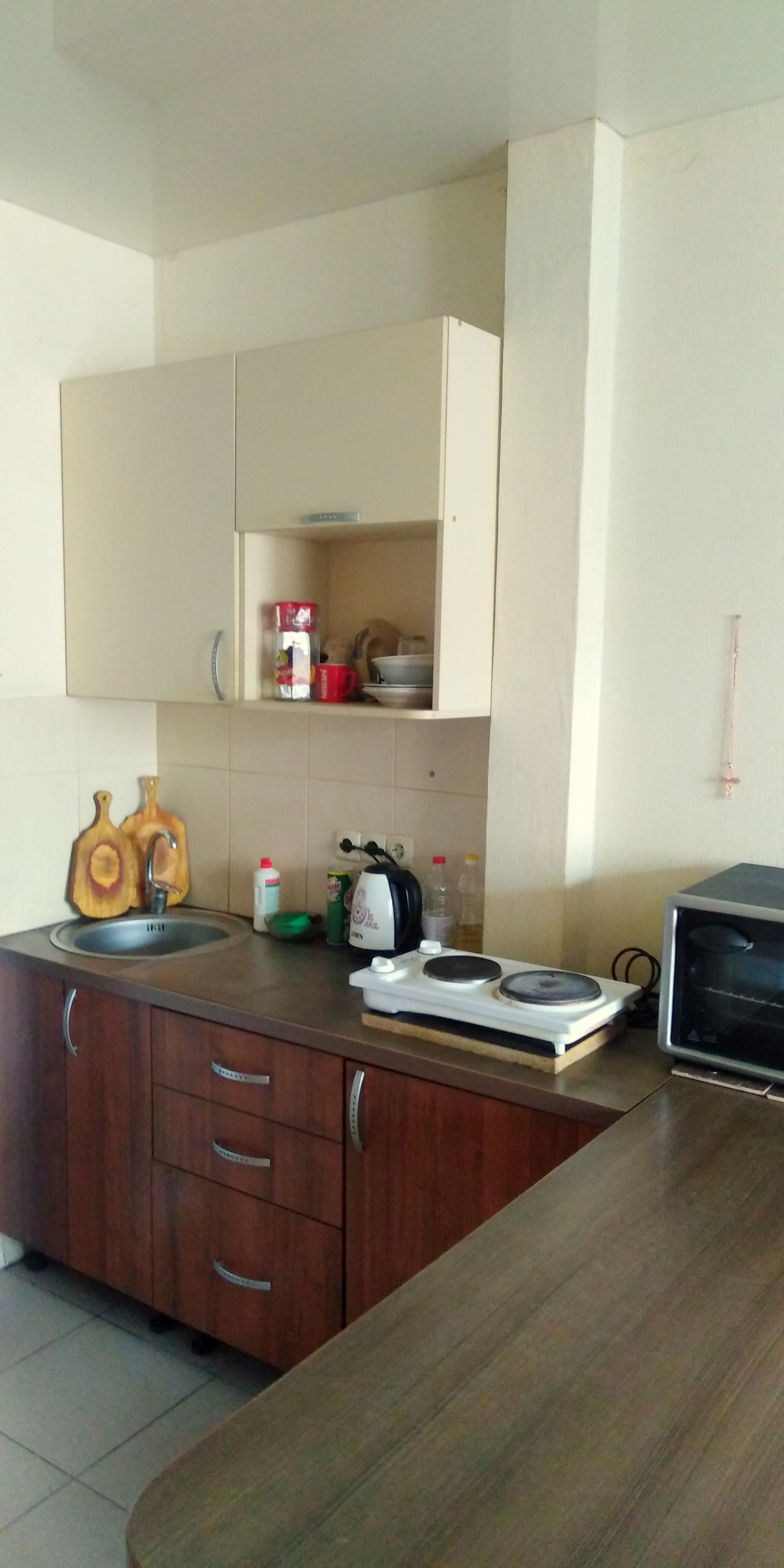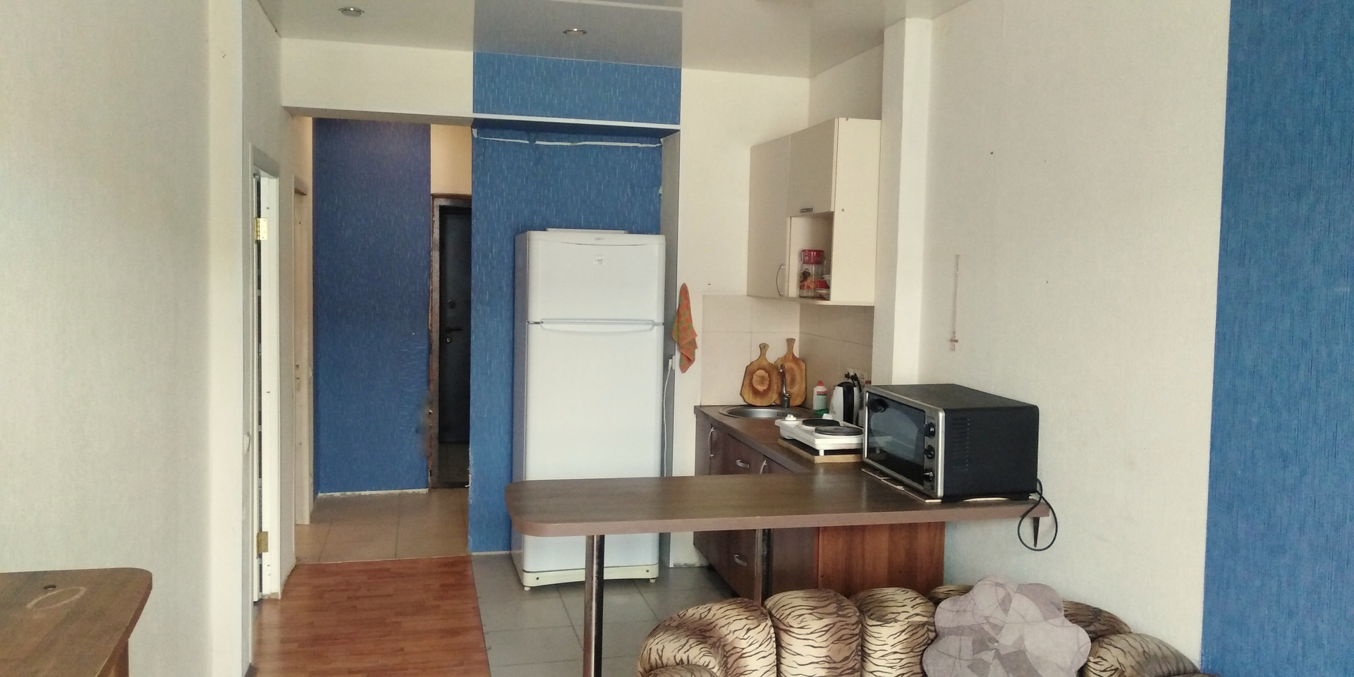 Оставляем кухонный гарнитур и встроенный шкаф в прихожей.