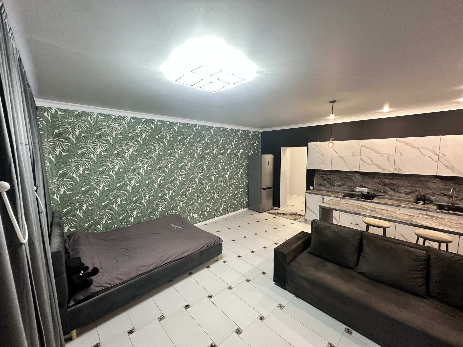 Потолок натяжной. Стены окрашены в зоне гостиной и кухни, обои моющие в спальной зоне.