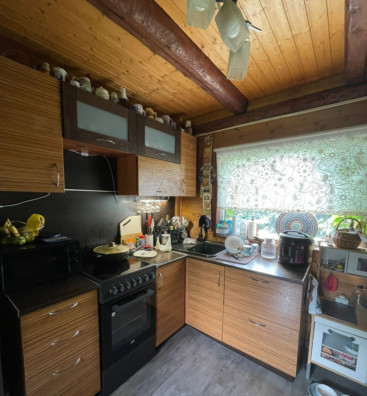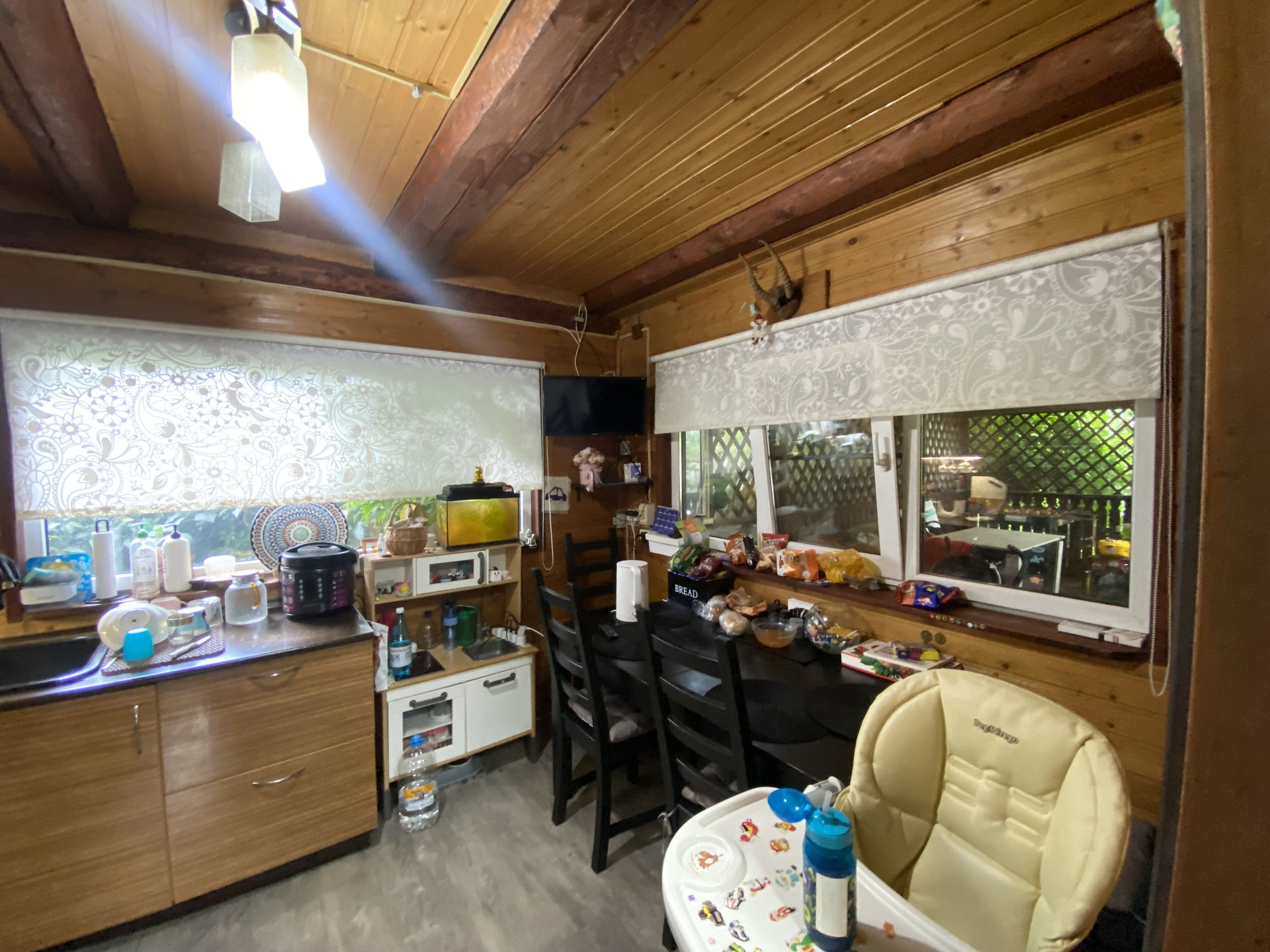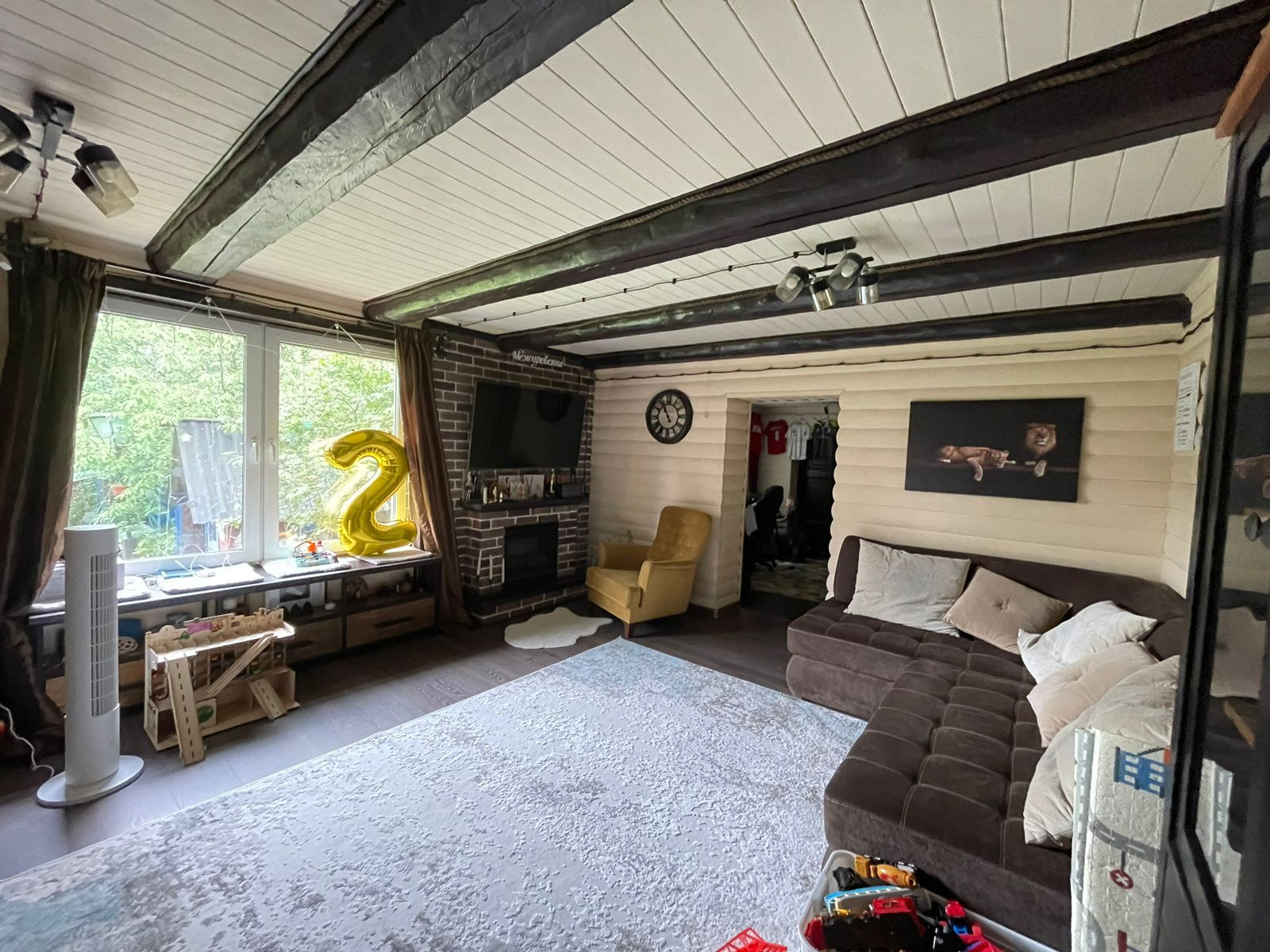 Дом построен из сруба и пеноблоков, обшитый блок-хаусом. В доме гостиная с камином, 3 спальни, два санузла, кухня и терраса для отдыха, имеется комната под газовое оборудование.