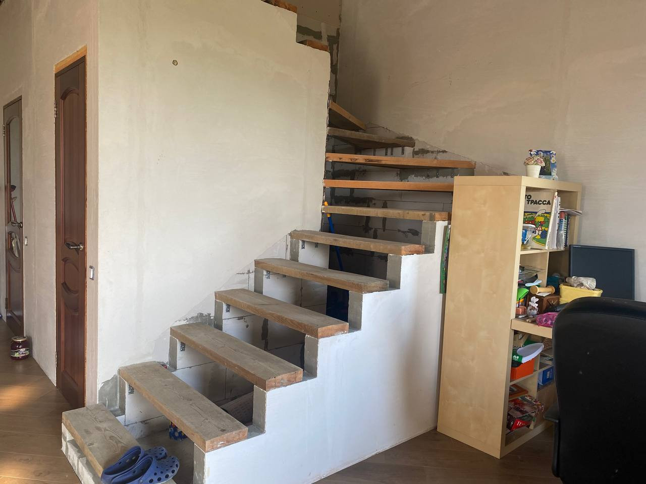 1 этаж - жилой (везде теплый пол + положен керамогранит, межк. двери, проводка, свет, санузел, стены готовы под обои - осталось поклеить и натянуть  потолок)