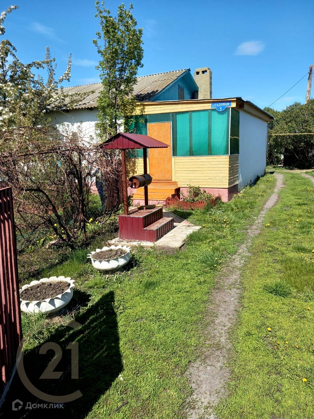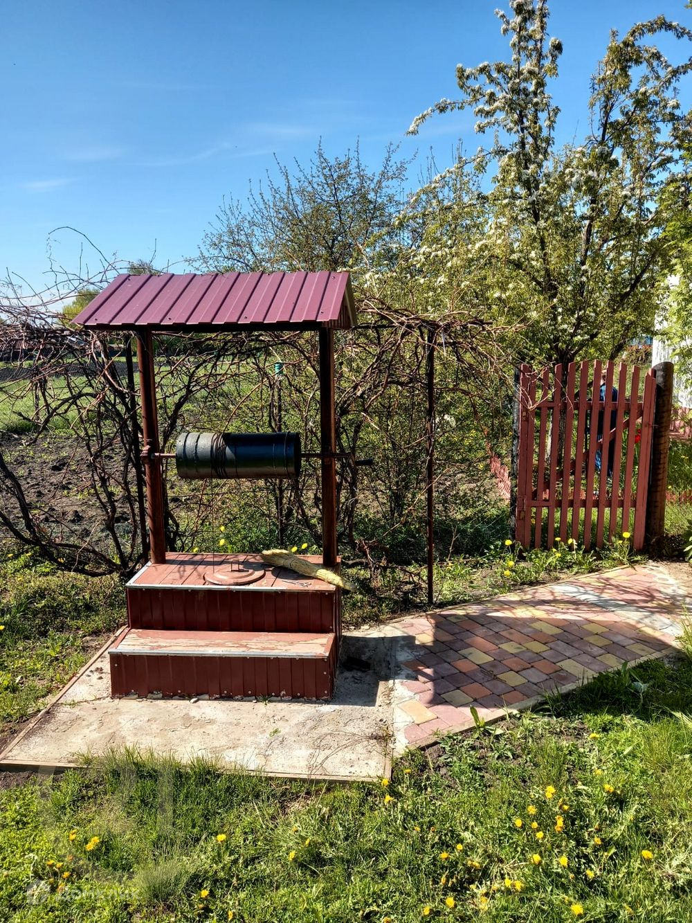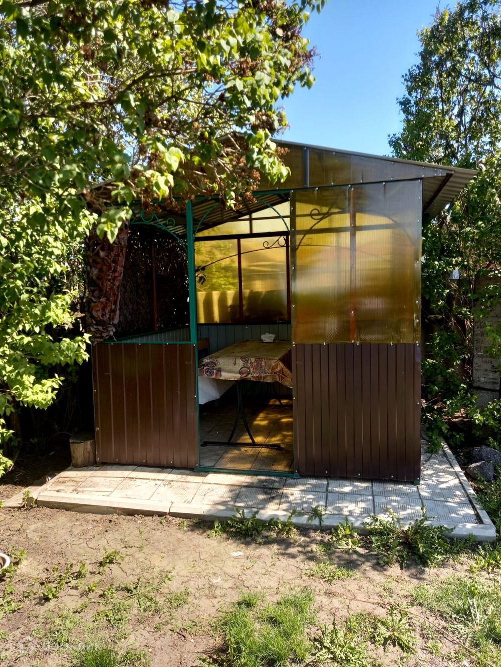 Во дворе надворные постройки, закрытая уютная беседка со столом, к входу в дом выложена дорожка из тротуарной плитки.