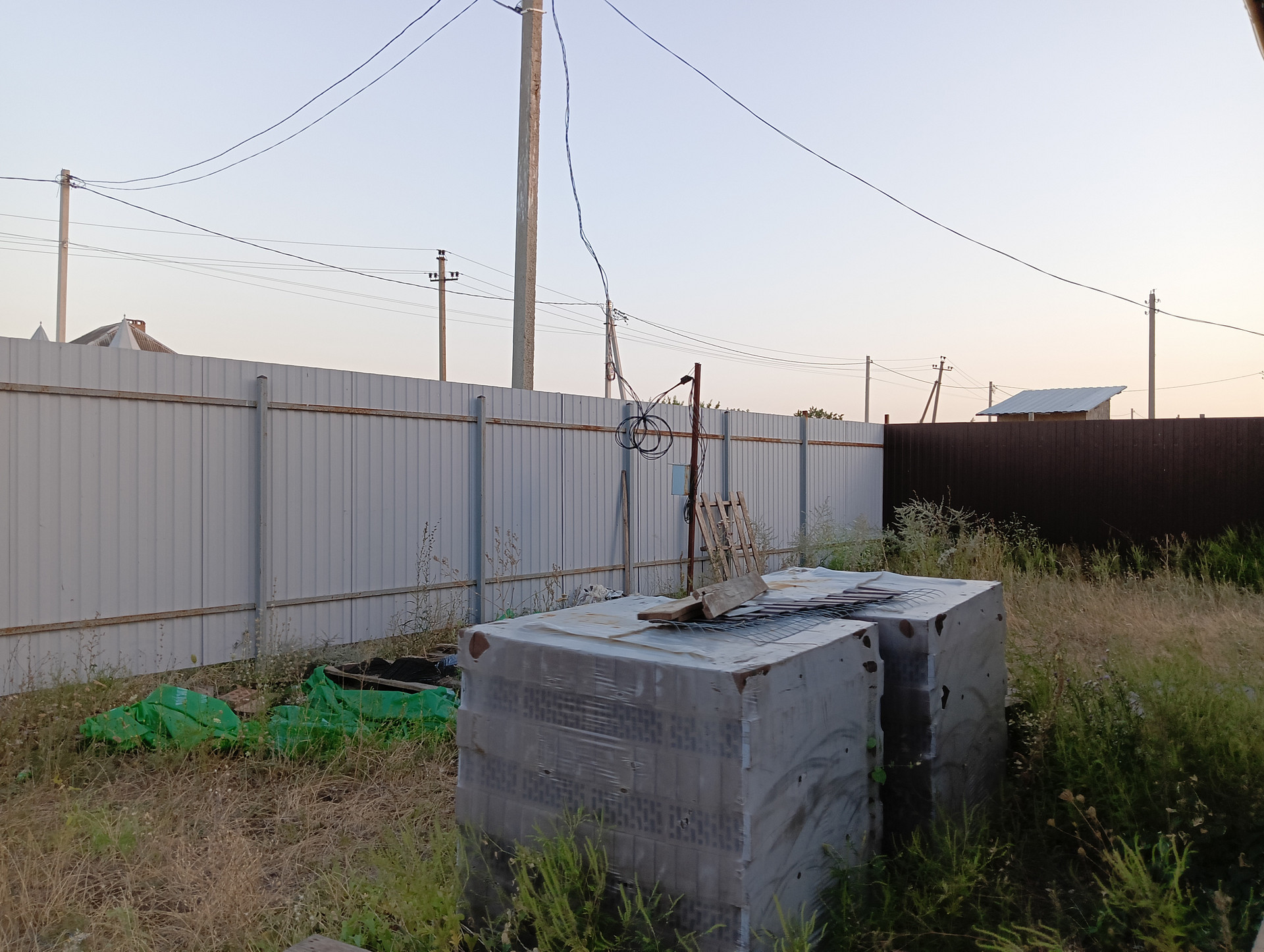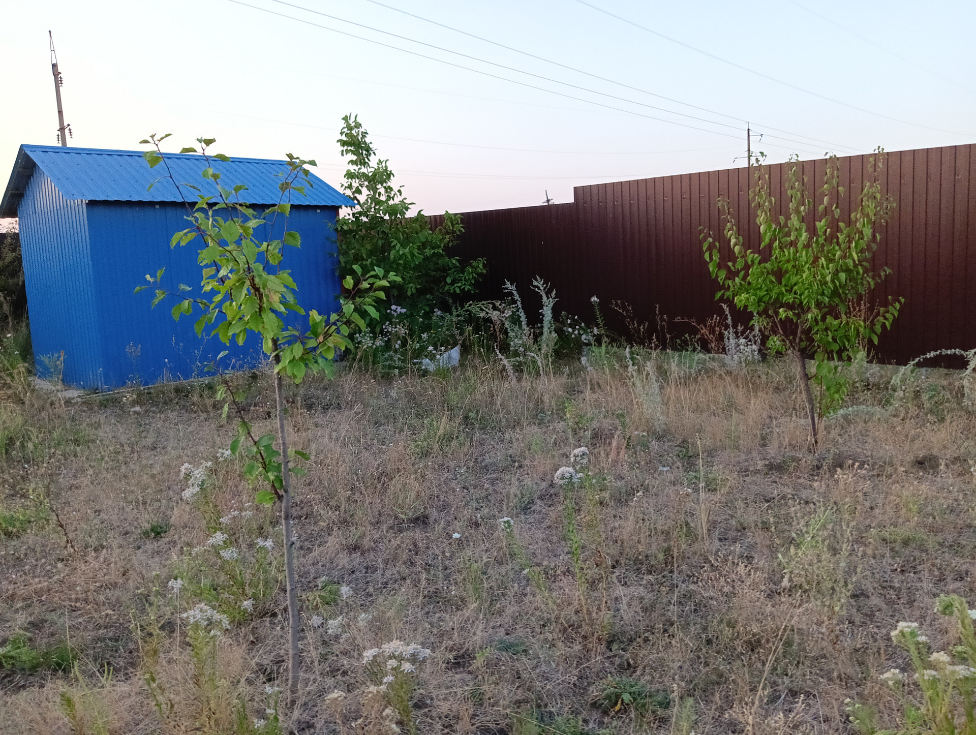 Участок по всему периметру огорожен забором из профнастила с воротами. На участке молодой сад. Имеется хоз.постройка 2,5х4 м.