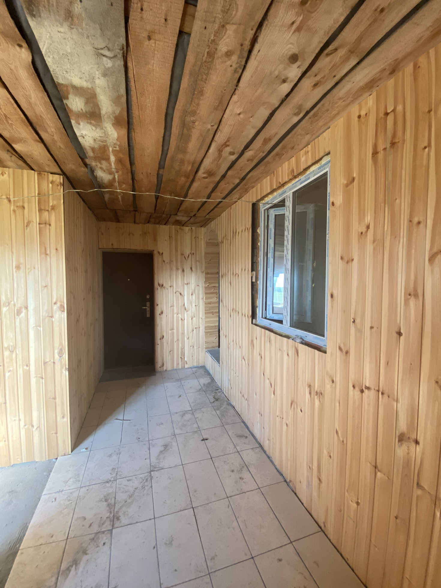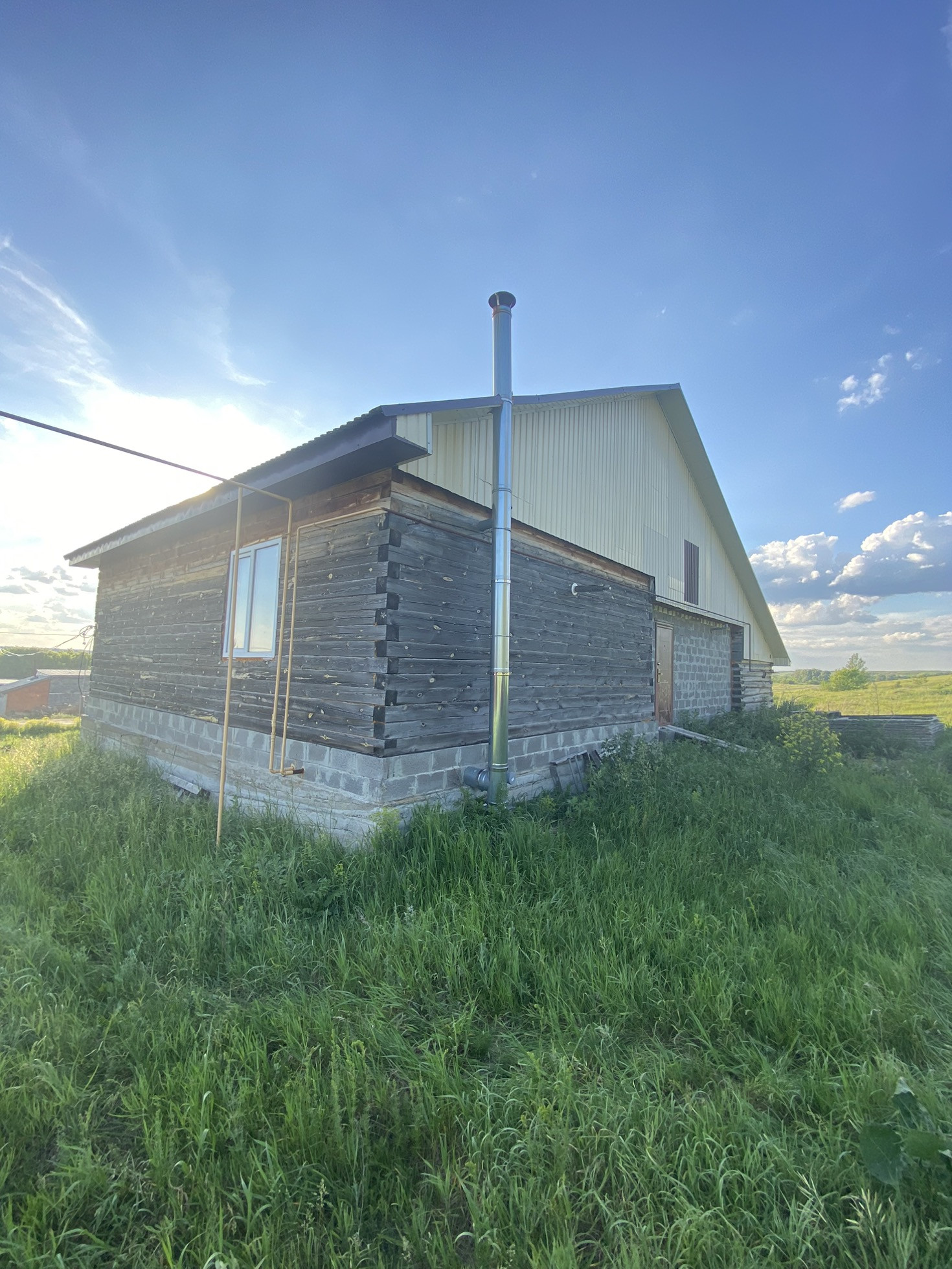 Жилая часть дома ( зал, кухня, две спальни) изготовлена из бруса, прихожая, санузел из кирпичных блоков, баня - сруб. Вся конструкция дома, коридора и бани заведена под единую кровлю.