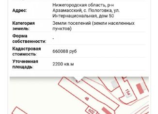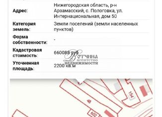 Земельный участок в с. Пологовка, Арзамасского района,по улице Интернацинальной,50 под ИЖС и ВЛПХ. 12 соток или 22 сотки. участок сам по себе 22 сотки, но можно разделить на два или купить 22 сотки. Газ, вода на улице. Отличный подъезд. Рядом большие пруды, лес. Живописные места. Возможен торг. |