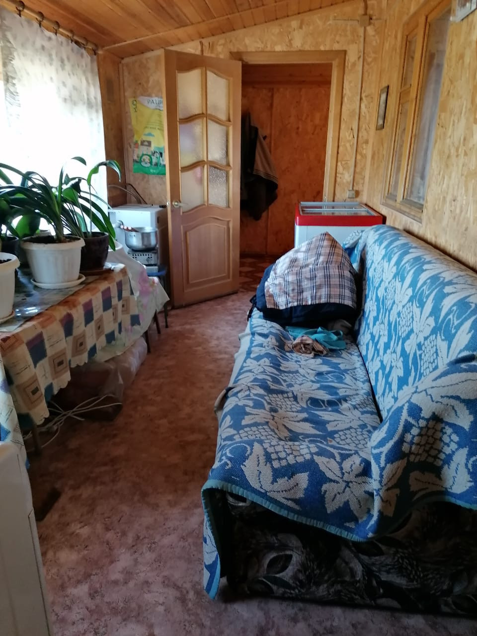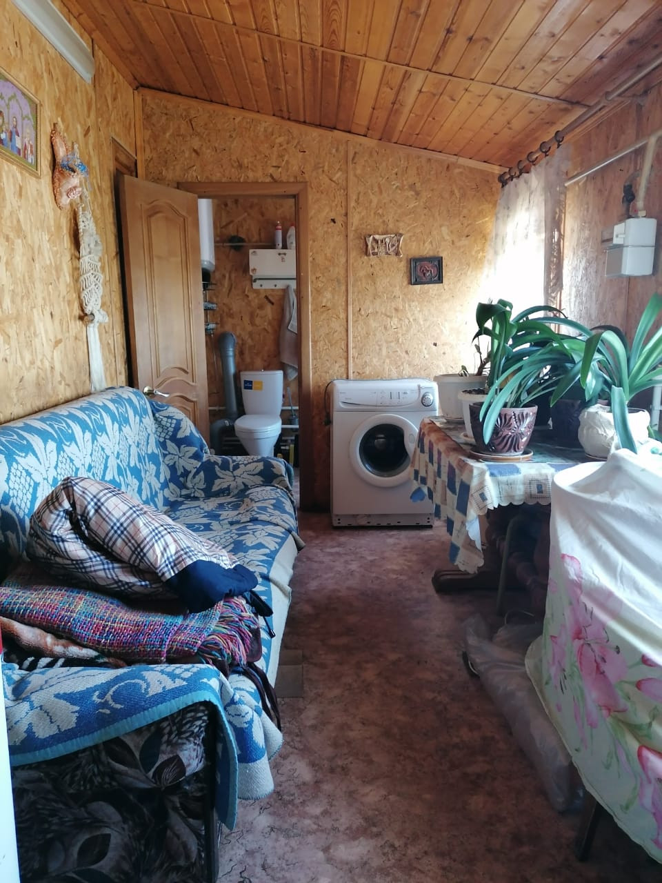 Дом 70.5 м2 из блоков с деревянными перекрытиями, утепление снаружи дома,  высота потолков 2,5м. АОГВ одноконтурный котел  (установлены краны перекрытия), свет, вода - скважина, нагрев воды от водонагревательного бака, канализация септик (простота обслуживания и долговременно не требует опорожнения станции),  радиаторы алюминиевые, окна евродерево. На полу второго этажа дерево, на первом этаже – линолеум, счетчики на газ и свет в доме. При входе в дом терасса. Санузел совмещен (душевая кабина).