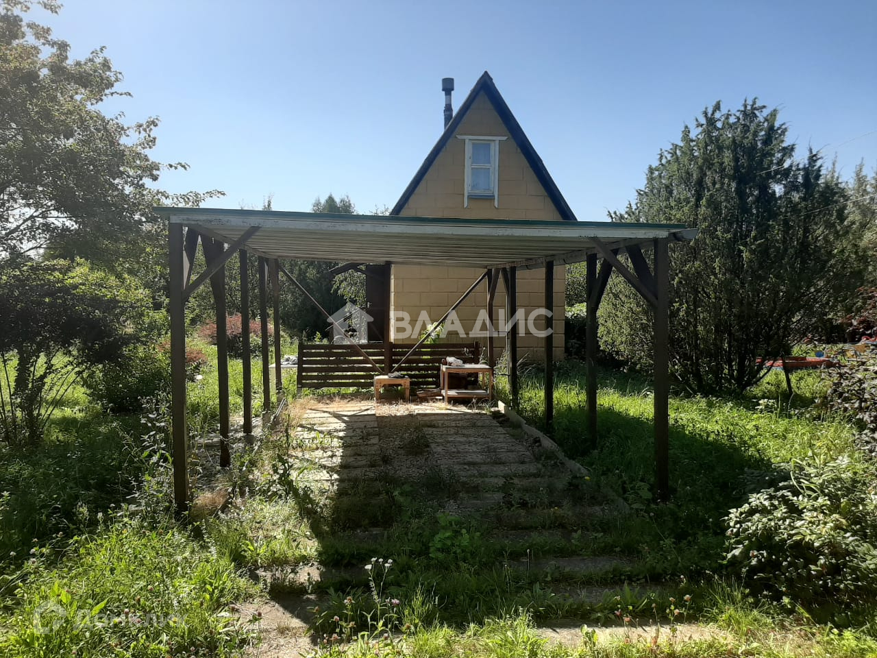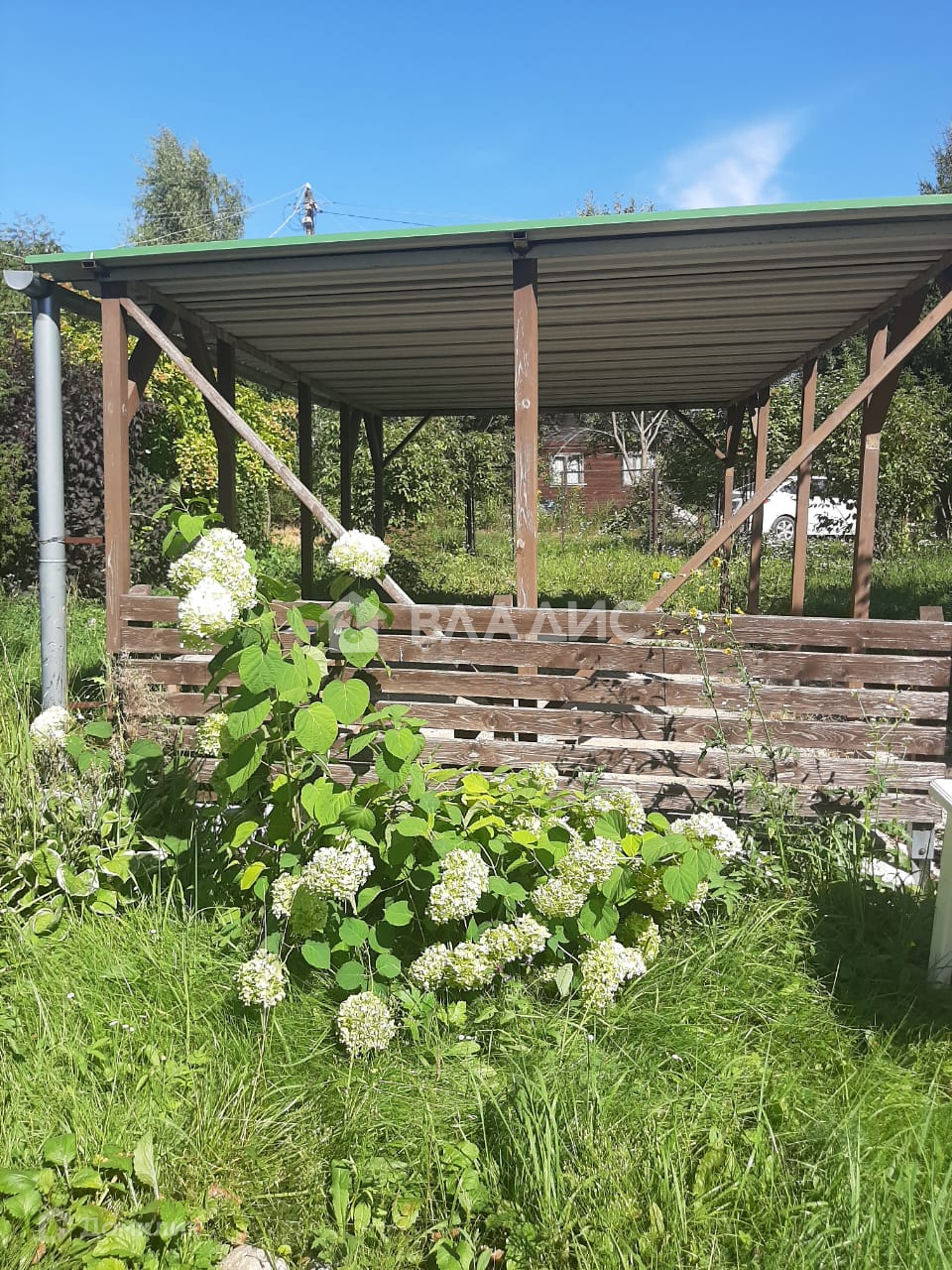 Во дворе дома установлен большой навес для  машины.