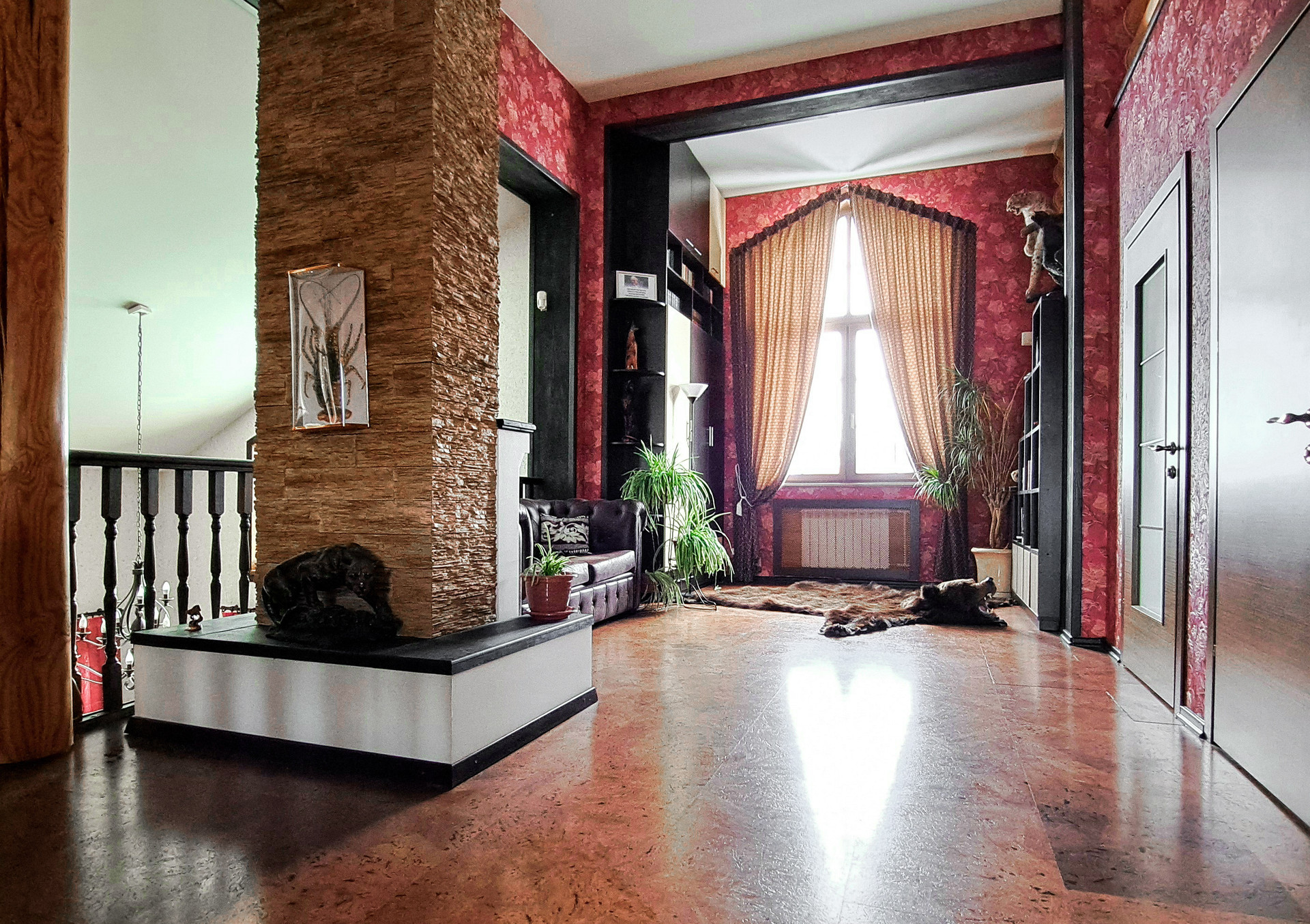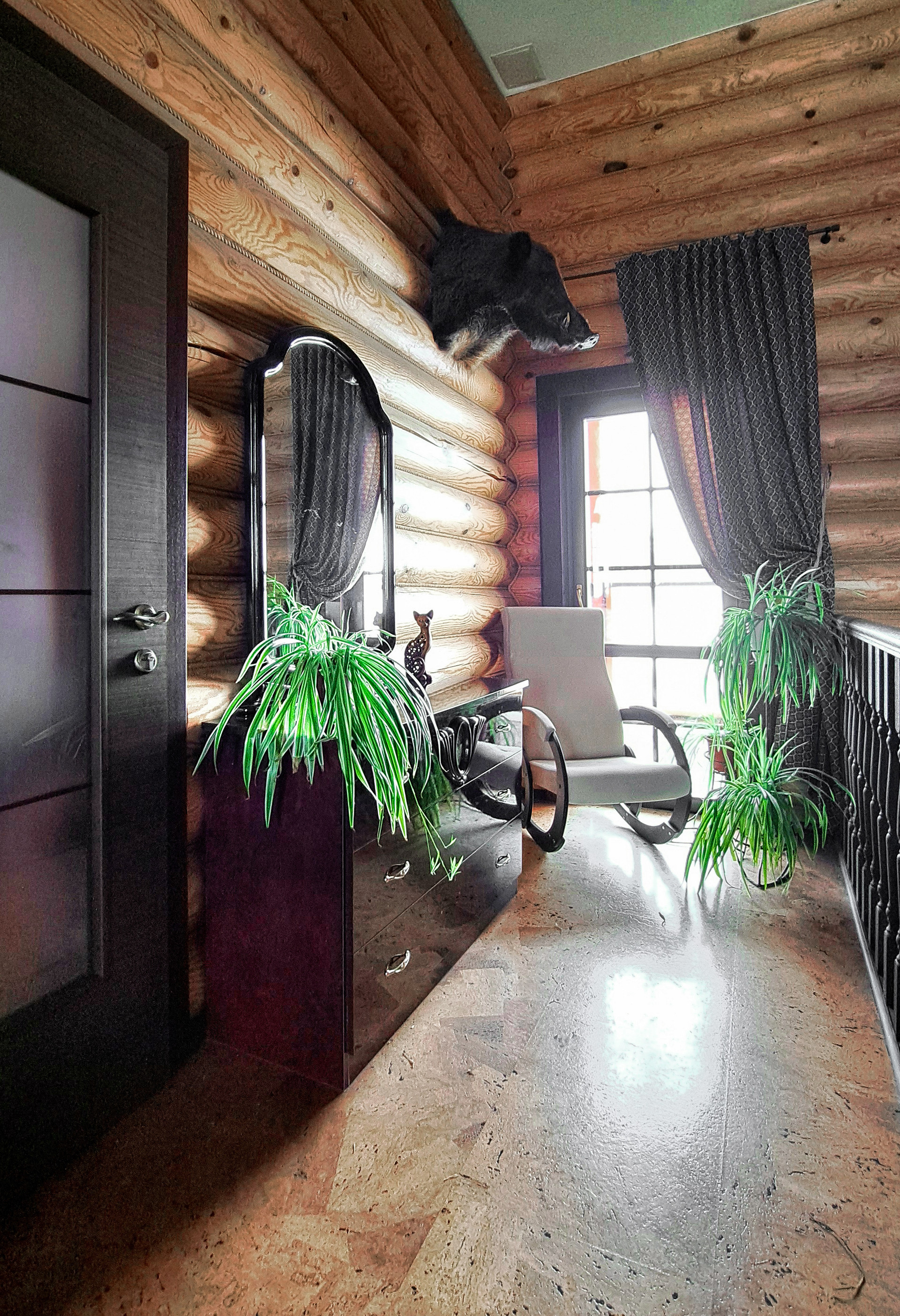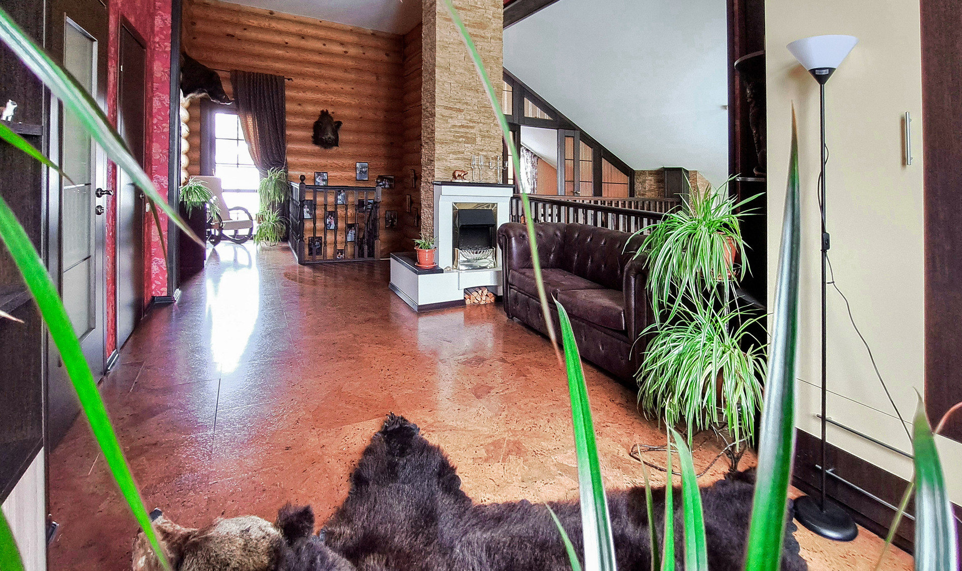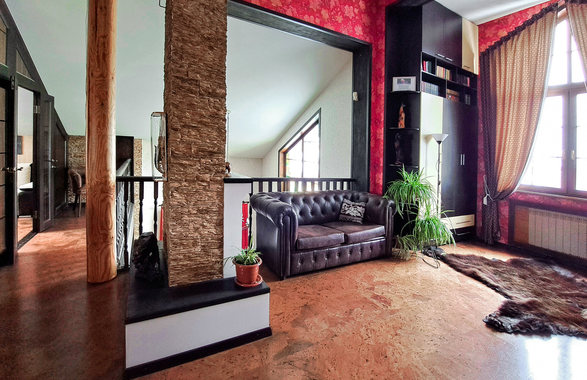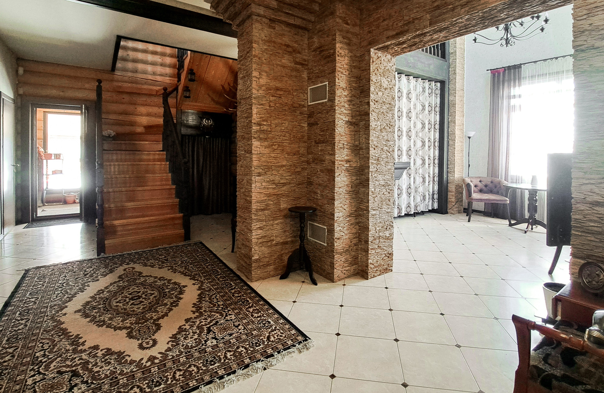 ✔️Полы второго этажа дома пробка. Очень удобные и тёплые. Пол первого этажа дорогостоящий кафель, очень практично и надёжно. Частичная отделка стен, гипсокартон покрытый структурными обоями из пообкового покрытия. Предают дому изящный вид и избавляют от излишнего присутствия бревенчатого края, разгружая глаз и предавая внутреннему пространсту утонченности и шарма. Английский стиль, второго света, через расписаный витраж, камин с мезанином, в дорогой отделке деревом, предаёт внутреннему пространству лёгкости и стиля.
