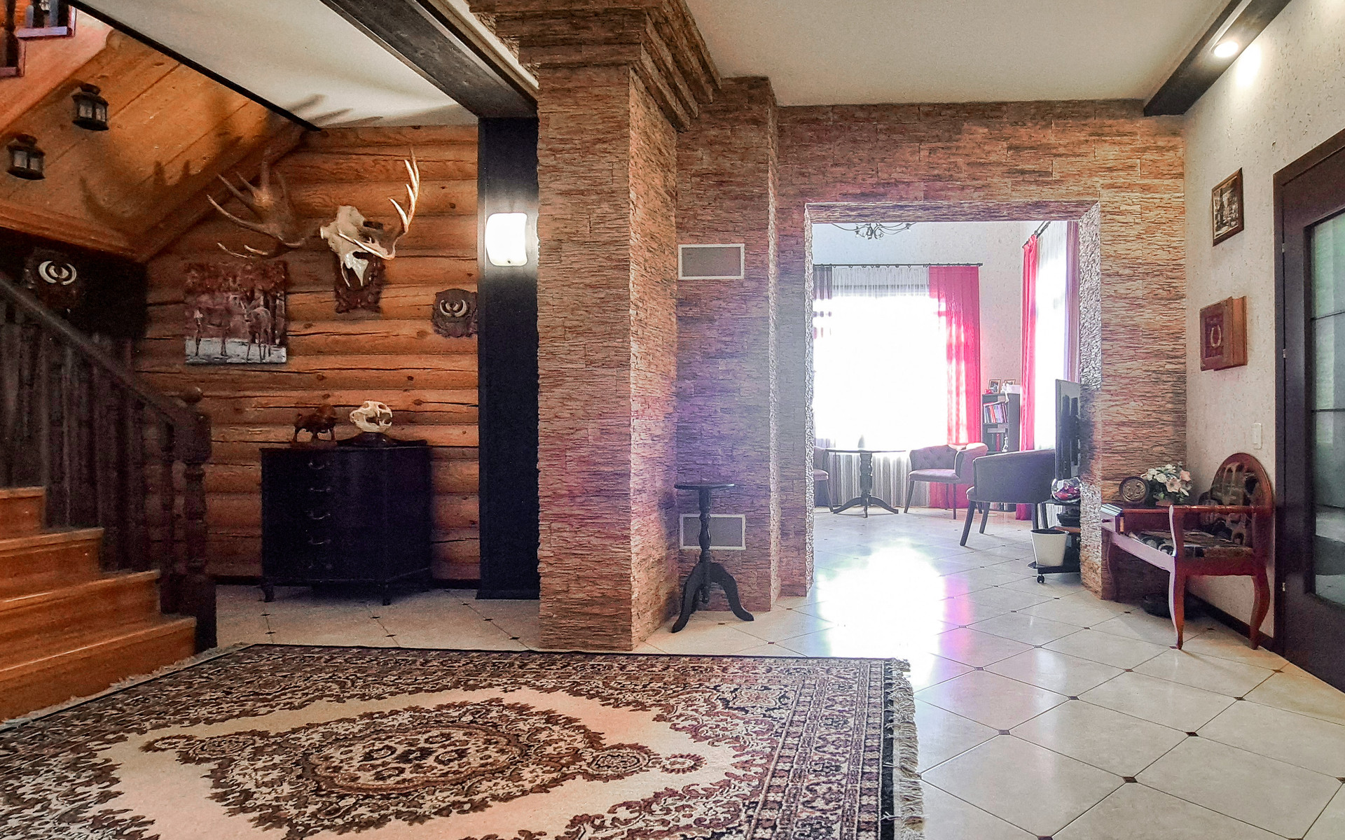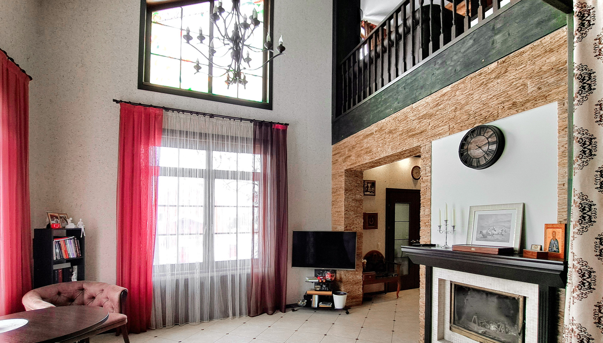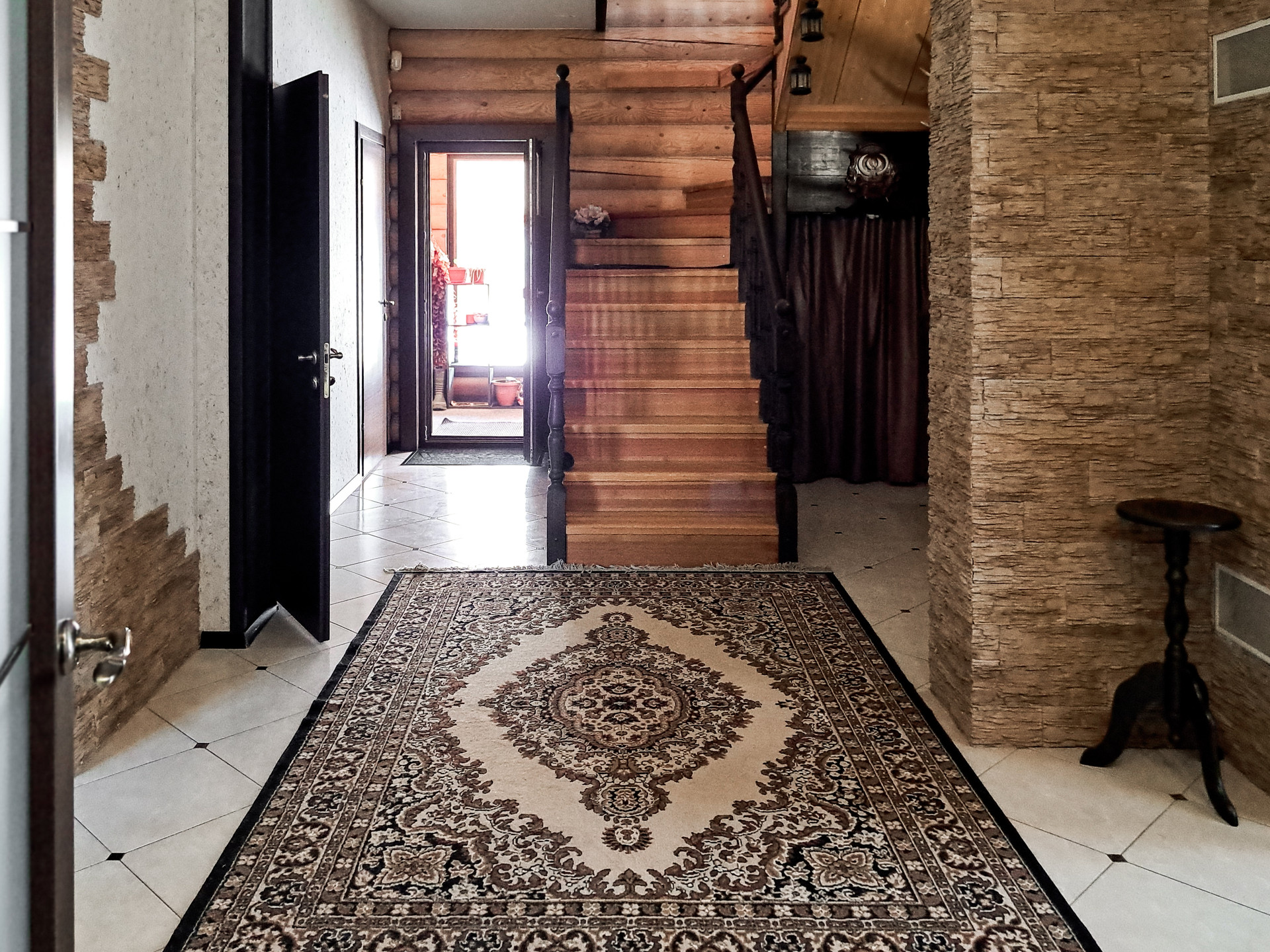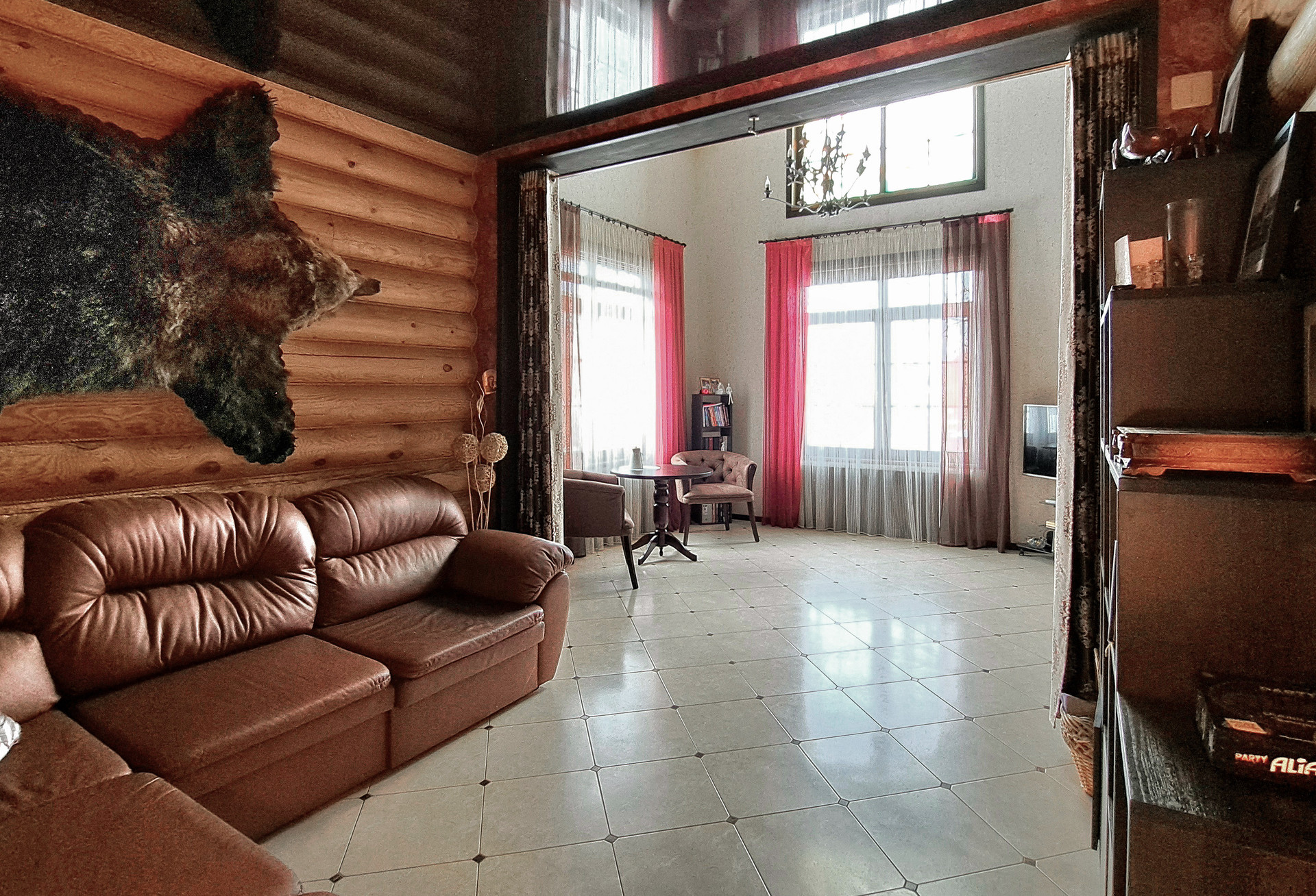✔️Полы второго этажа дома пробка. Очень удобные и тёплые. Пол первого этажа дорогостоящий кафель, очень практично и надёжно. Частичная отделка стен, гипсокартон покрытый структурными обоями из пообкового покрытия. Предают дому изящный вид и избавляют от излишнего присутствия бревенчатого края, разгружая глаз и предавая внутреннему пространсту утонченности и шарма. Английский стиль, второго света, через расписаный витраж, камин с мезанином, в дорогой отделке деревом, предаёт внутреннему пространству лёгкости и стиля.