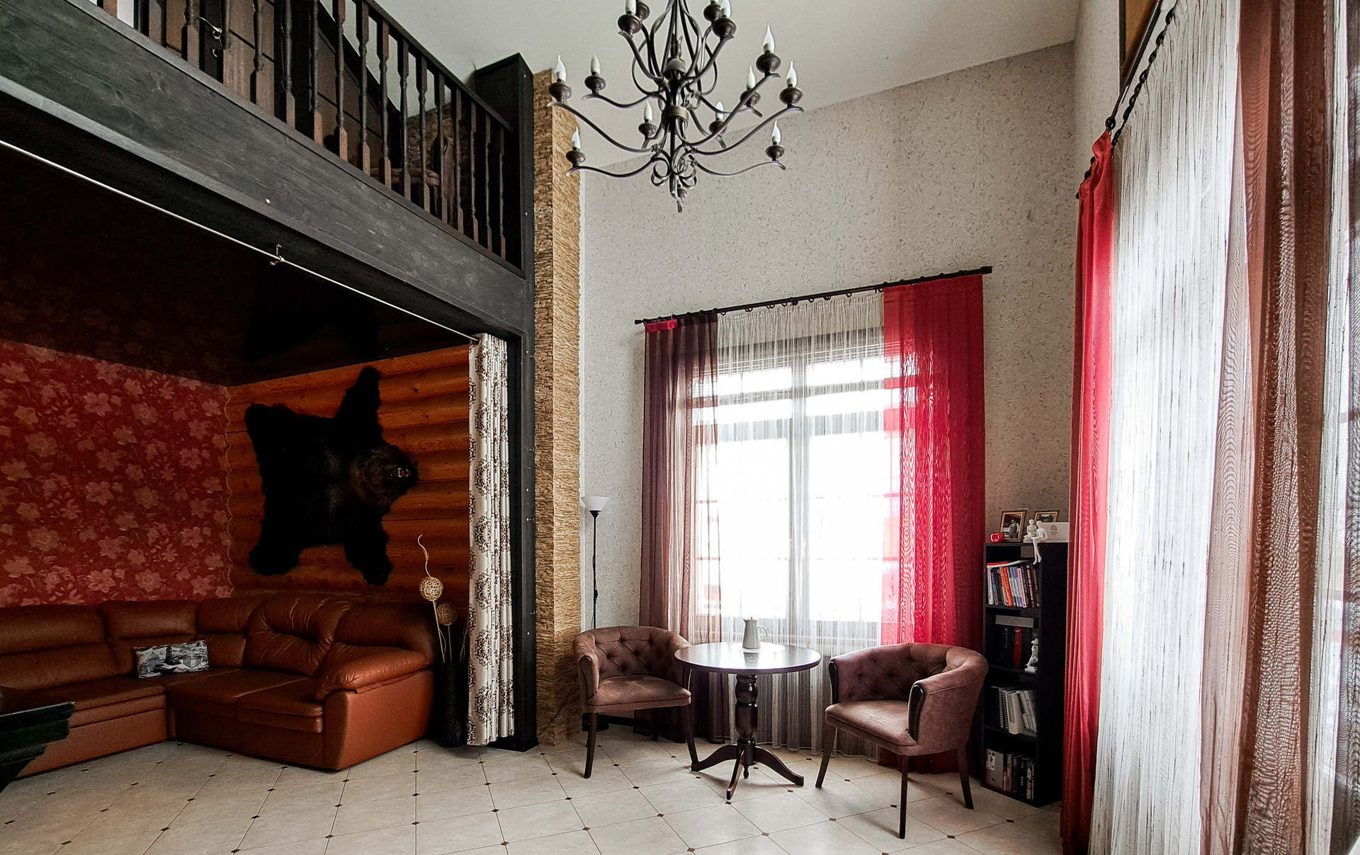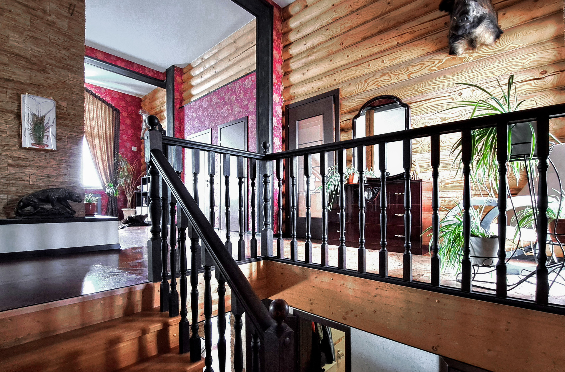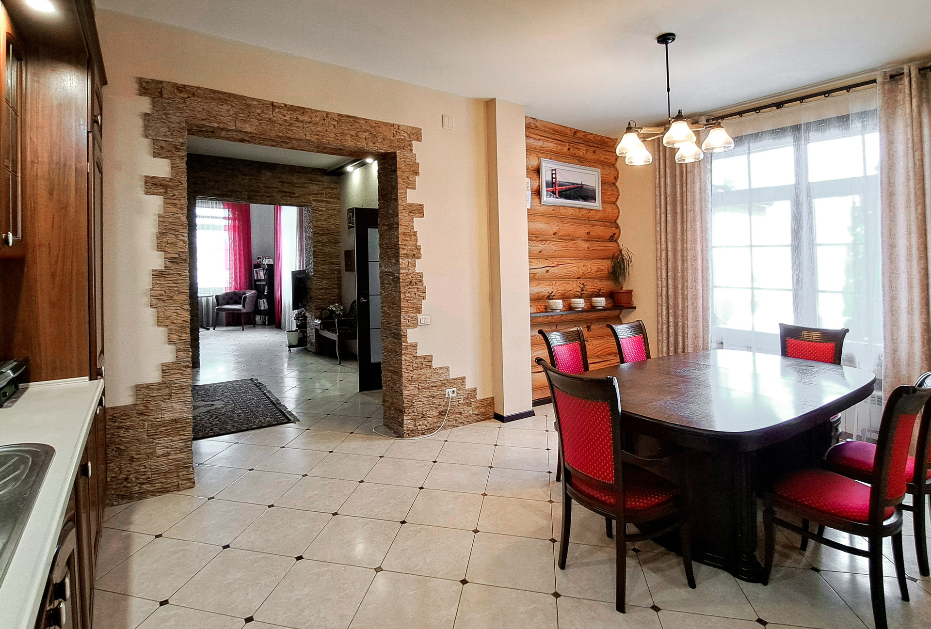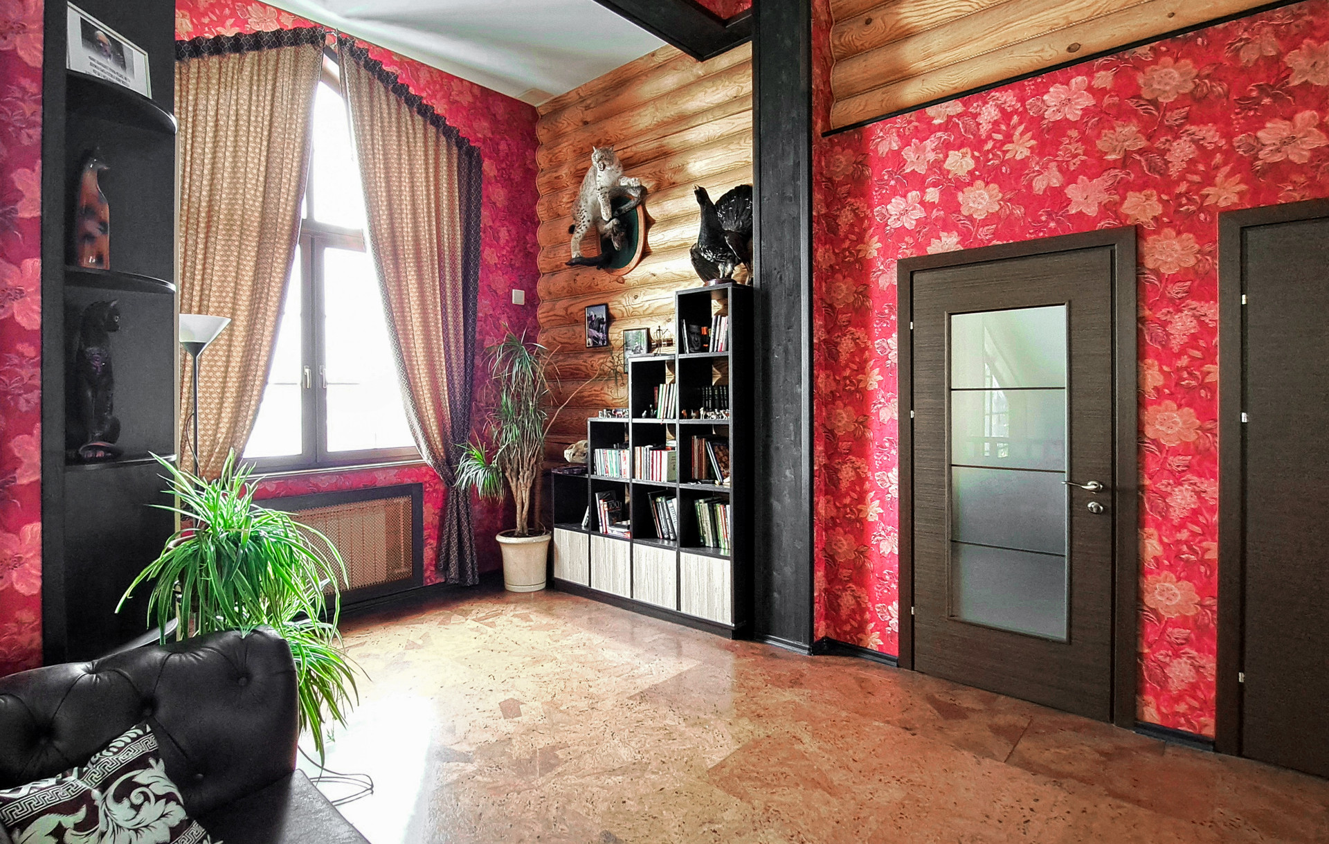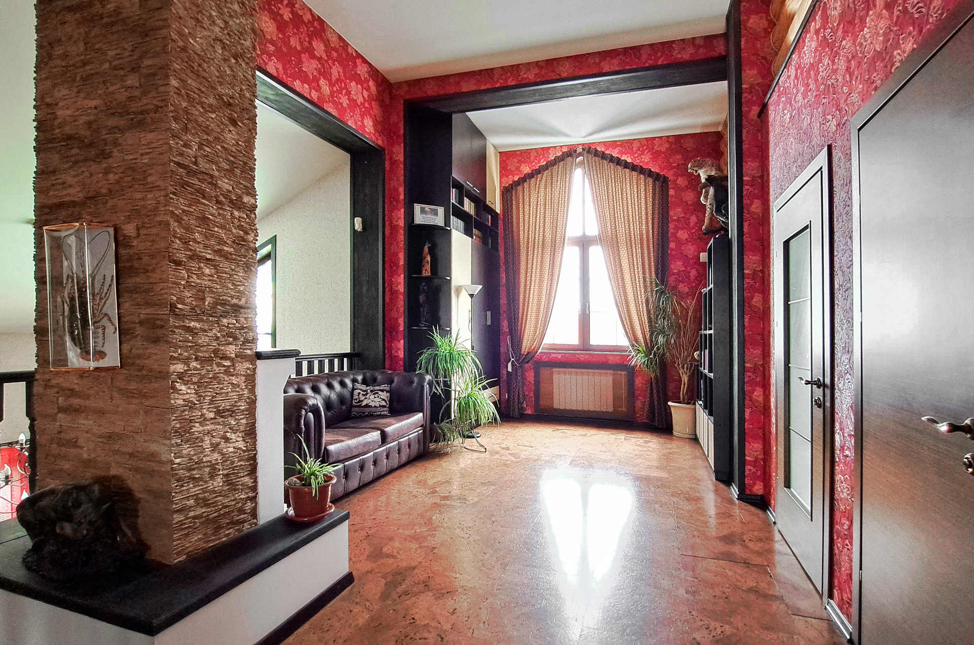 ✔️Полы второго этажа дома пробка. Очень удобные и тёплые. Пол первого этажа дорогостоящий кафель, очень практично и надёжно. Частичная отделка стен, гипсокартон покрытый структурными обоями из пообкового покрытия. Предают дому изящный вид и избавляют от излишнего присутствия бревенчатого края, разгружая глаз и предавая внутреннему пространсту утонченности и шарма. Английский стиль, второго света, через расписаный витраж, камин с мезанином, в дорогой отделке деревом, предаёт внутреннему пространству лёгкости и стиля.