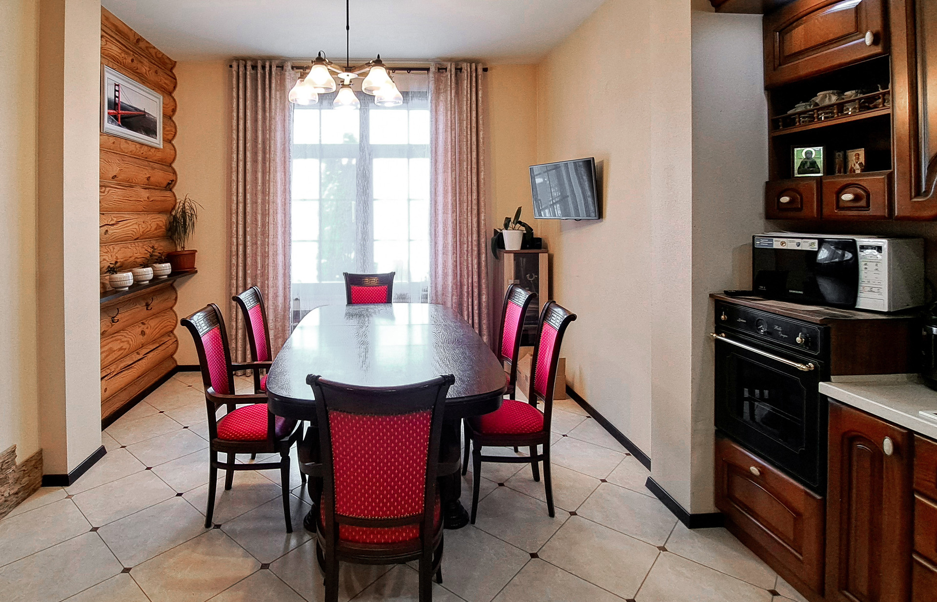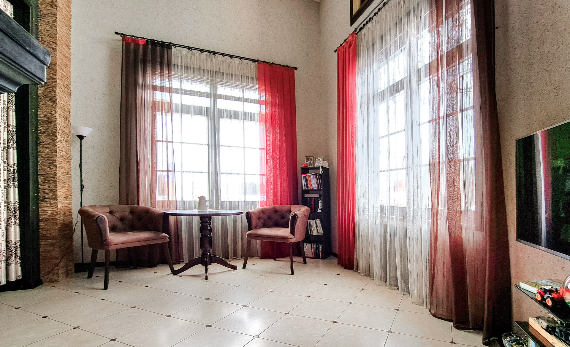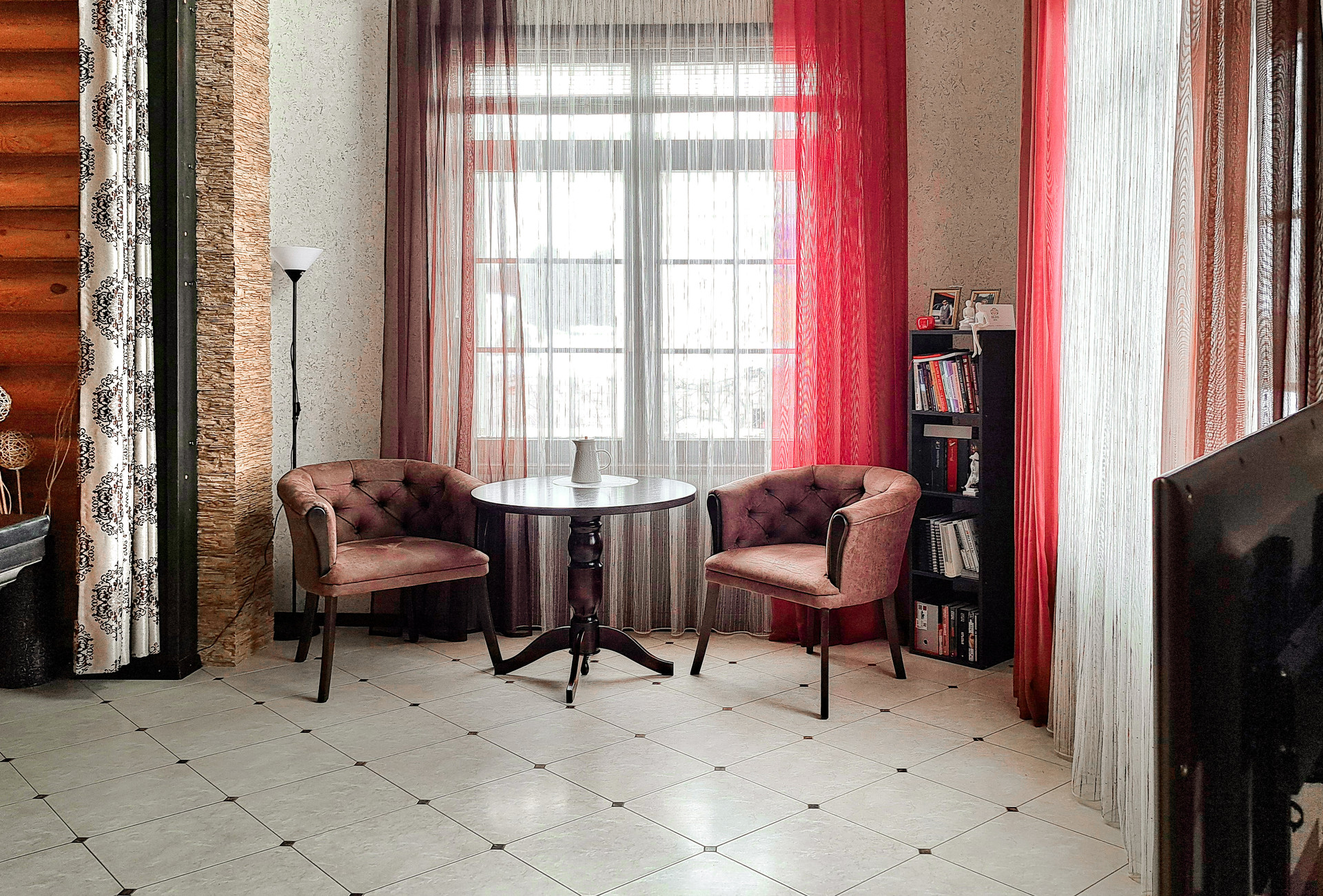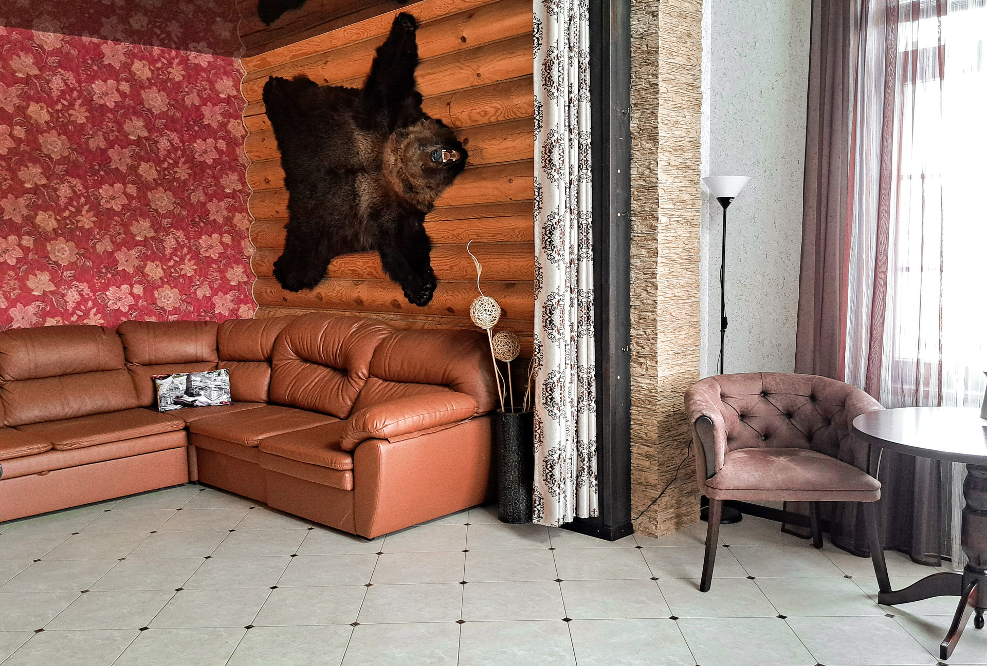 ✔️Полы второго этажа дома пробка. Очень удобные и тёплые. Пол первого этажа дорогостоящий кафель, очень практично и надёжно. Частичная отделка стен, гипсокартон покрытый структурными обоями из пообкового покрытия. Предают дому изящный вид и избавляют от излишнего присутствия бревенчатого края, разгружая глаз и предавая внутреннему пространсту утонченности и шарма. Английский стиль, второго света, через расписаный витраж, камин с мезанином, в дорогой отделке деревом, предаёт внутреннему пространству лёгкости и стиля.