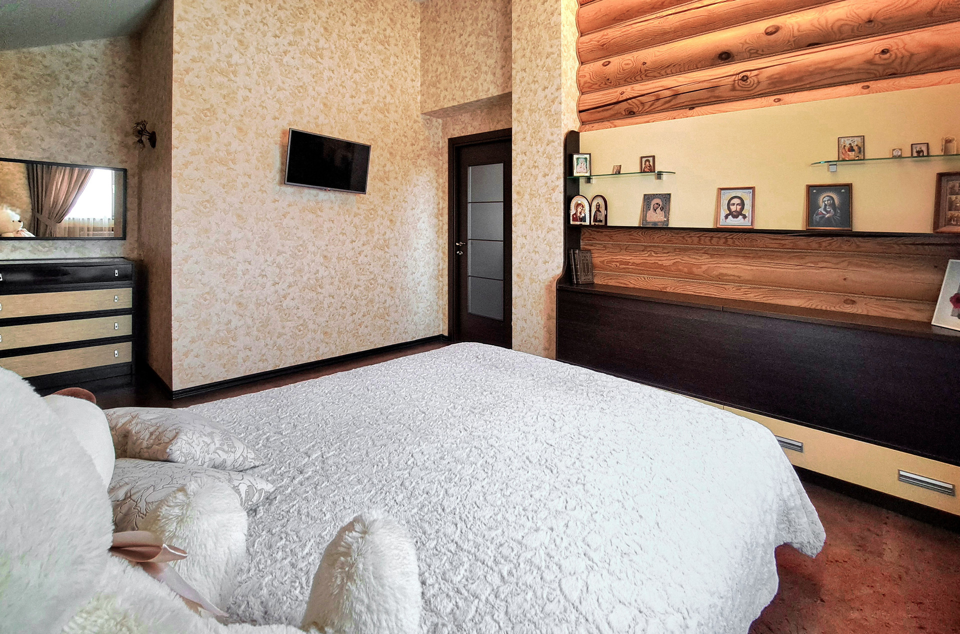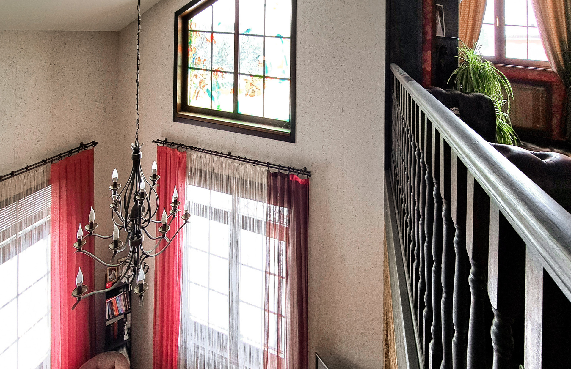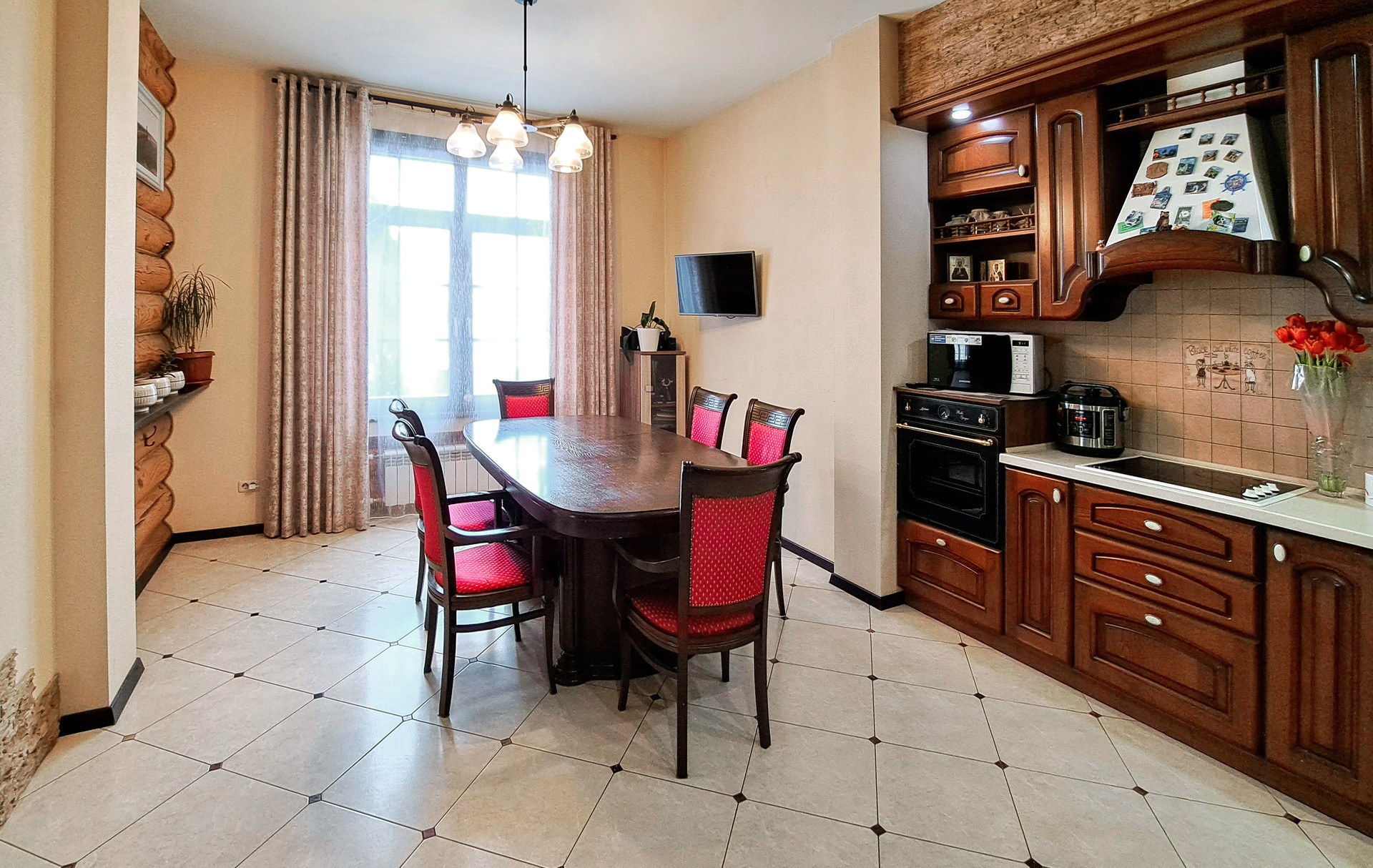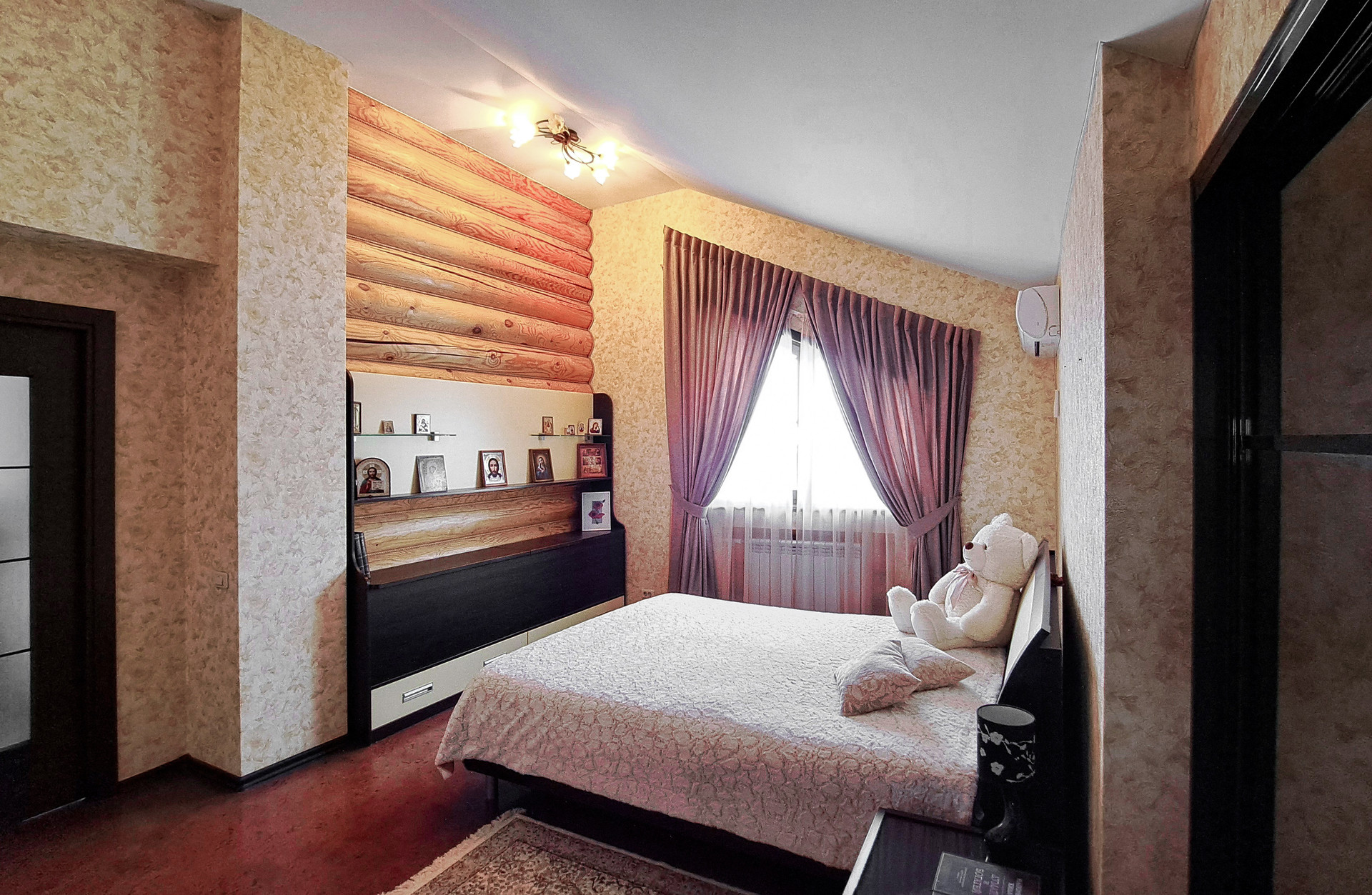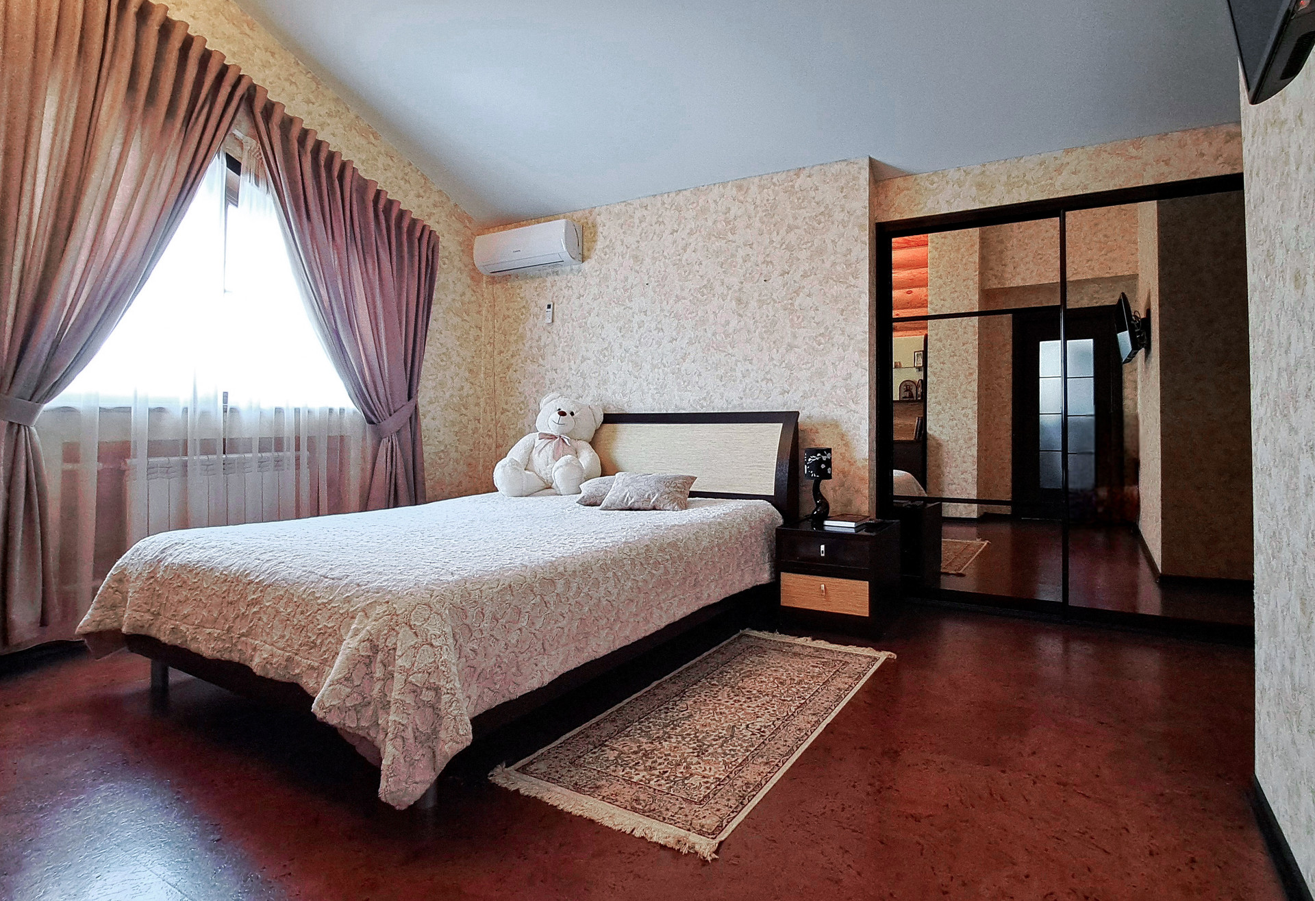 ✔️Полы второго этажа дома пробка. Очень удобные и тёплые. Пол первого этажа дорогостоящий кафель, очень практично и надёжно. Частичная отделка стен, гипсокартон покрытый структурными обоями из пообкового покрытия. Предают дому изящный вид и избавляют от излишнего присутствия бревенчатого края, разгружая глаз и предавая внутреннему пространсту утонченности и шарма. Английский стиль, второго света, через расписаный витраж, камин с мезанином, в дорогой отделке деревом, предаёт внутреннему пространству лёгкости и стиля.