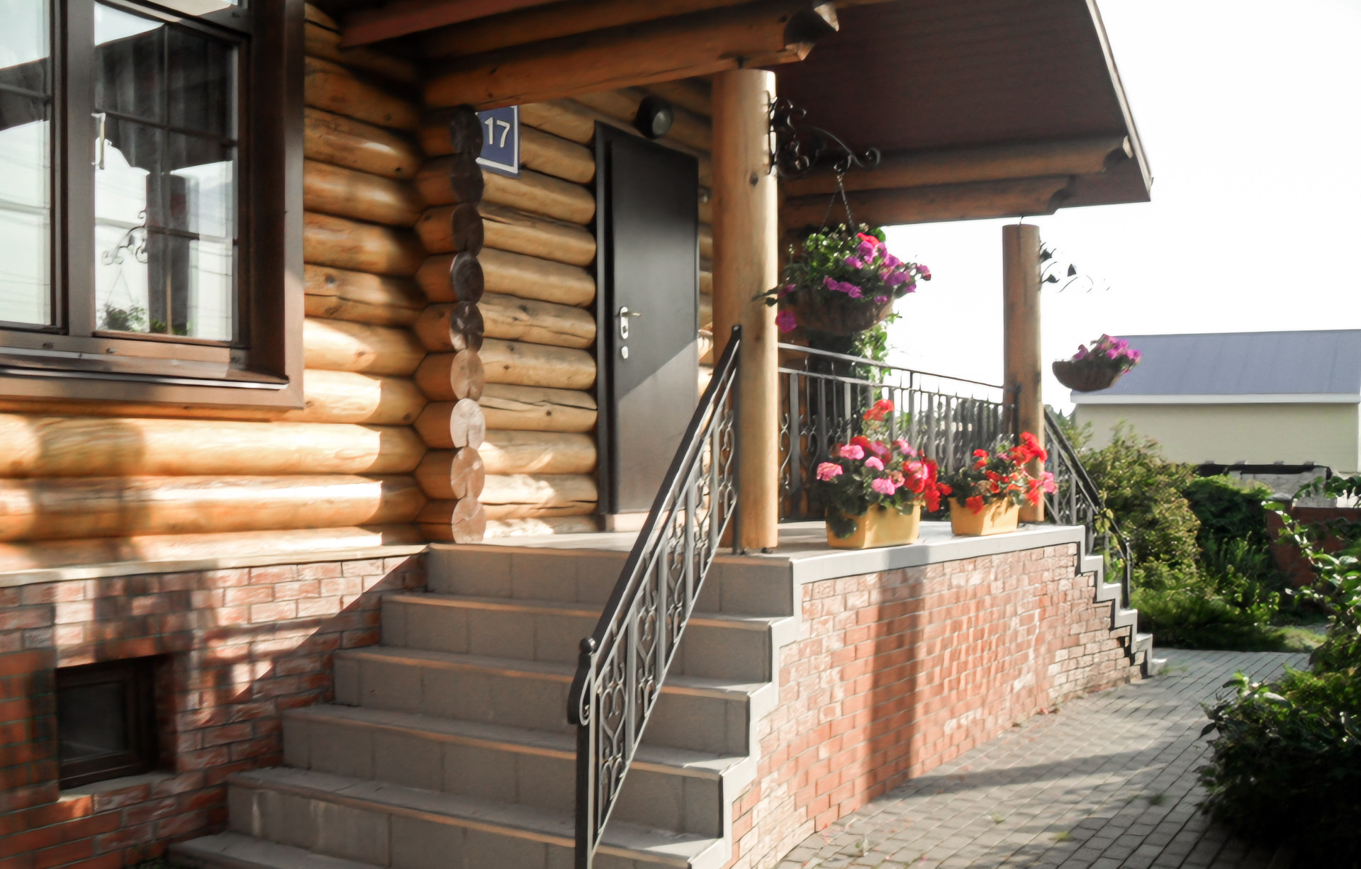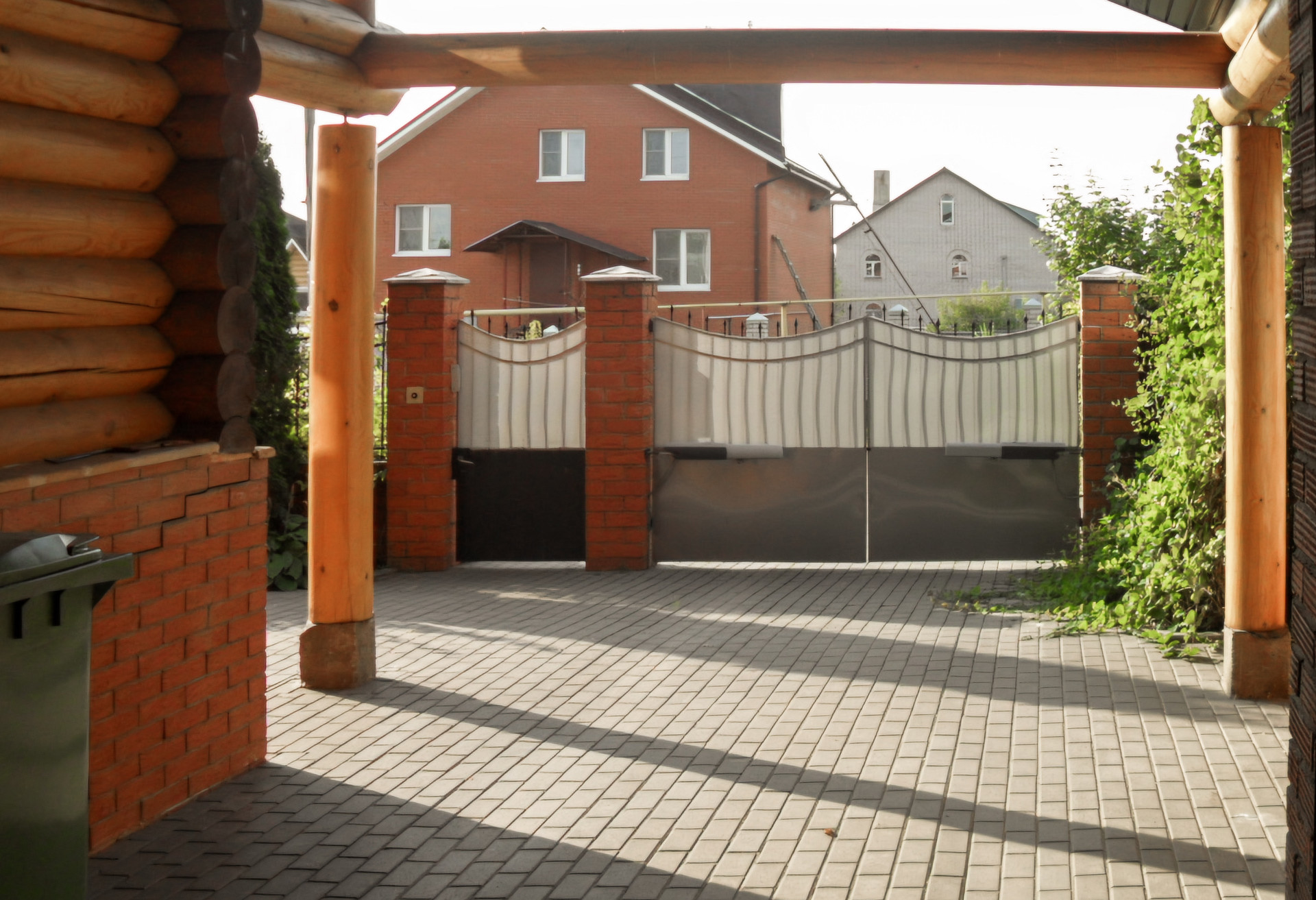 По фасаду участка кирпичный забор с коваными элементами, ворота открываются с брелка.