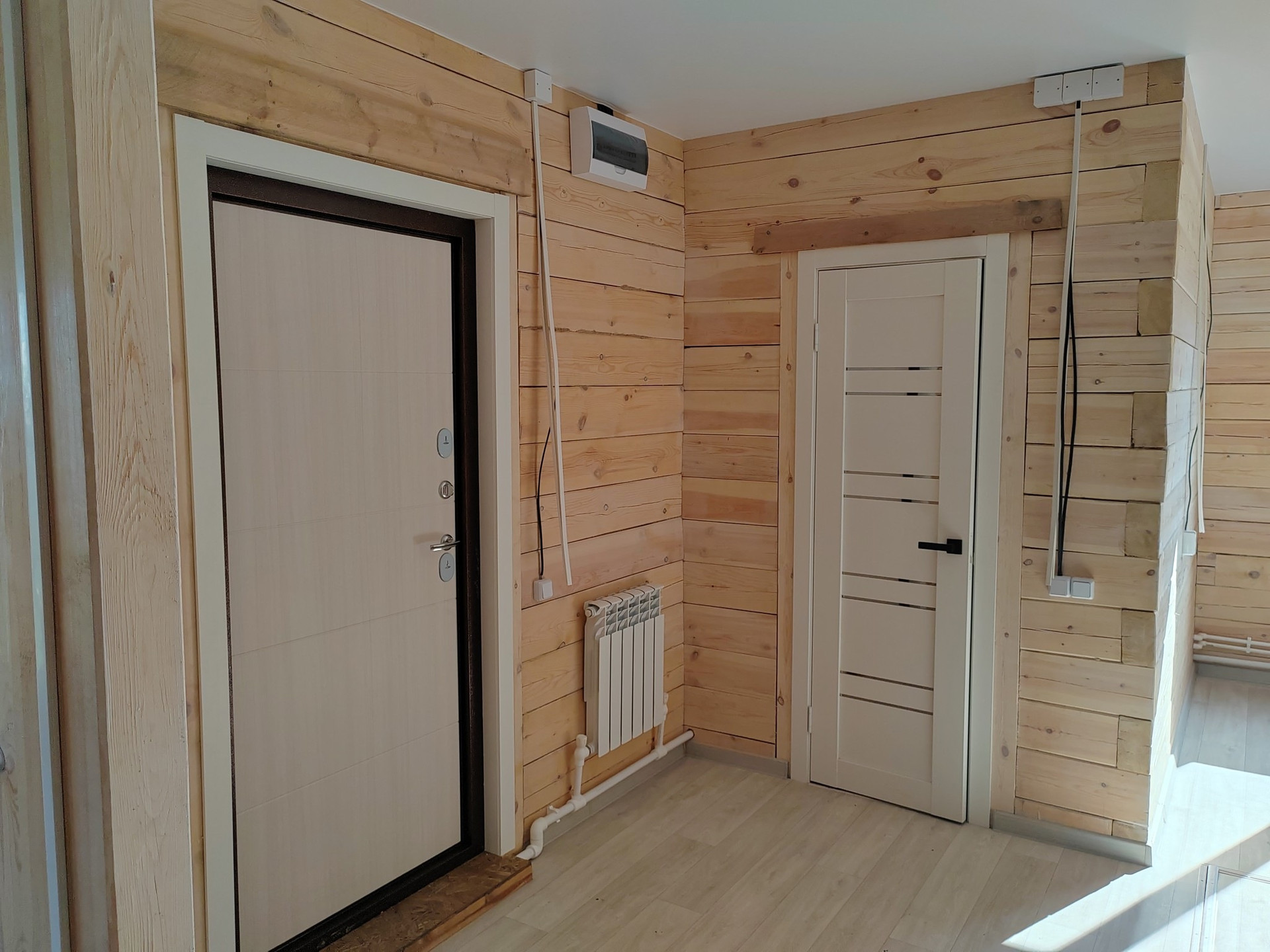 Установлена хорошая дверь с терморазрывом и межкомнатные двери, натяжные потолки со светильниками, линолеум на полу.