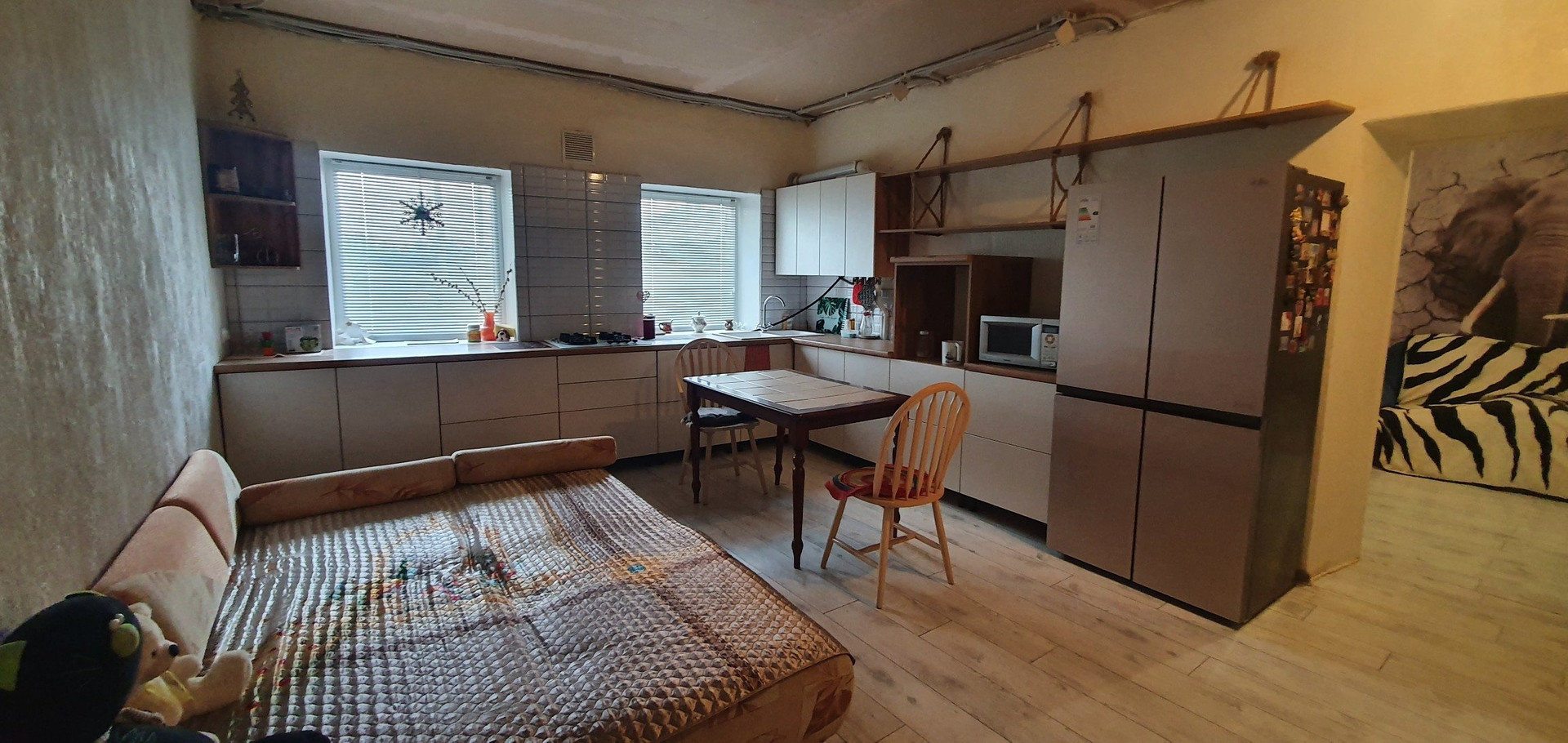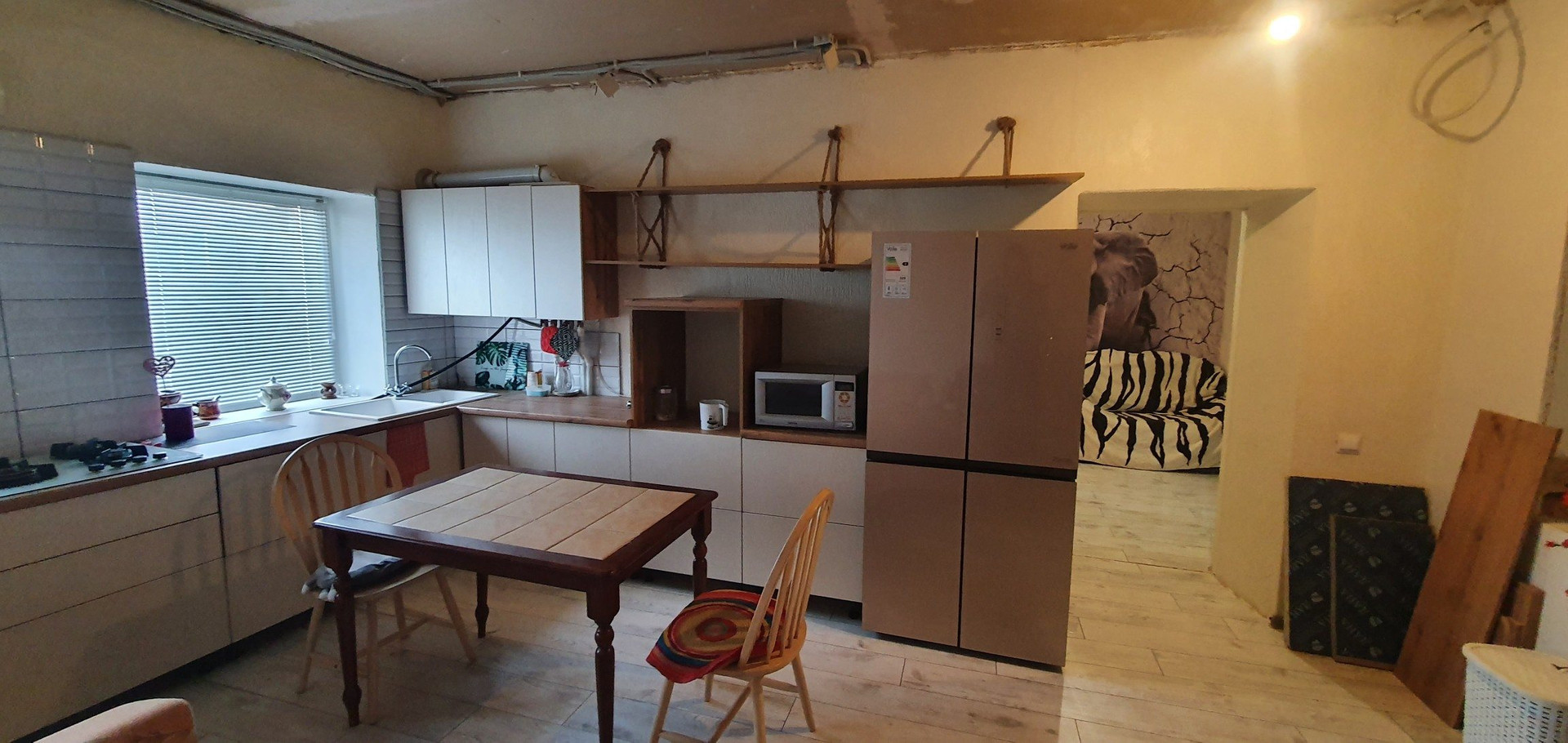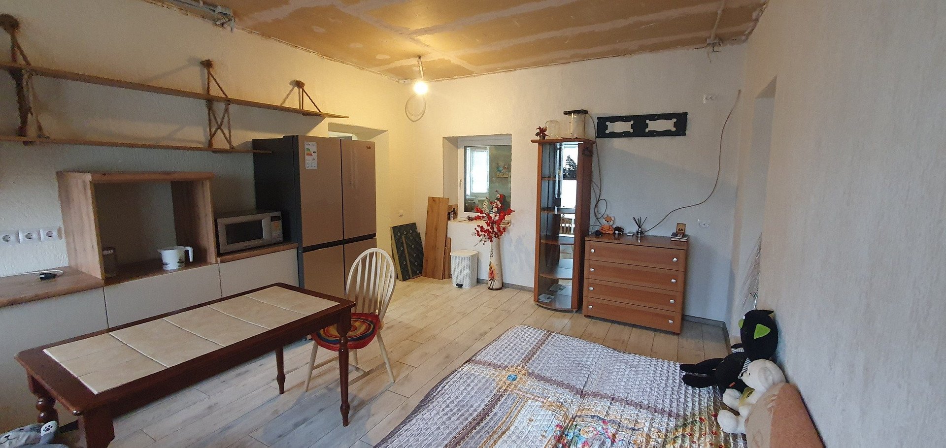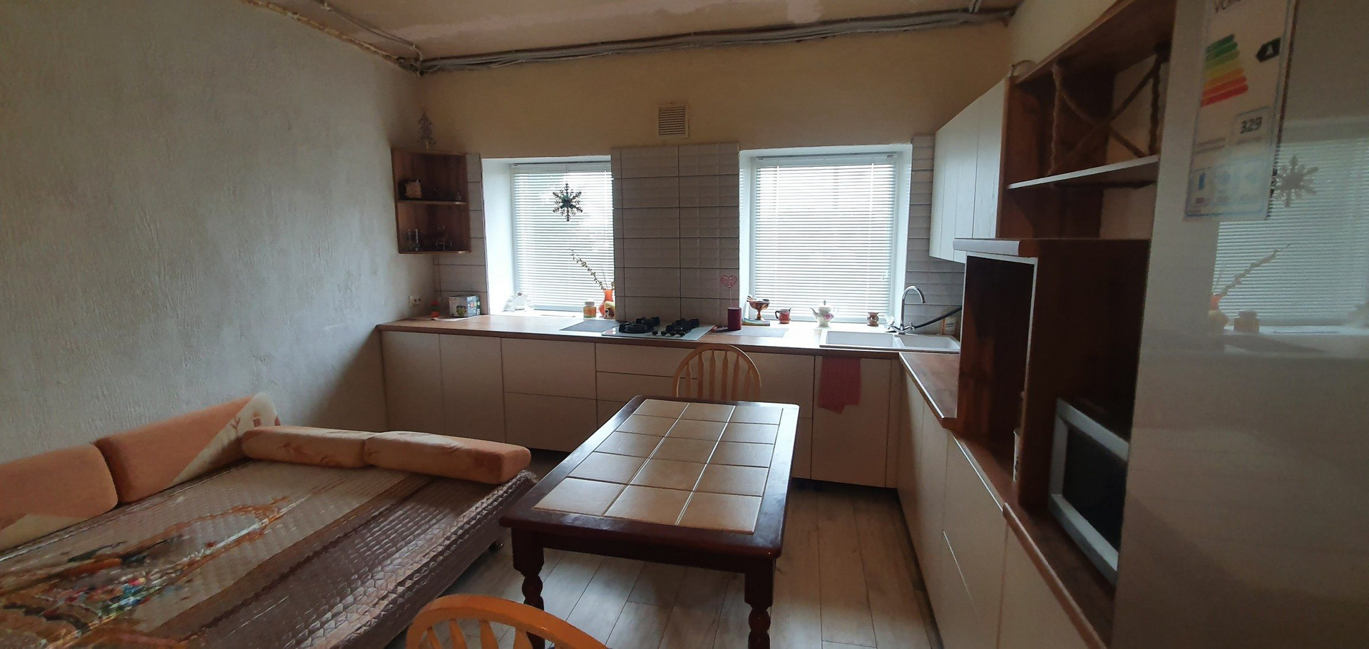 2. Жилая часть дома 70м2: кухня-столовая, комната, санузел и большой коридор-комната. В дом заведены все коммуникации.