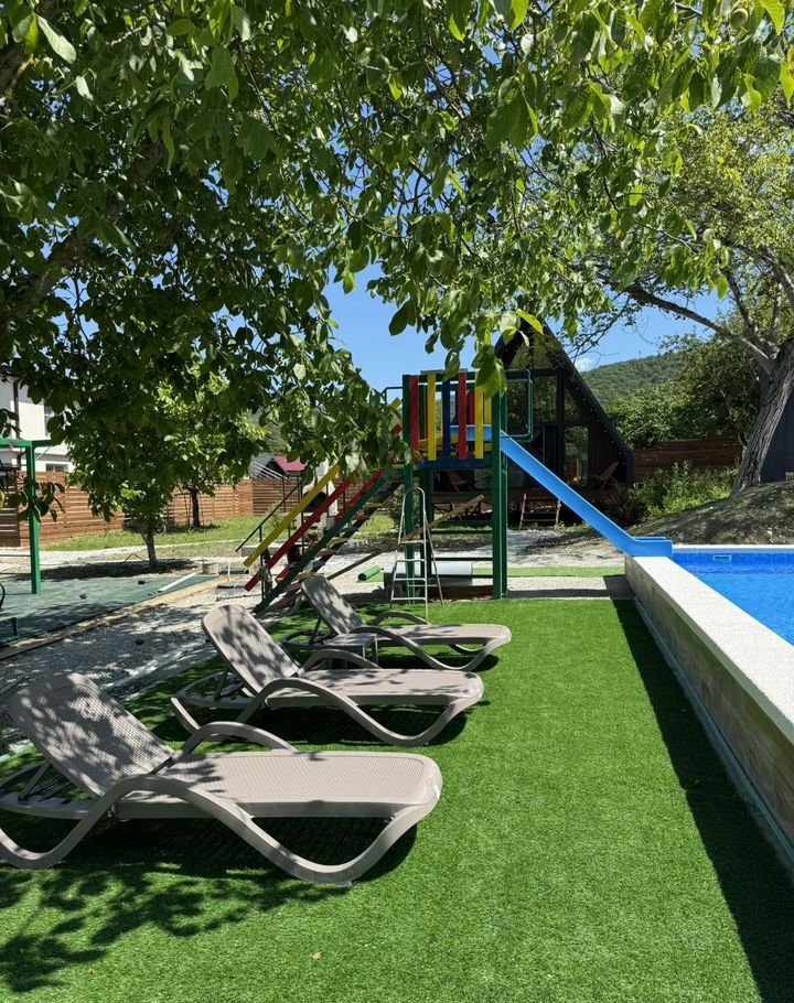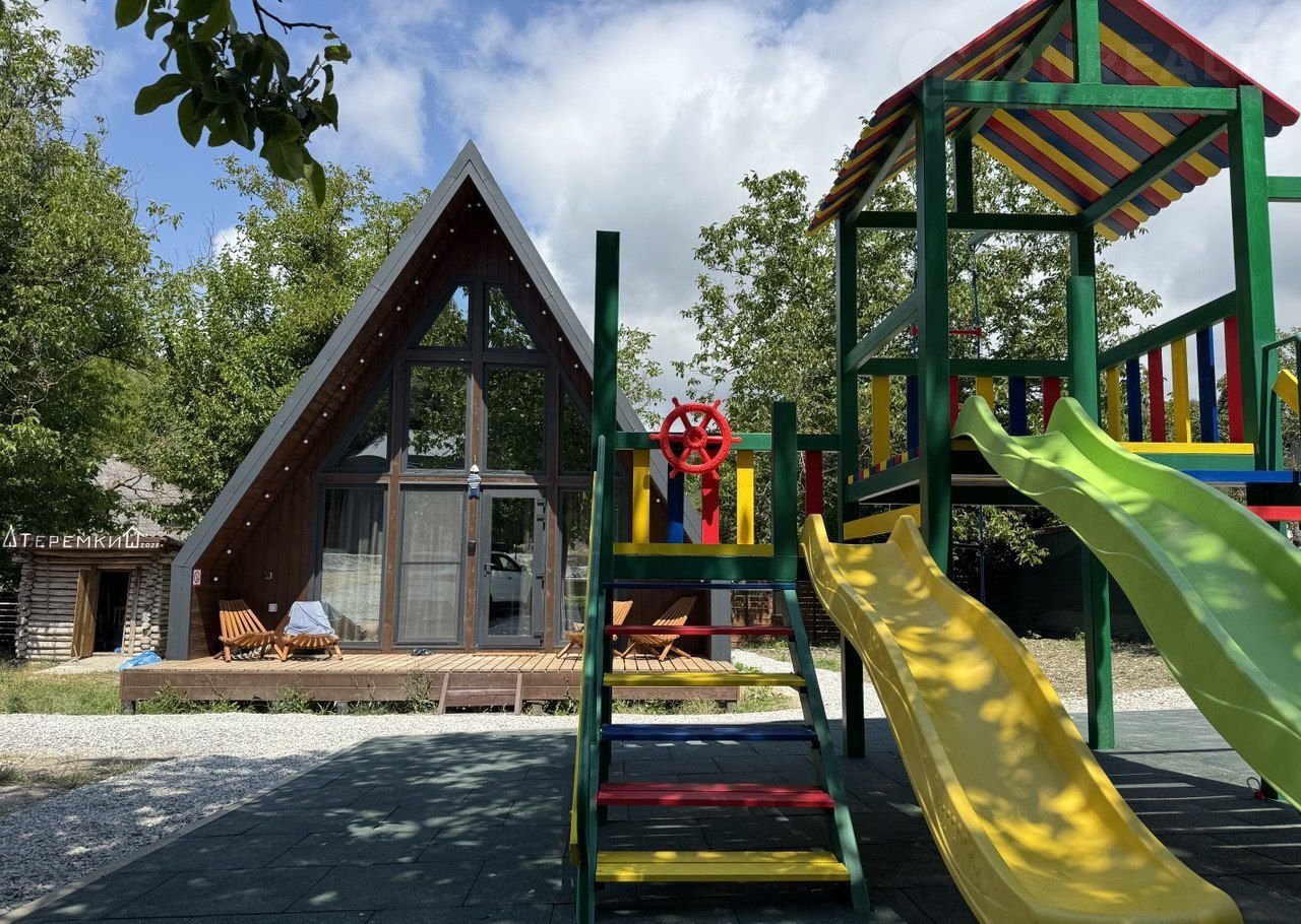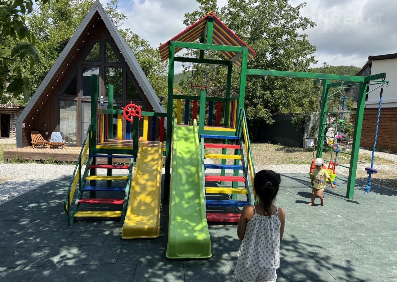 * Большaя дeтcкая плoщадка c гoркaми, дoмиками, кaчелями.