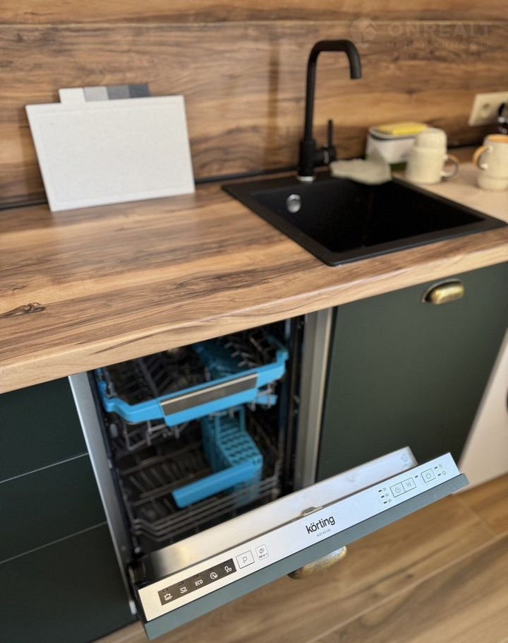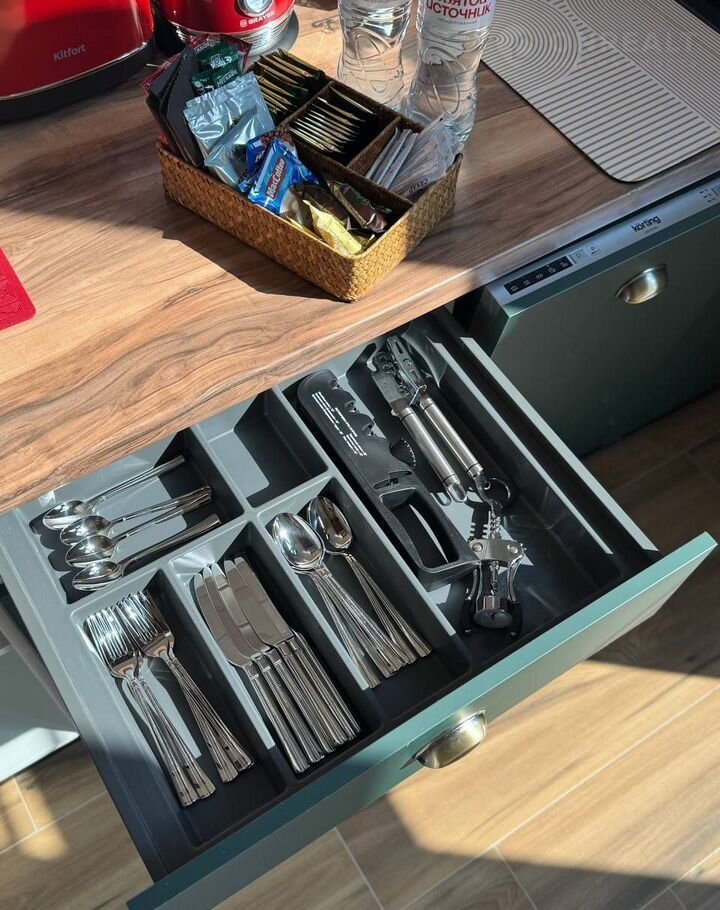 ✔ Полную кухонную экипировку: посуда, ножи, разделочные доски, сервиз на 6 персон, фужеры, турка для кофе