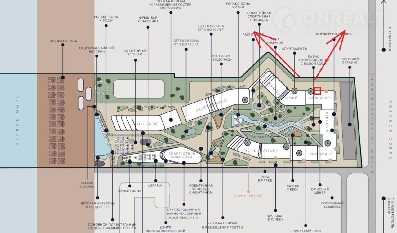 Особенностью комплекса является его расположение - ПЕРВАЯ береговая линия - один шаг до моря, в непосредственной близости от знаменитого Розового озера и Сакских лечебных грязевых лиманов, в 500 метрах от самого большого аквапарка Крыма "Банановая республика" и в 15 км от г.Евпатории с ее историко-архитектурными достопримечательностями.