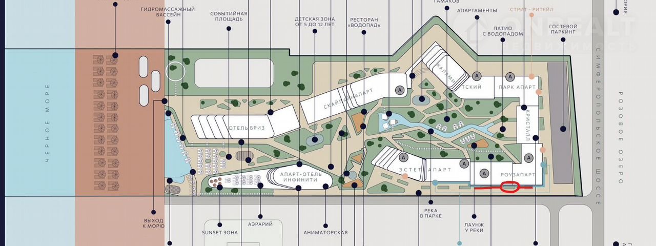 Собственный оборудованный пляж: частный понтон, зоны для комфортного отдыха. Прямой доступ к морю только для резидентов.