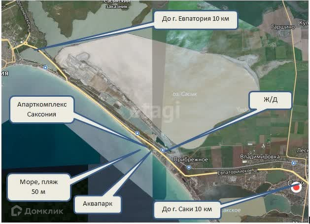 Отличная транспортная развязка: до г. Саки 10 км, до г. Евпатория 10 км. Аквапарк- 200 м. Песчаный пляж с пологим спуском - 50 м. До автобусной остановки и железнодорожной станции - 800 м.