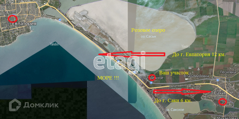 Необходимая инфраструктура в пешей доступности, хорошее автобусное и железнодорожное сообщение с городами Симферополь, Саки, Евпатория. До города Саки 6 км., до города Евпатория 12 км. Докуманты на земельный участок оформлены в РФ. Номер в базе: 5017589. Район: Прибрежное с.