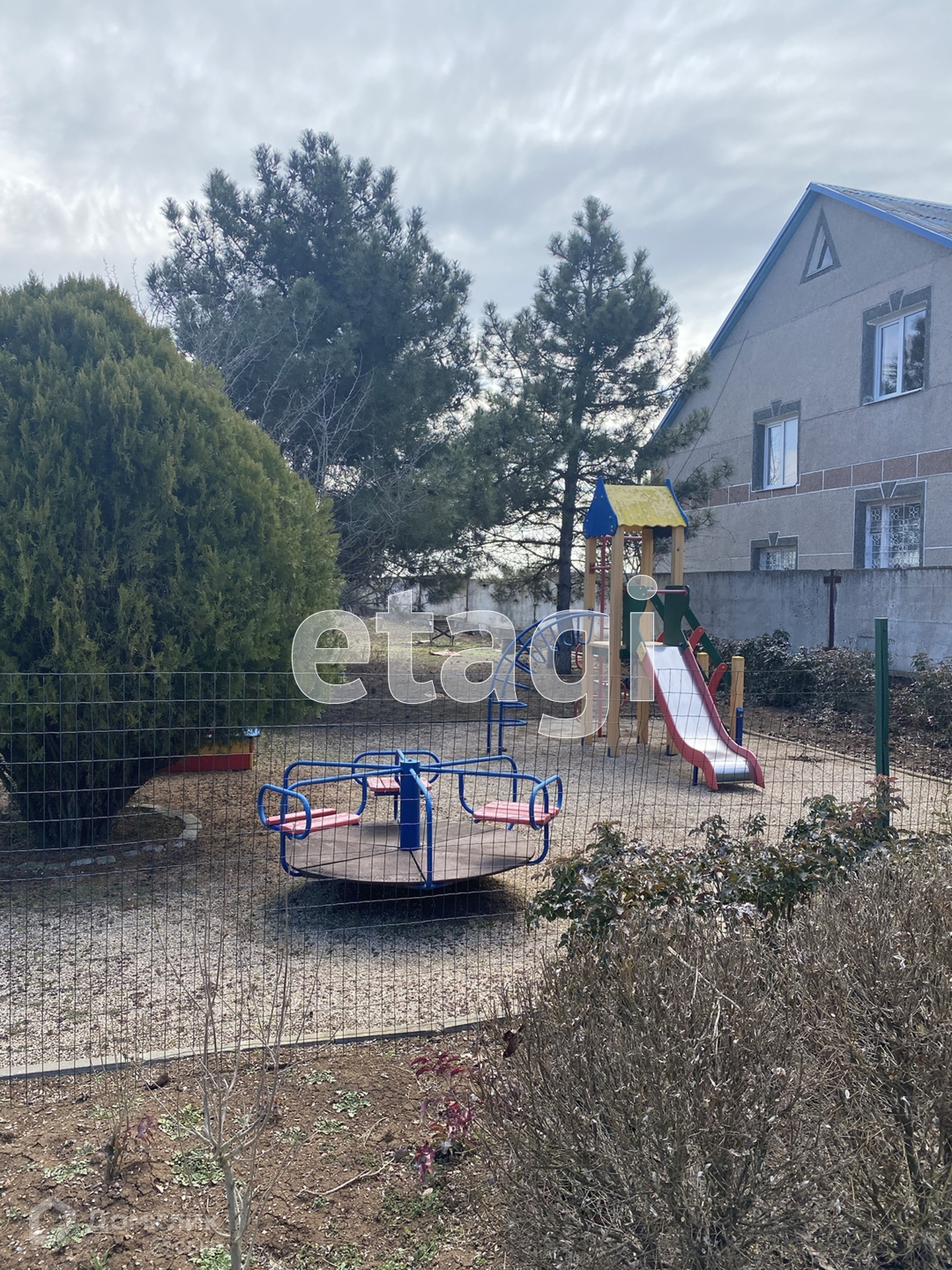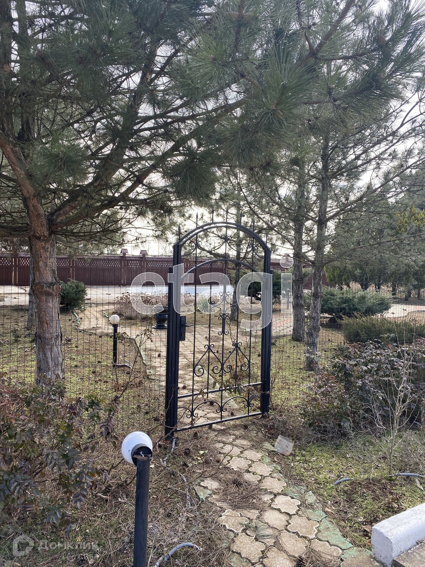 участок огорожен с одной стороны бетонным забором,а фасадная часть 3д забором с красивыми коваными калитками.