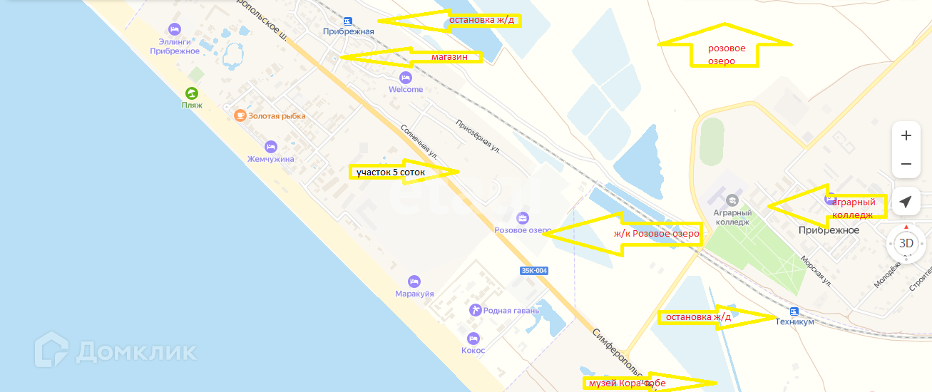Участок находится между город Евпатория и город Саки (10 километров в каждую сторону), в 500 метрах от моря. Очень удобная транспортная развязка. В шаговой доступности от аквапарка и начатого строительства жилищного комплекса Розовое озеро.
