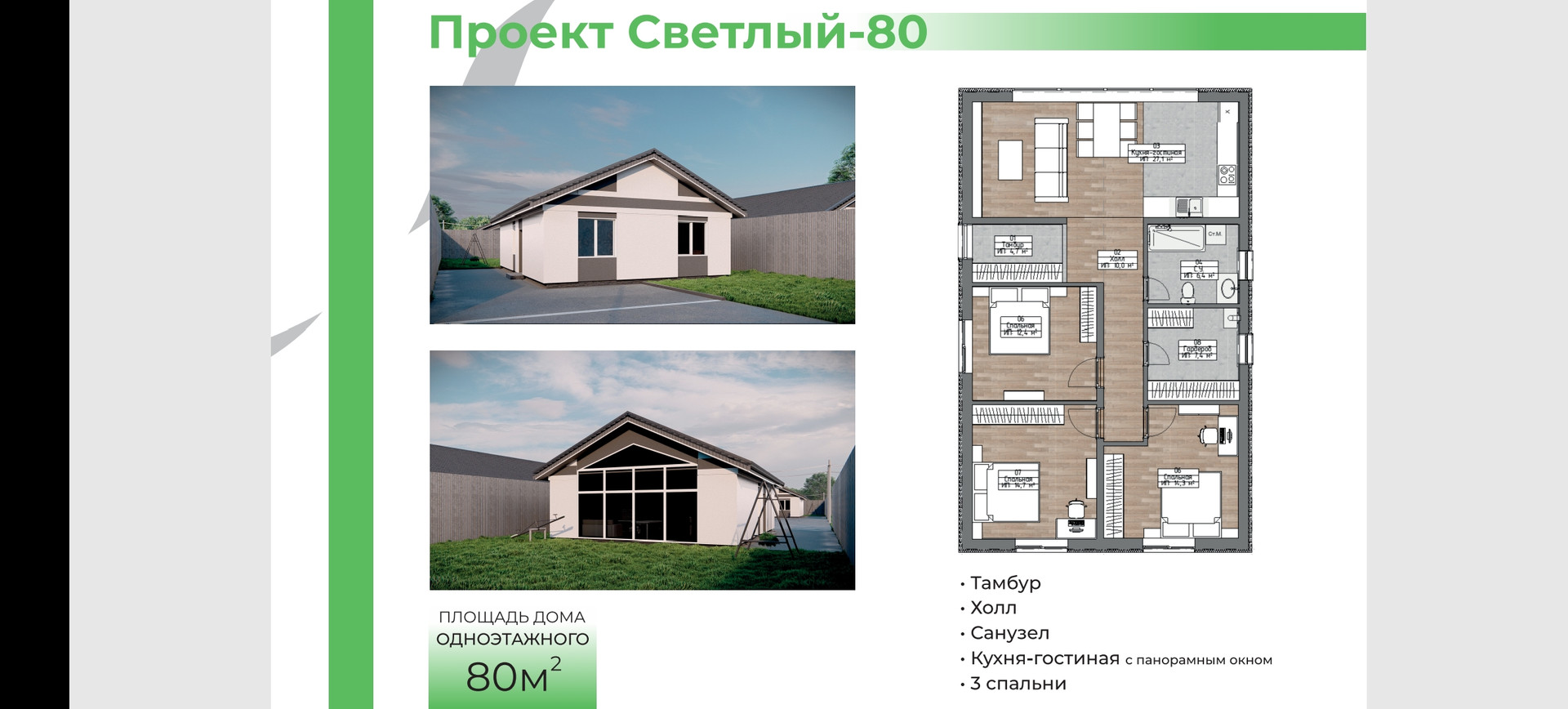 ✅ Общая площадь дома 80 кв.м. -это три отдельные спальни, две из которых около 15м2, и одна 12.4м2, совмещенный санузел 6.4м2, тамбур 4.7м2, холл 10 м2, гардероб 7.4 м2, и просторная кухня-гостиная 27 м2, все для комфортного отдыха в кругу семьи и друзей.