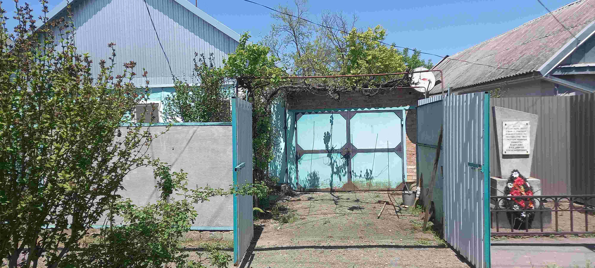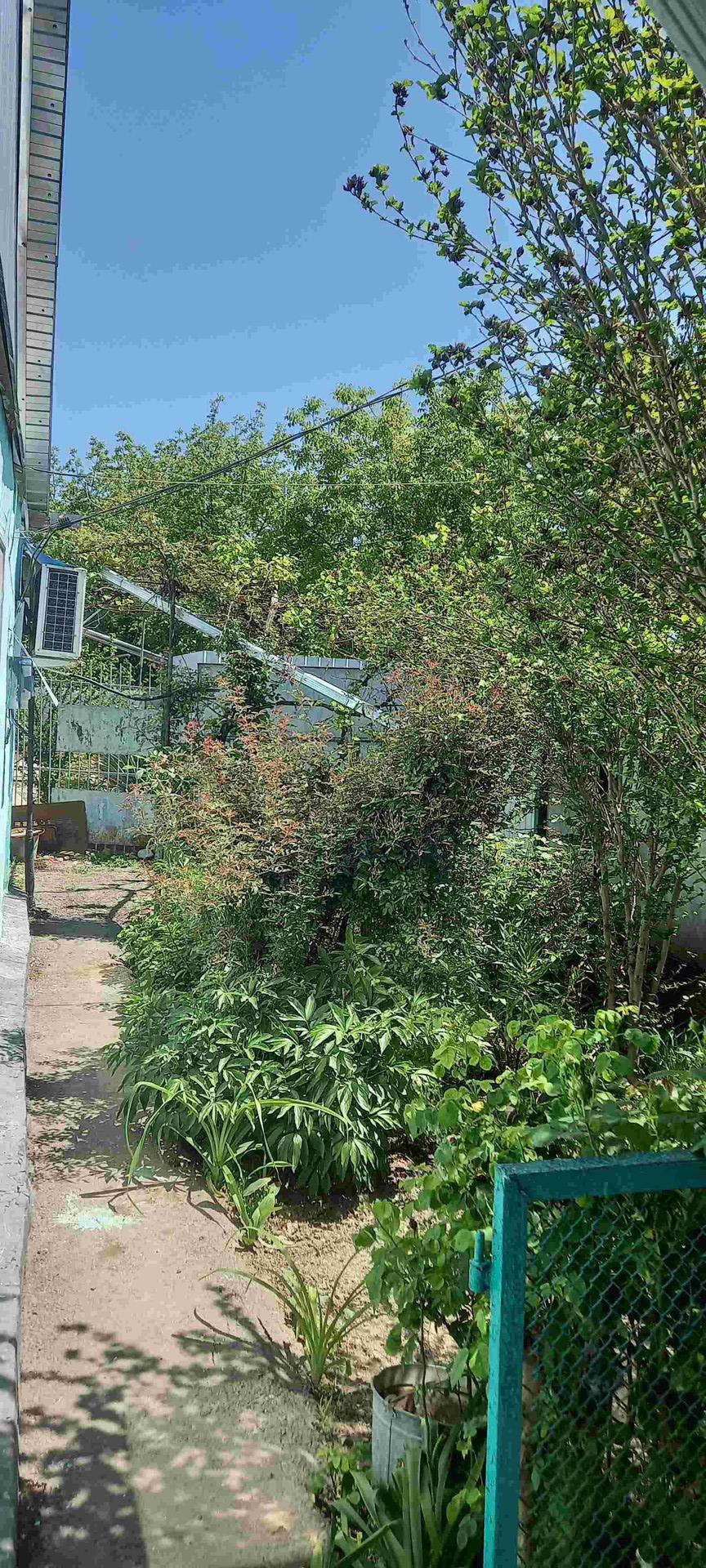 Большой огород с разными плодовыми деревьями, кустарниками и цветами.