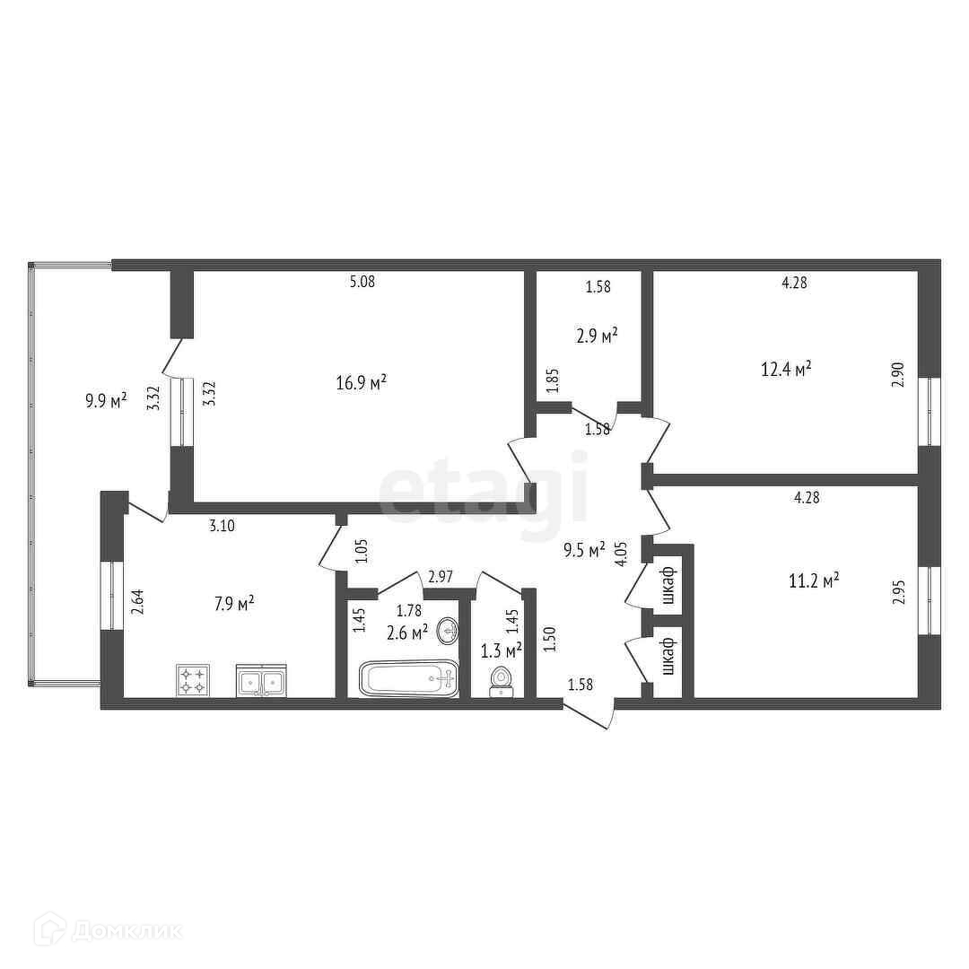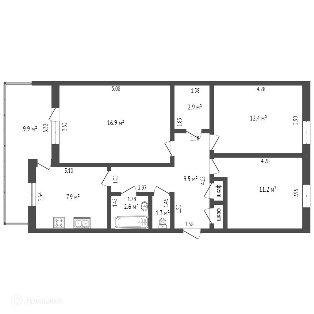 Комнаты раздельные: гостиная 16,9 кв.м с выходом на балкон с уширением 9,9 кв.м и две спальни 12,4 и 11,2 кв. м.