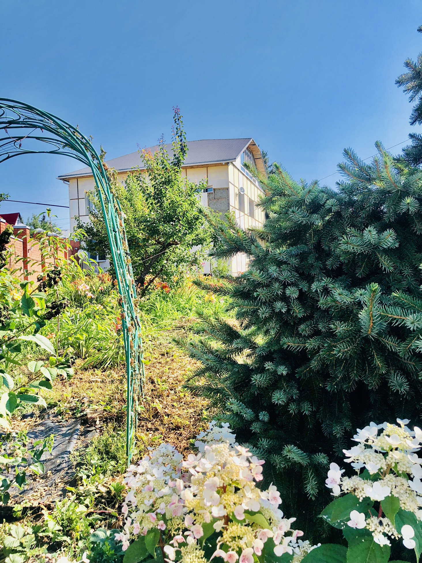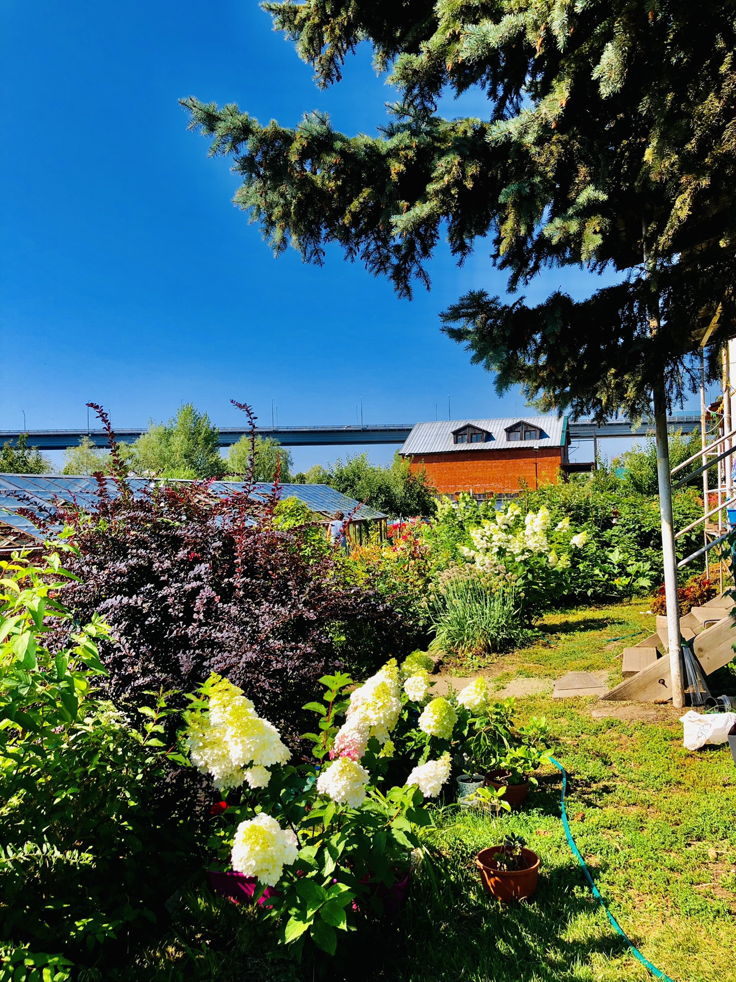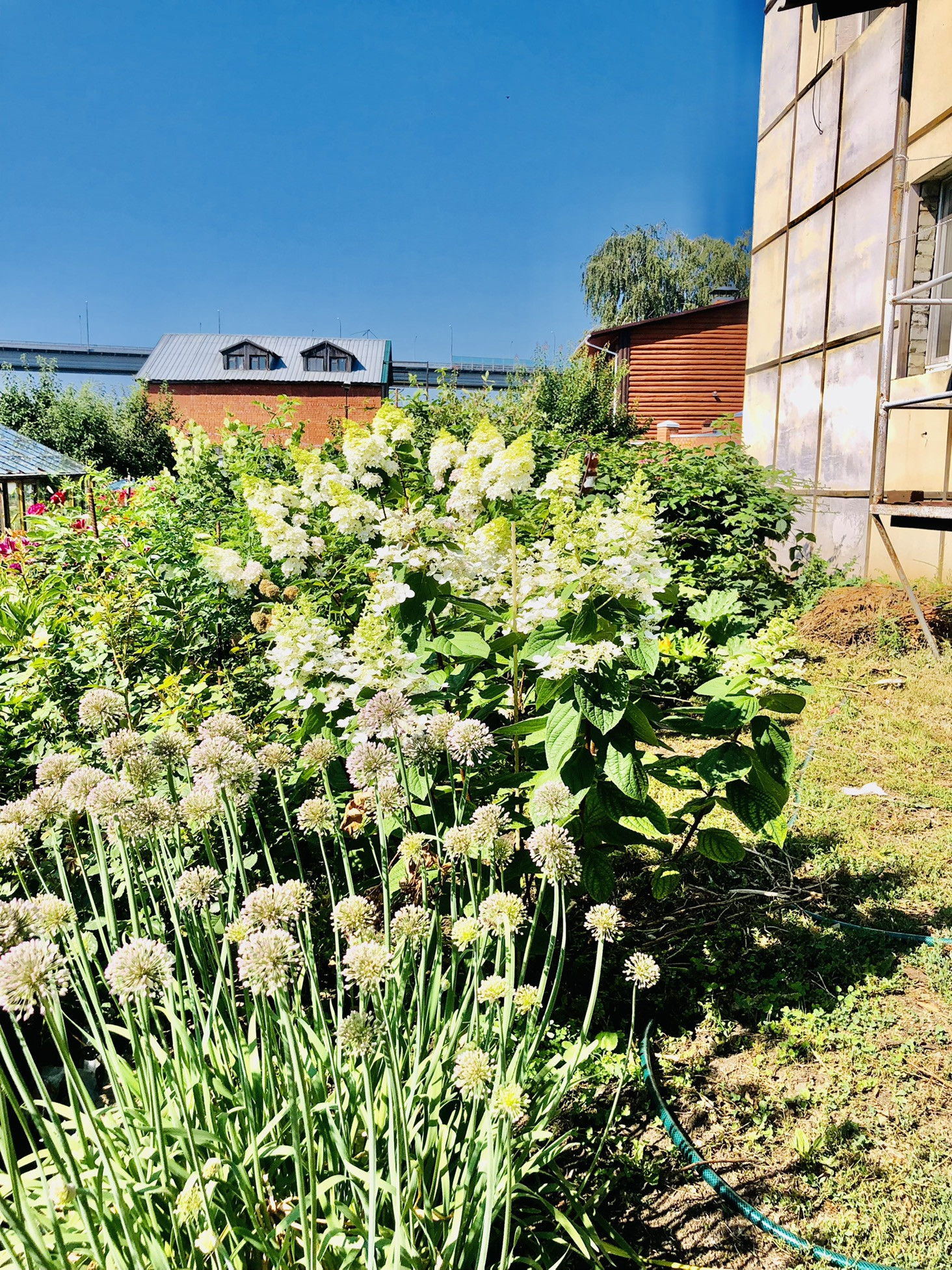 Много цветов и деревьев.