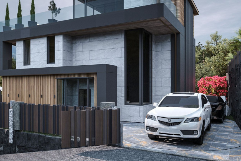 Паркинг на 2 автомобиля, архитектурная подсветка, зелёный двор,